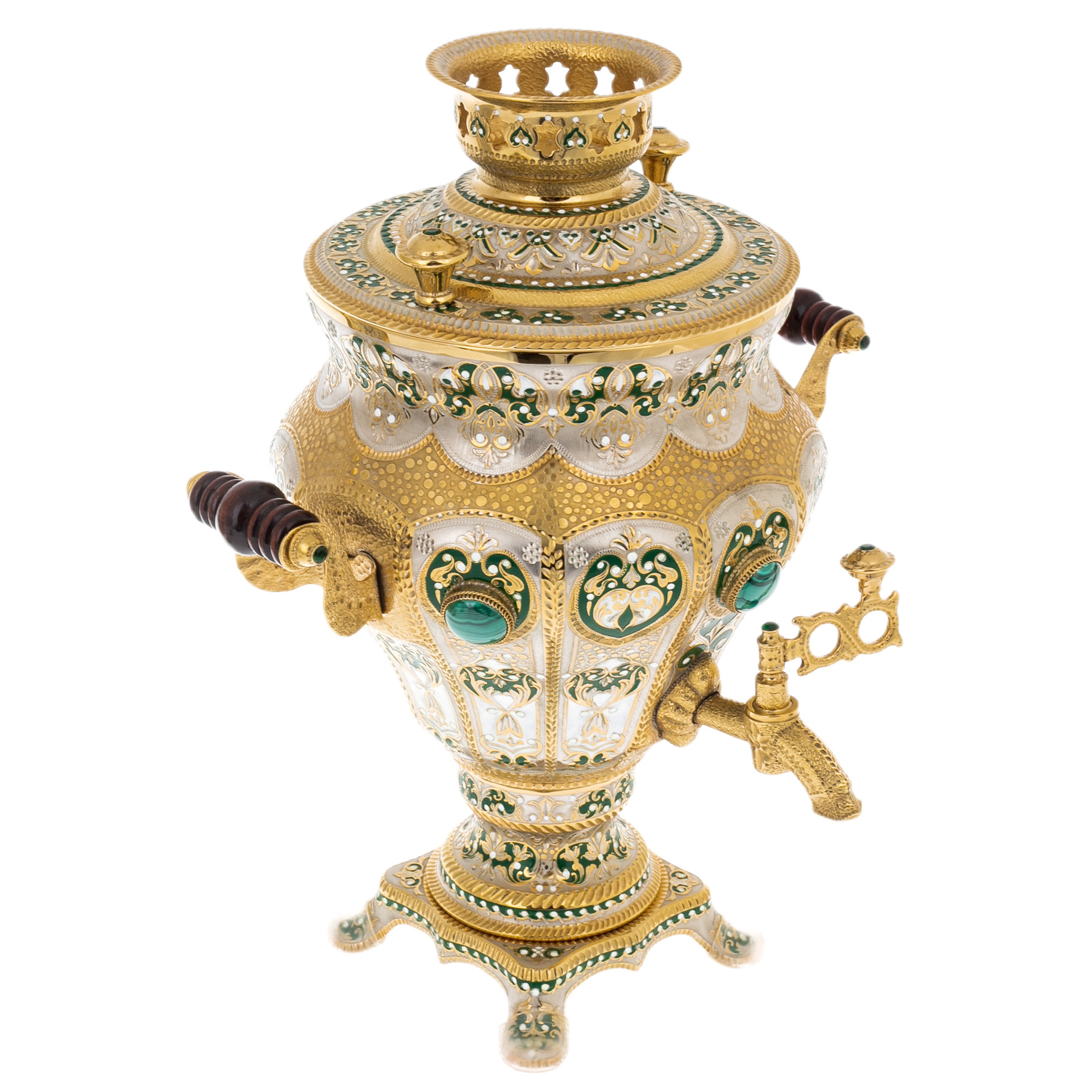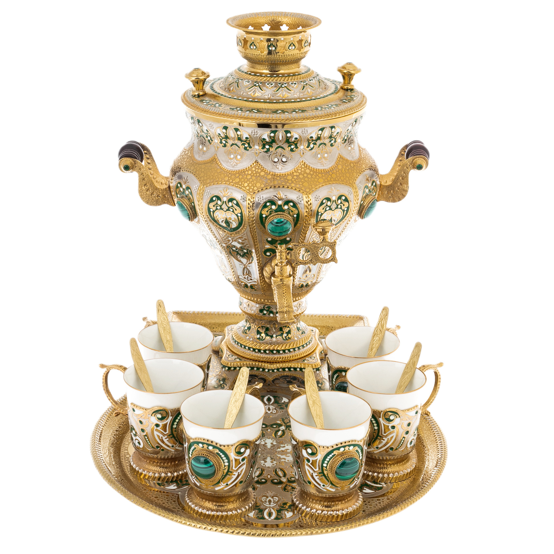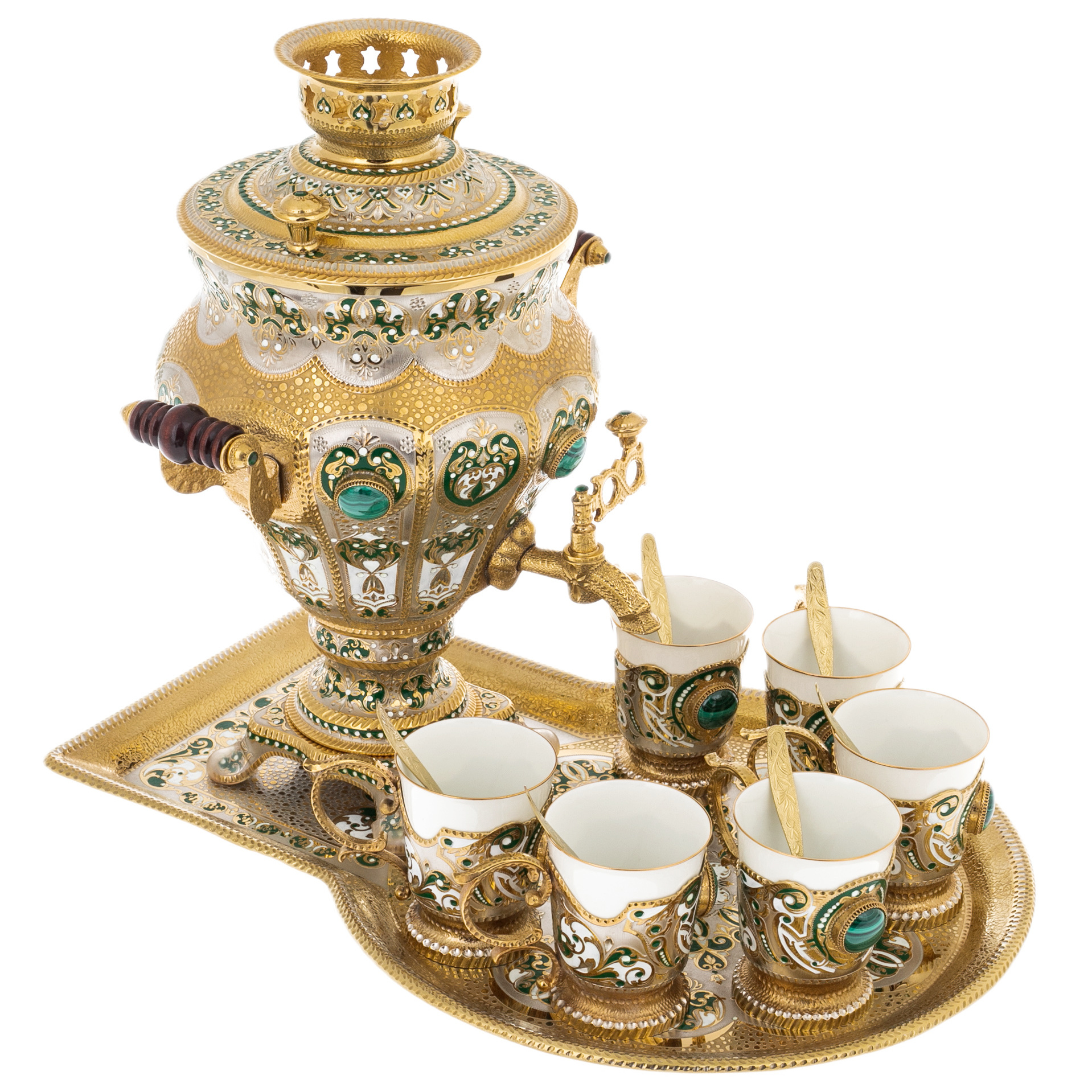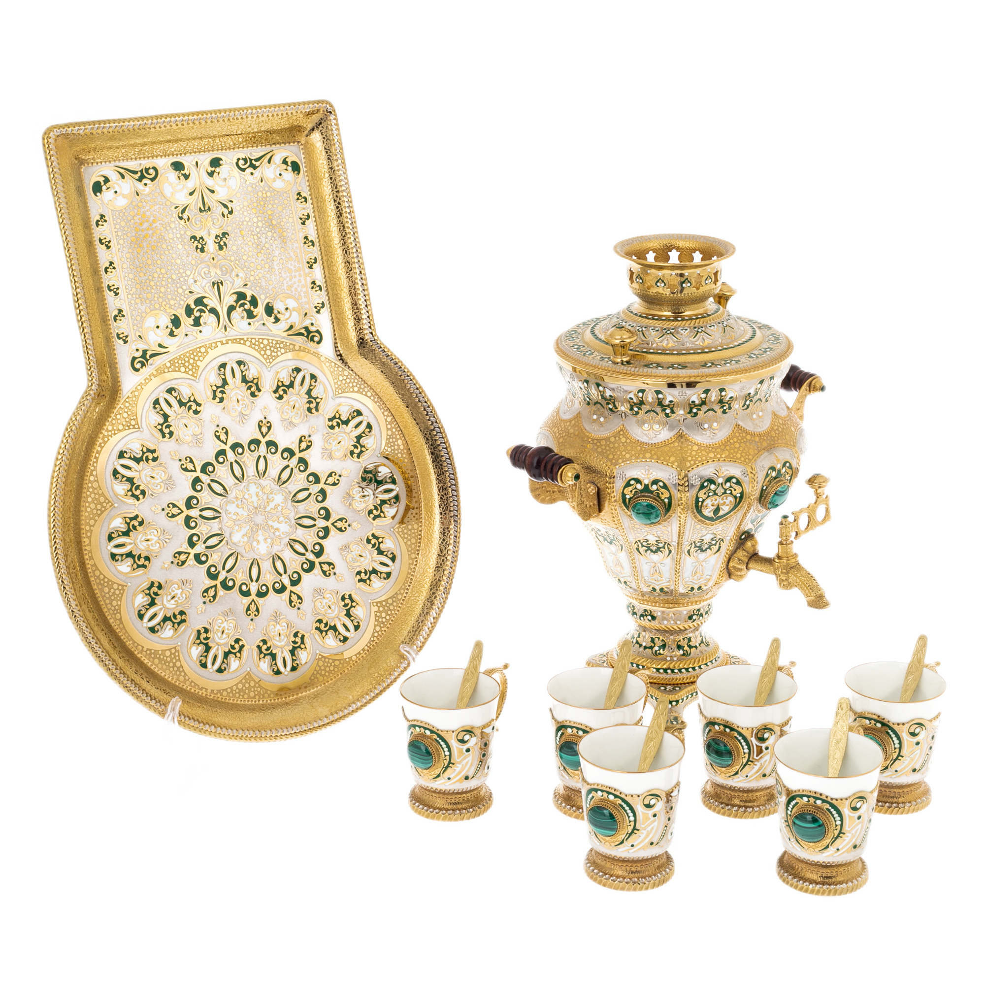 Комплектация: самовар, блюдо, 6 чашек, 6 ложечек.
