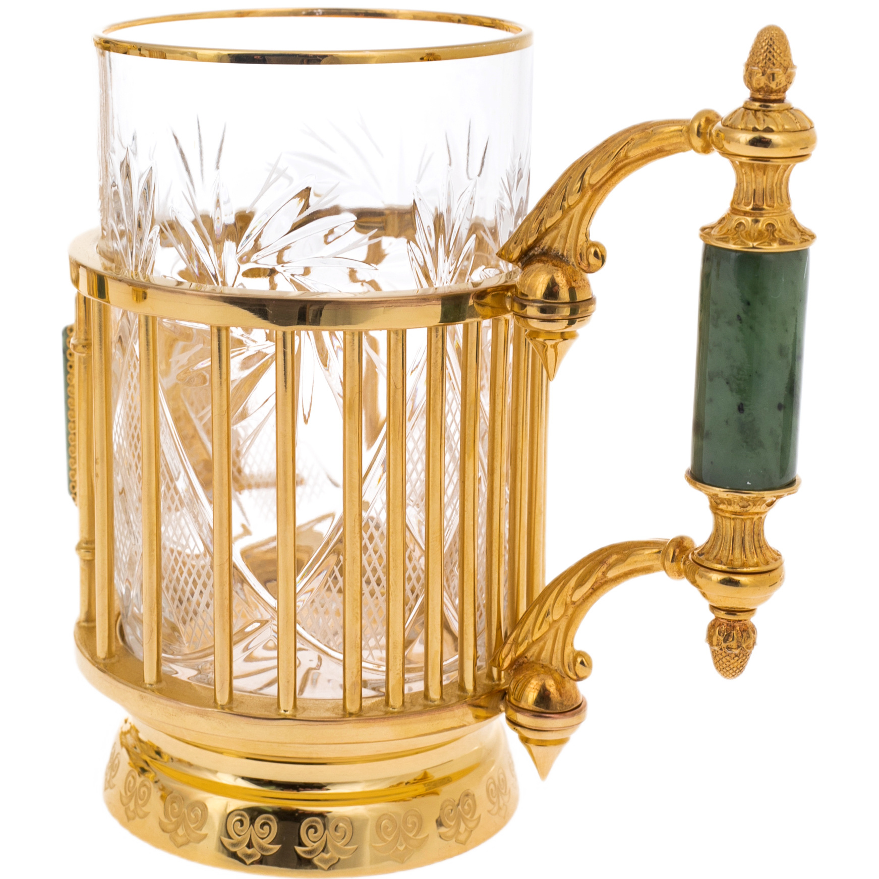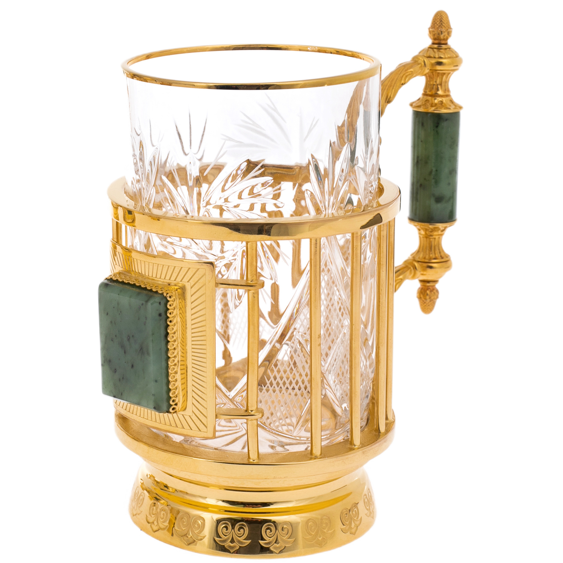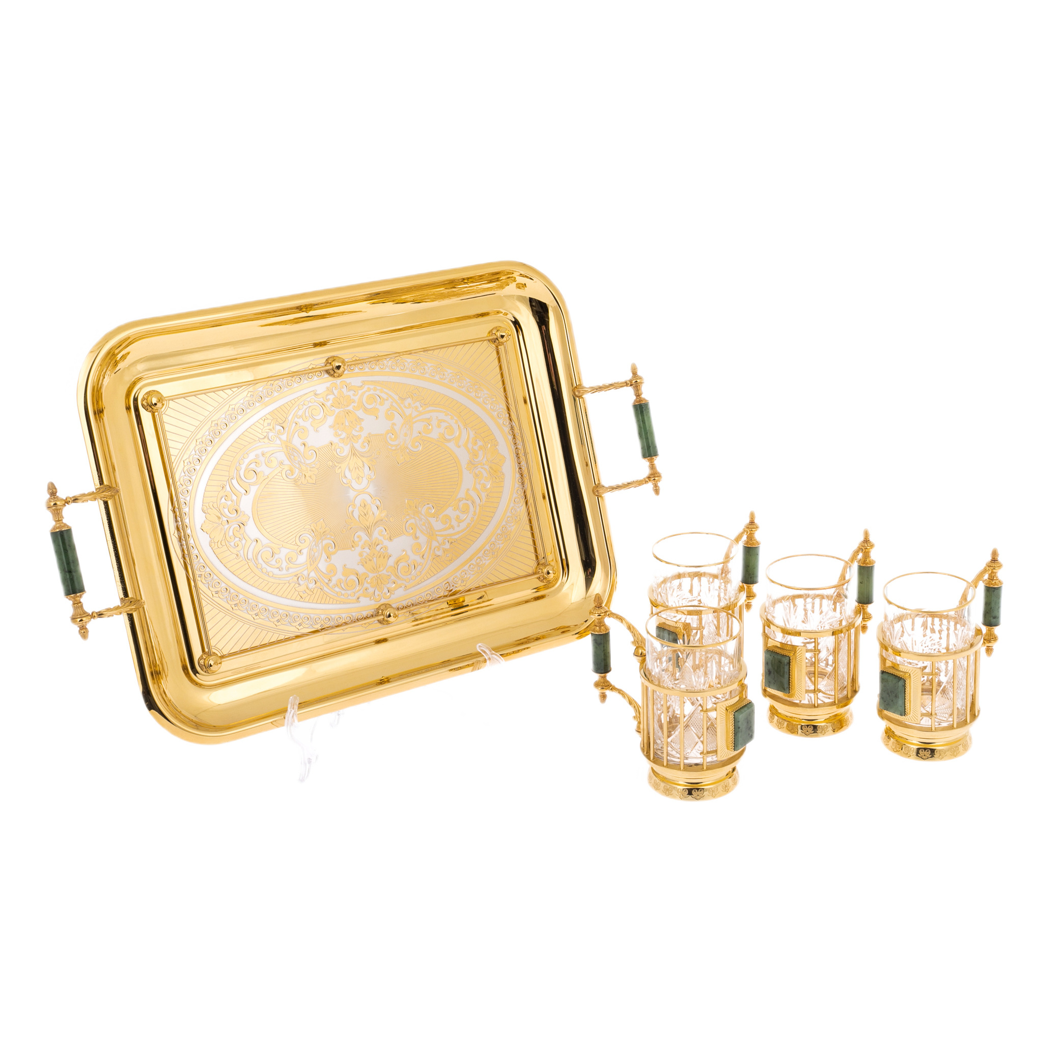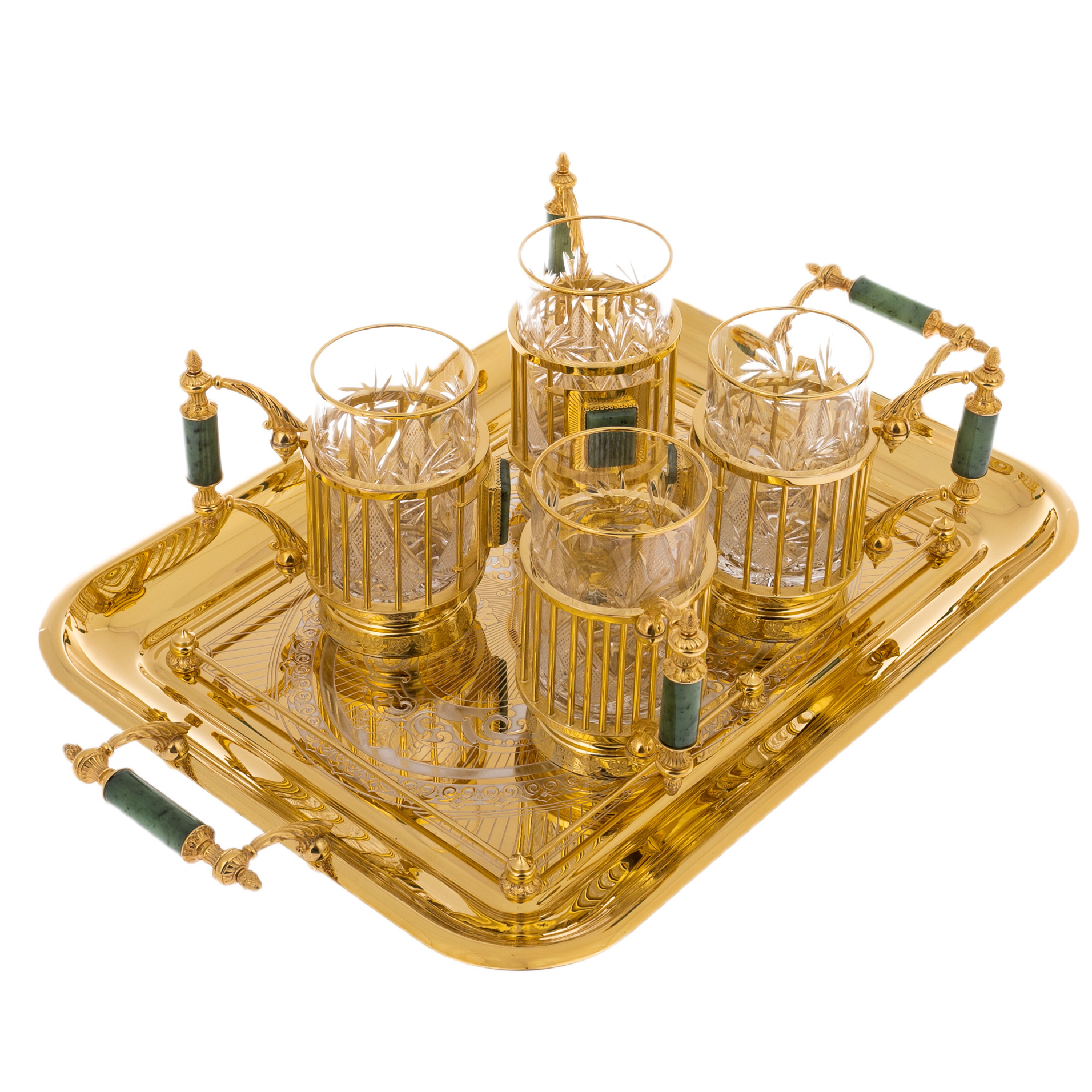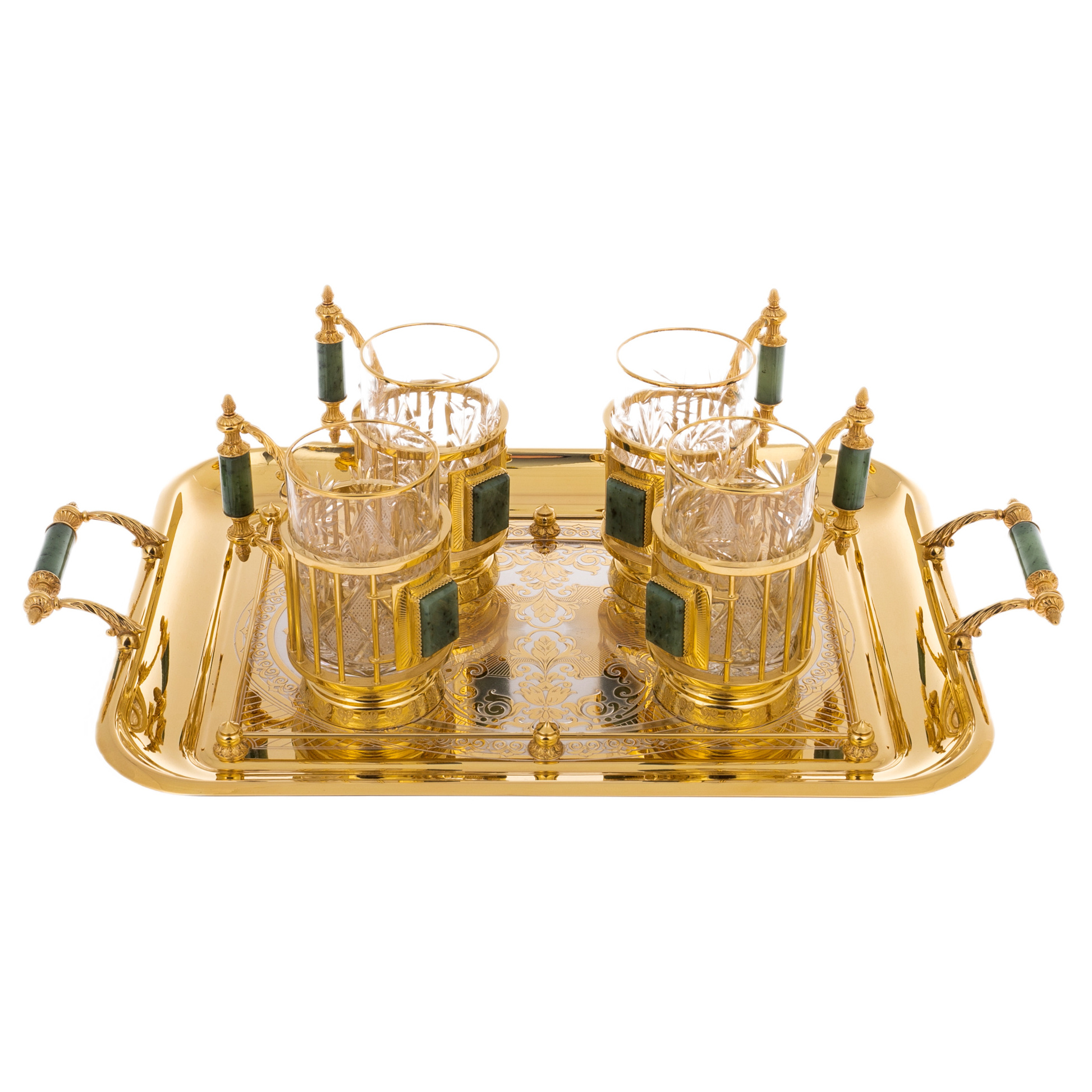 На сверкающем подносе из полированной латуни, украшенном филигранной гравировкой и золотым покрытием, располагаются четыре изысканных подстаканника, подобно колоннам, поддерживающим своды величественного дворца. Золото, отлитое в строгие решетчатые линии, создаёт иллюзию величия и прочности, символизируя стабильность и успех. Украшенные нефритовыми вставками, ручки подстаканников вызывают восхищение своим глубоким зелёным оттенком, будто перенося в первозданные горные долины, где камень веками впитывал мудрость природы.