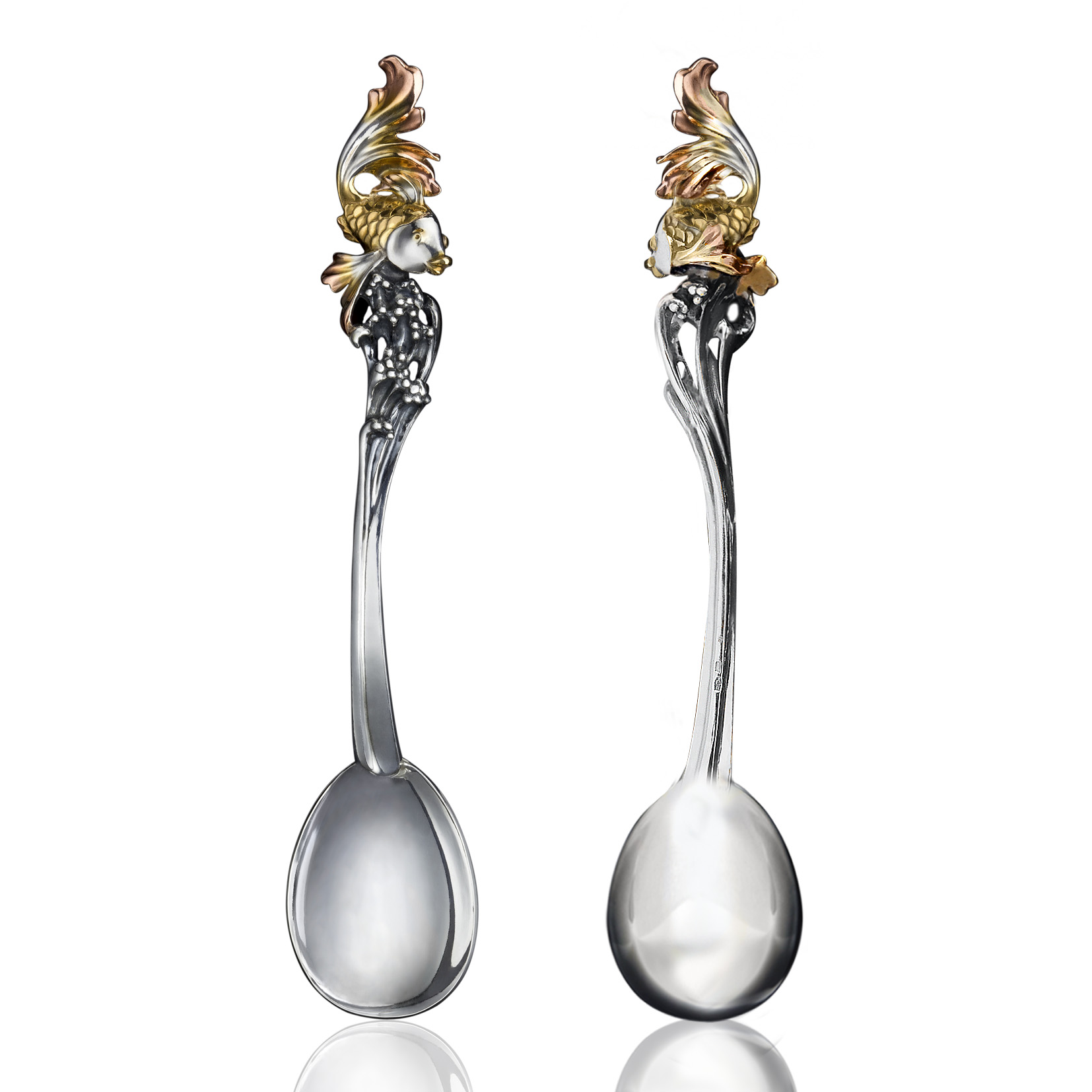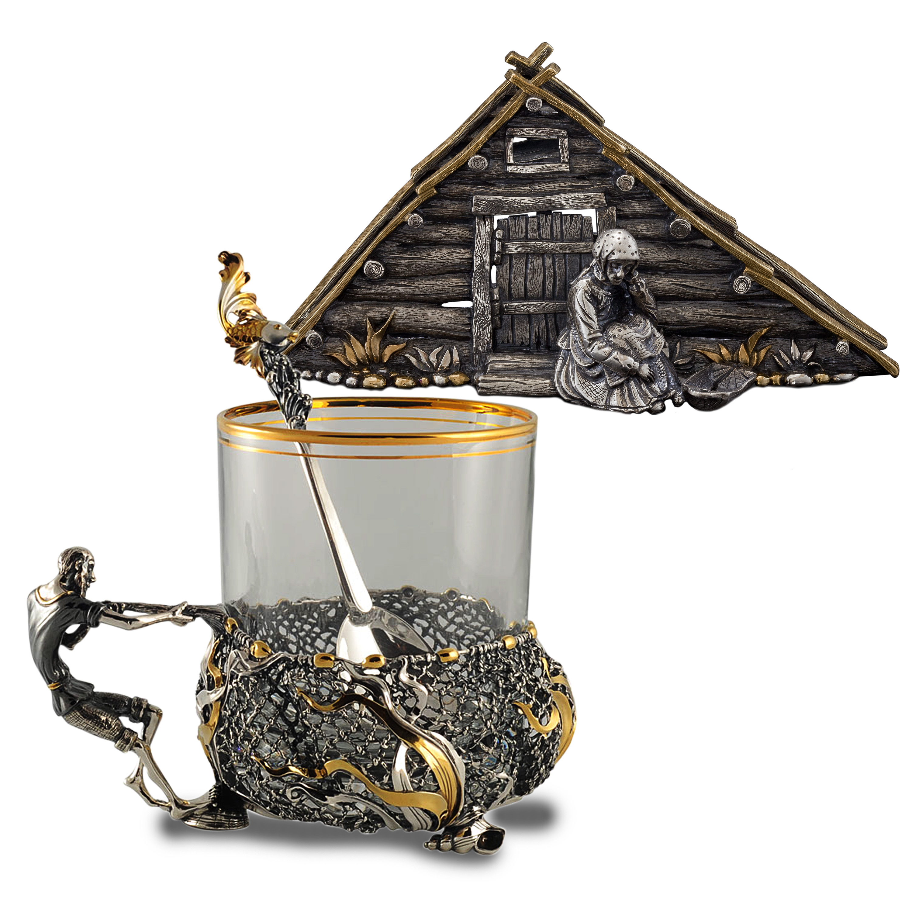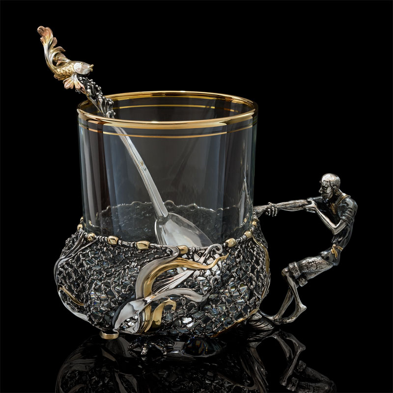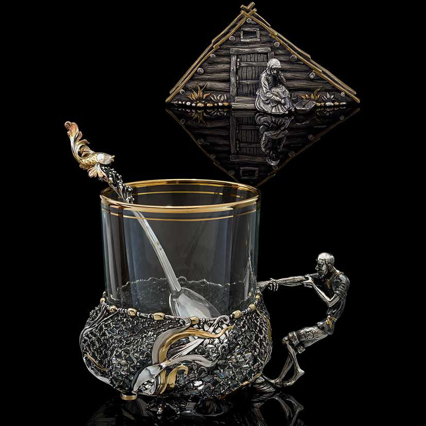 Коллекция из серебра "Золотая рыбка" с подстаканником, ложкой и салфетницей