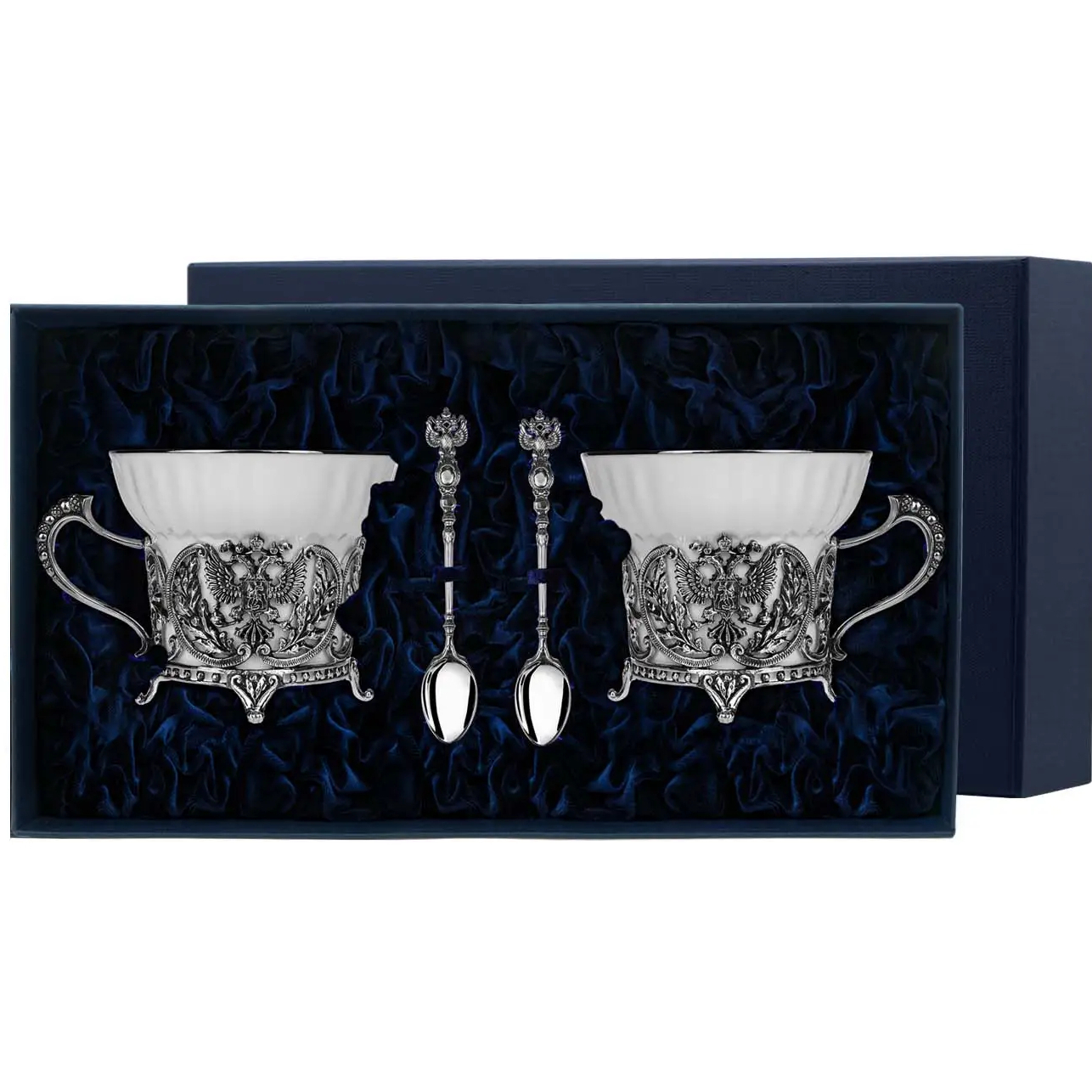 Комплектация:2 чайные чашки, 2 чайные ложки, футляр.