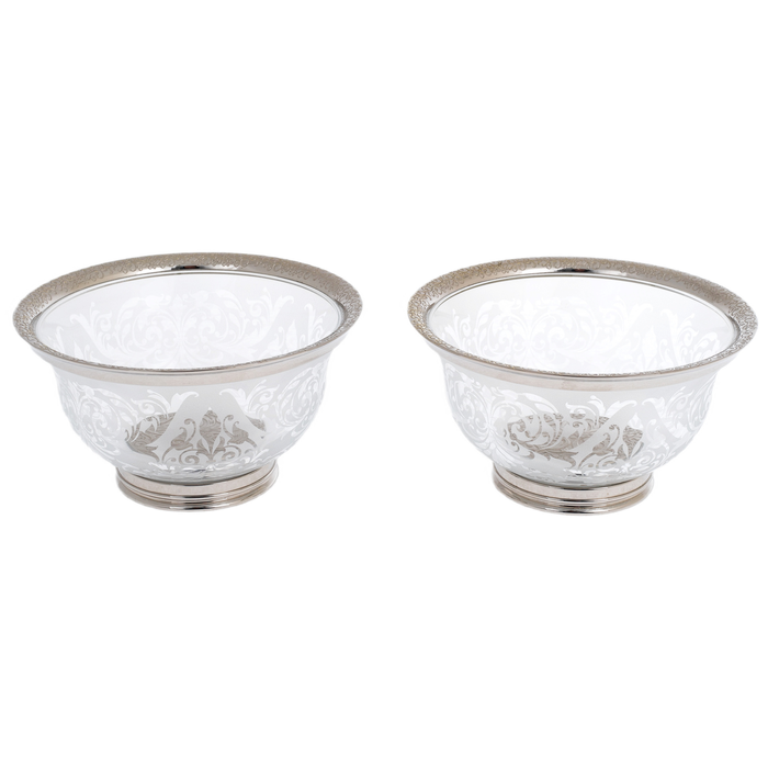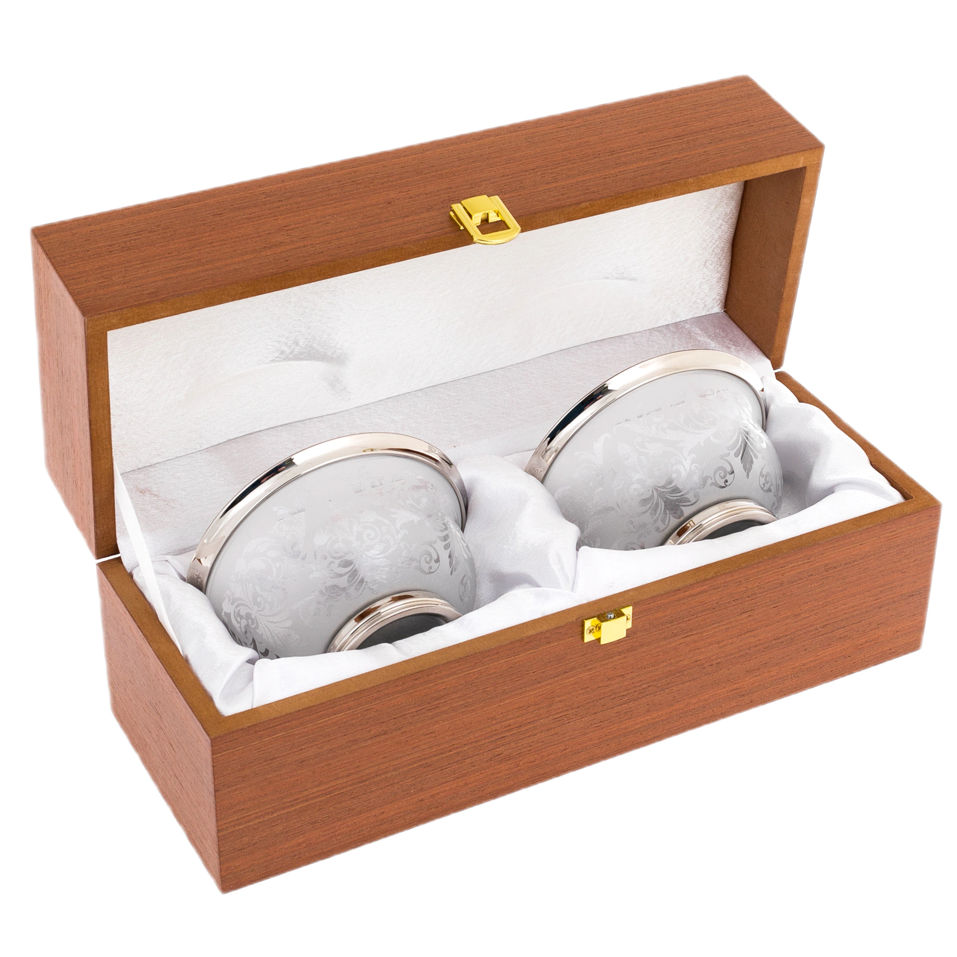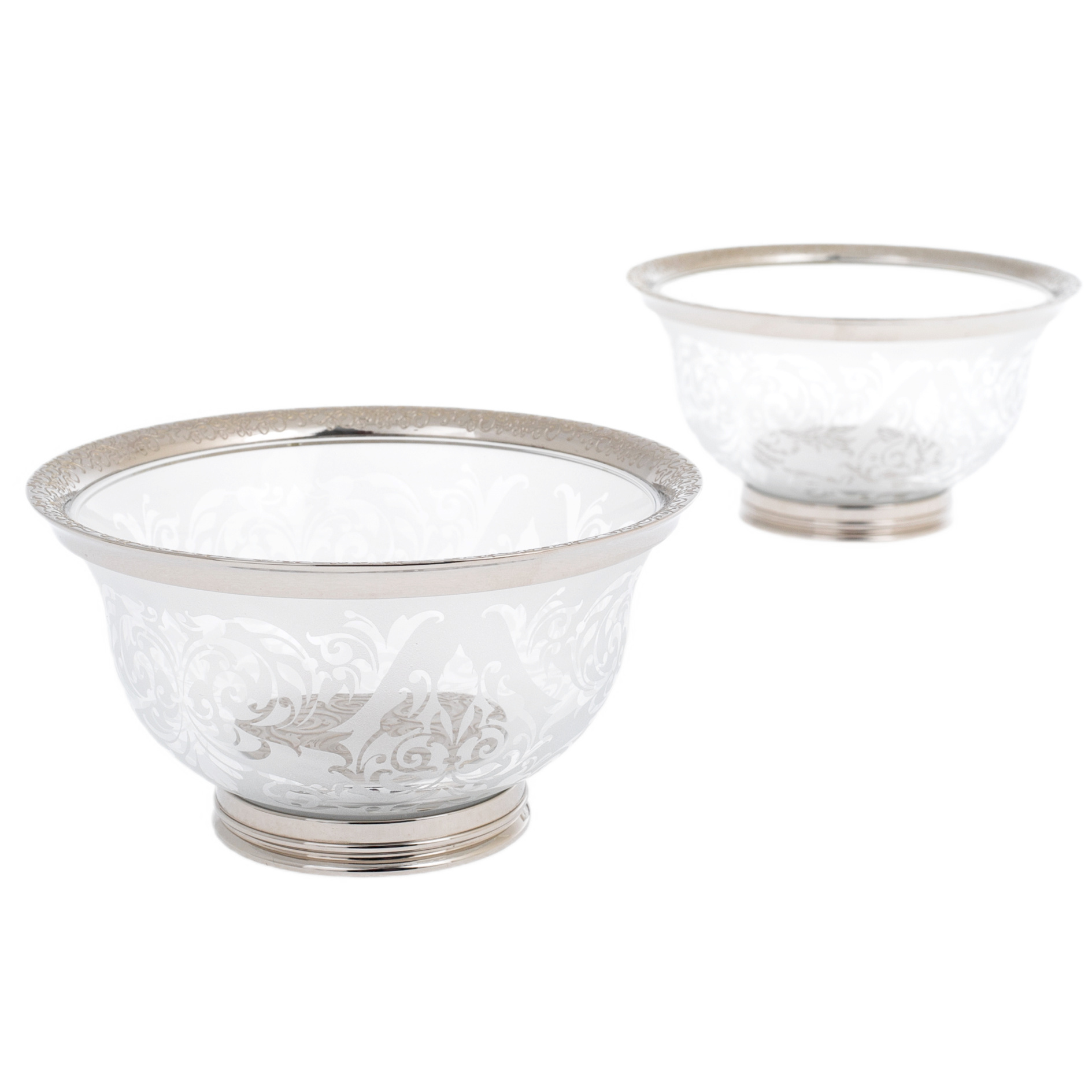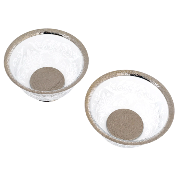Пиалы «Узорные» на 2 персоны — элегантный комплект, созданный для подачи напитков и десертов в изысканной, сдержанной манере. Чаши выполнены из прозрачного стекла с матовым орнаментом, образующим сложный растительный рисунок, плавно опоясывающий поверхность. Форма пиал раскрывается мягкой линией, обеспечивая удобство использования и визуальную лёгкость, а основание дополнено металлической оправой, придающей композиции устойчивость и завершённость.