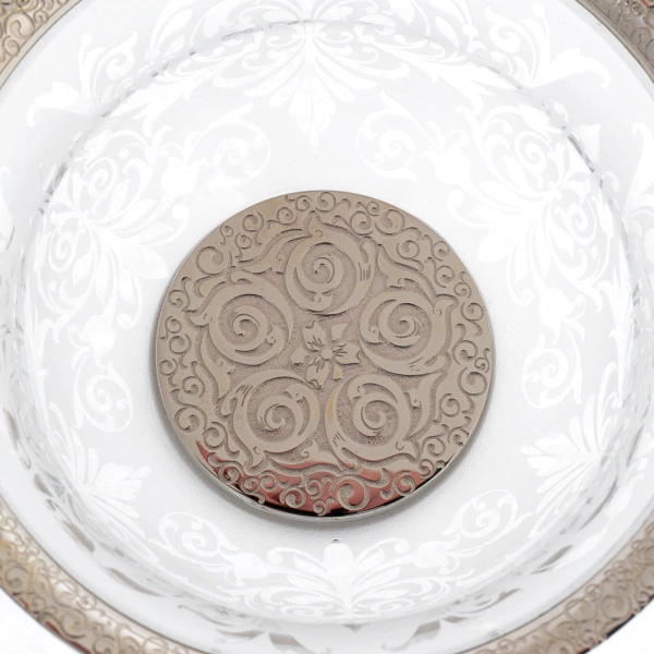 Декор выполнен с применением тонкой гравировки по стеклу, благодаря чему узор выглядит воздушным и одновременно чётким. Металлические элементы обработаны с аккуратной полировкой, создающей деликатный блеск и подчёркивающей чистоту линий. Сочетание прозрачной фактуры стекла и благородного металлического обрамления формирует гармоничный баланс между декоративностью и функциональностью.