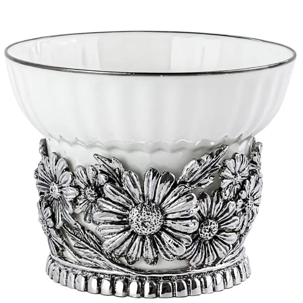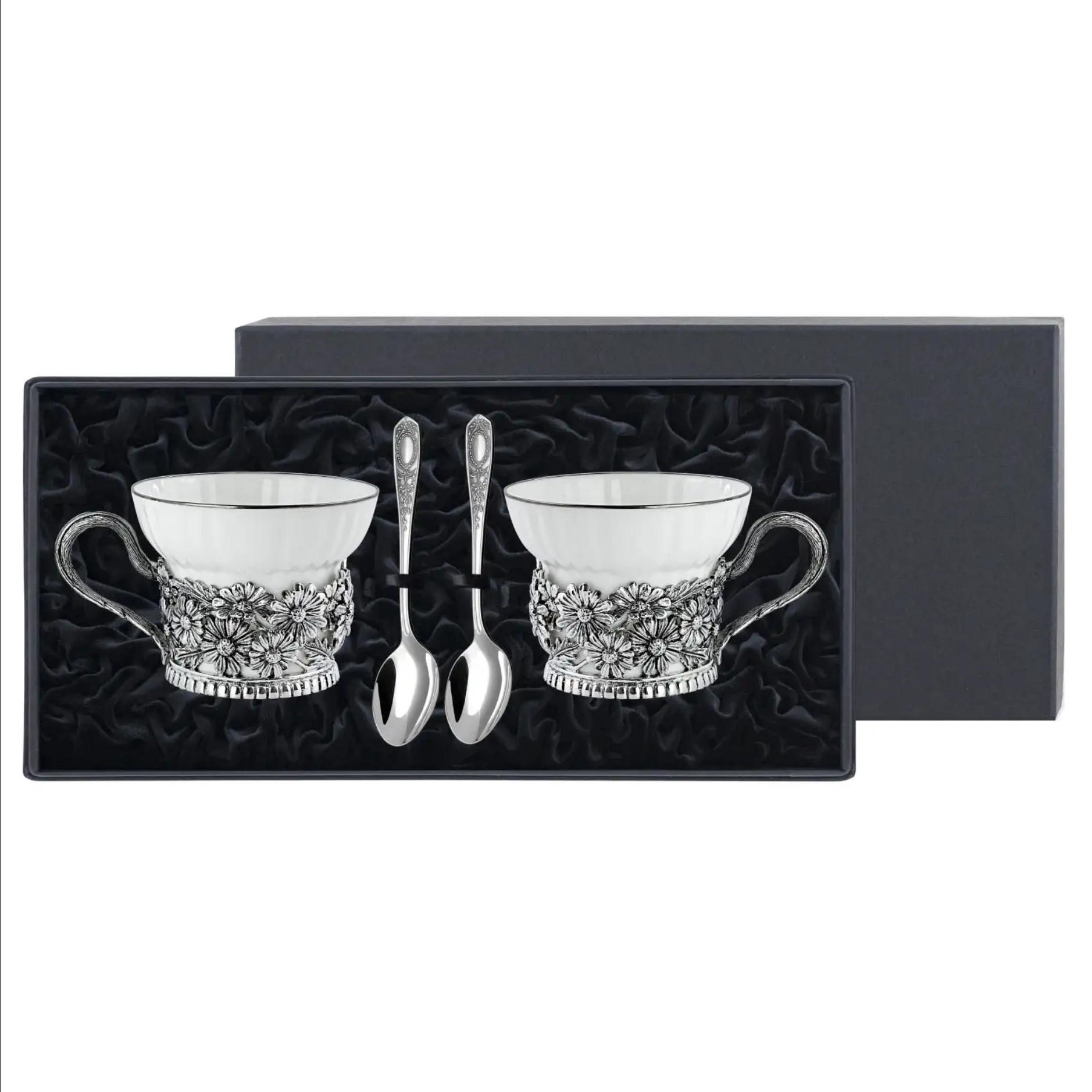Посеребренный набор чайных чашек "Ромашки": ложка, чашка, с чернением, на 2 персоны
