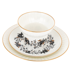 По верху а также по борту чашки изображены мелкие черные цветочки на тонких веточках с маленькими черными и золотистыми листочками.