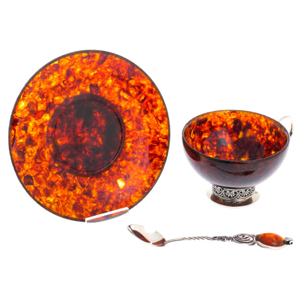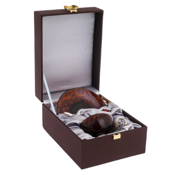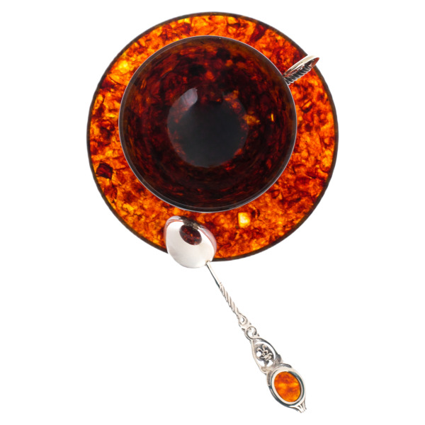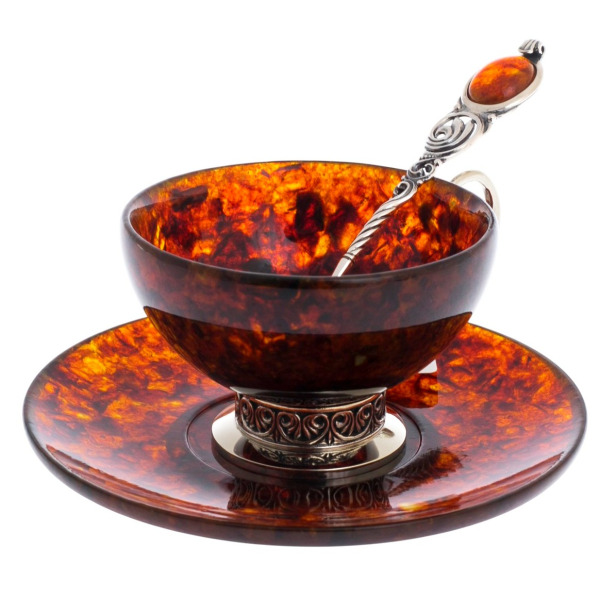Чаша из янтаря пленяет своим магическим свечением. Каждый перелив цвета, каждое пятно тёмного янтаря — уникальный рисунок, сотканный самой природой. Тонкие стенки создают впечатление лёгкости, но в то же время передают тепло напитка, усиливая его аромат и раскрывая богатство вкусовых оттенков. Блюдце, повторяющее узор чаши — словно озеро янтаря, отражающее солнечные лучи.