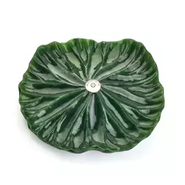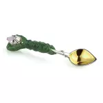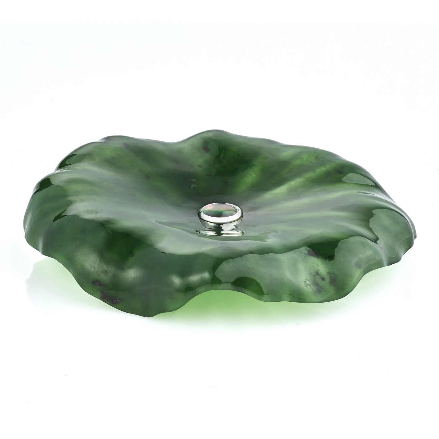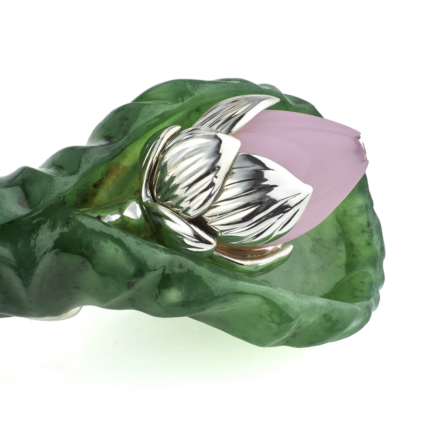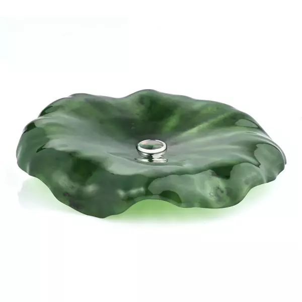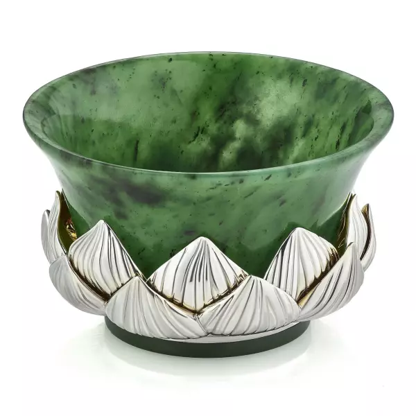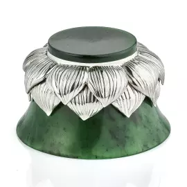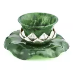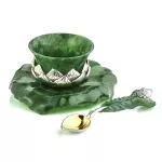 Чайный набор из нефрита и серебра «Лотос» представляет собой изысканную композицию, в которой природная пластика камня соединена с ювелирной точностью исполнения и глубокой символикой. В состав набора входят пиала, блюдце и ложка, объединённые единым художественным замыслом: формы листьев, бутонов и раскрытого цветка лотоса. Пиала выполнена из натурального зелёного нефрита с мягкой живой текстурой, дополненной орнаментом из серебряных лепестков с родированием, сохраняющим благородный блеск металла. Блюдце, повторяющее очертания листа лотоса, изготовлено из нефрита и украшено перламутровой вставкой в центре, напоминающей каплю утренней росы. Ложка выполнена из серебра 925 пробы с золочением чаши и декоративной ручкой в виде изогнутого нефритового листа, завершённого бутоном лотоса с вставкой из розового кварца.