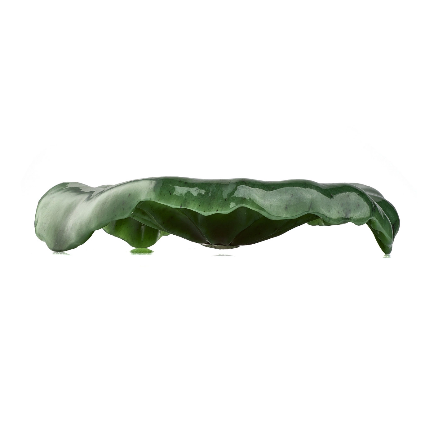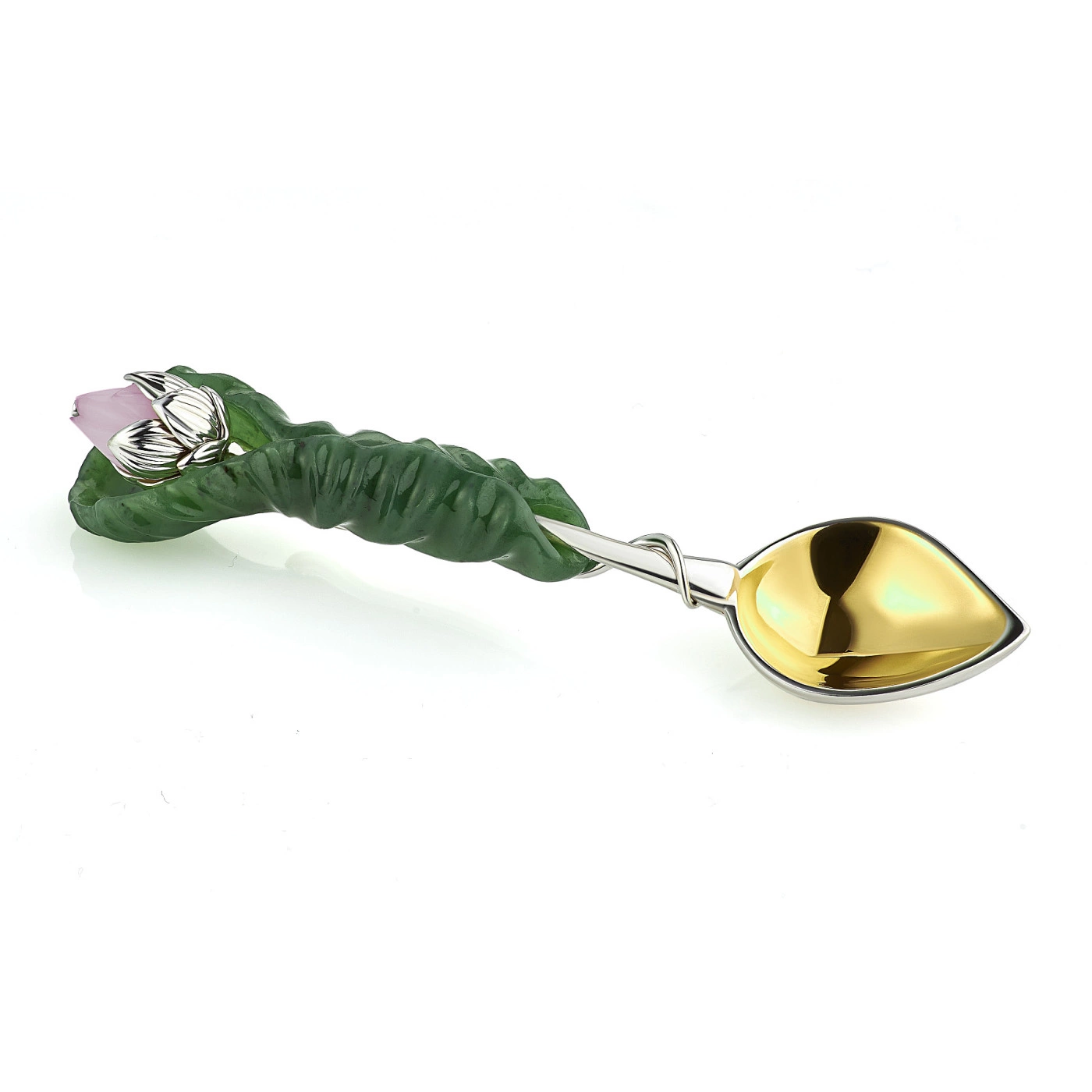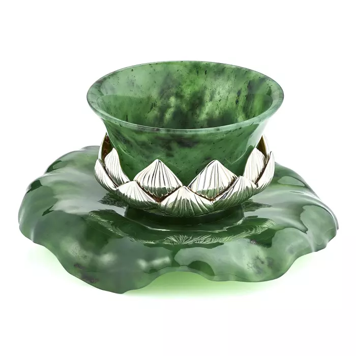 Нефрит, традиционно ценимый за свою прочность и особую энергетику, в этом наборе раскрывается не только как декоративный, но и как функциональный материал. Благодаря низкой теплопроводности камня чай дольше сохраняет температуру и постепенно раскрывает вкус, делая процесс чаепития более глубоким и созерцательным. Каждая деталь вытачивается вручную, что позволяет сохранить природный рисунок камня и подчеркнуть его естественную красоту. Серебряные элементы дополнены золочением и родированием, создавая тонкую игру оттенков — от холодного сияния до тёплого благородного света. В композиции также присутствуют акценты из розового кварца и сапфира, придающие изделию ювелирную завершённость.