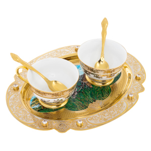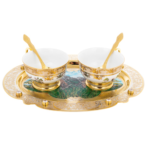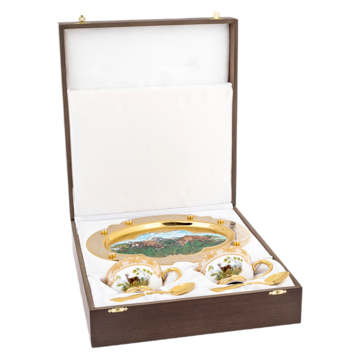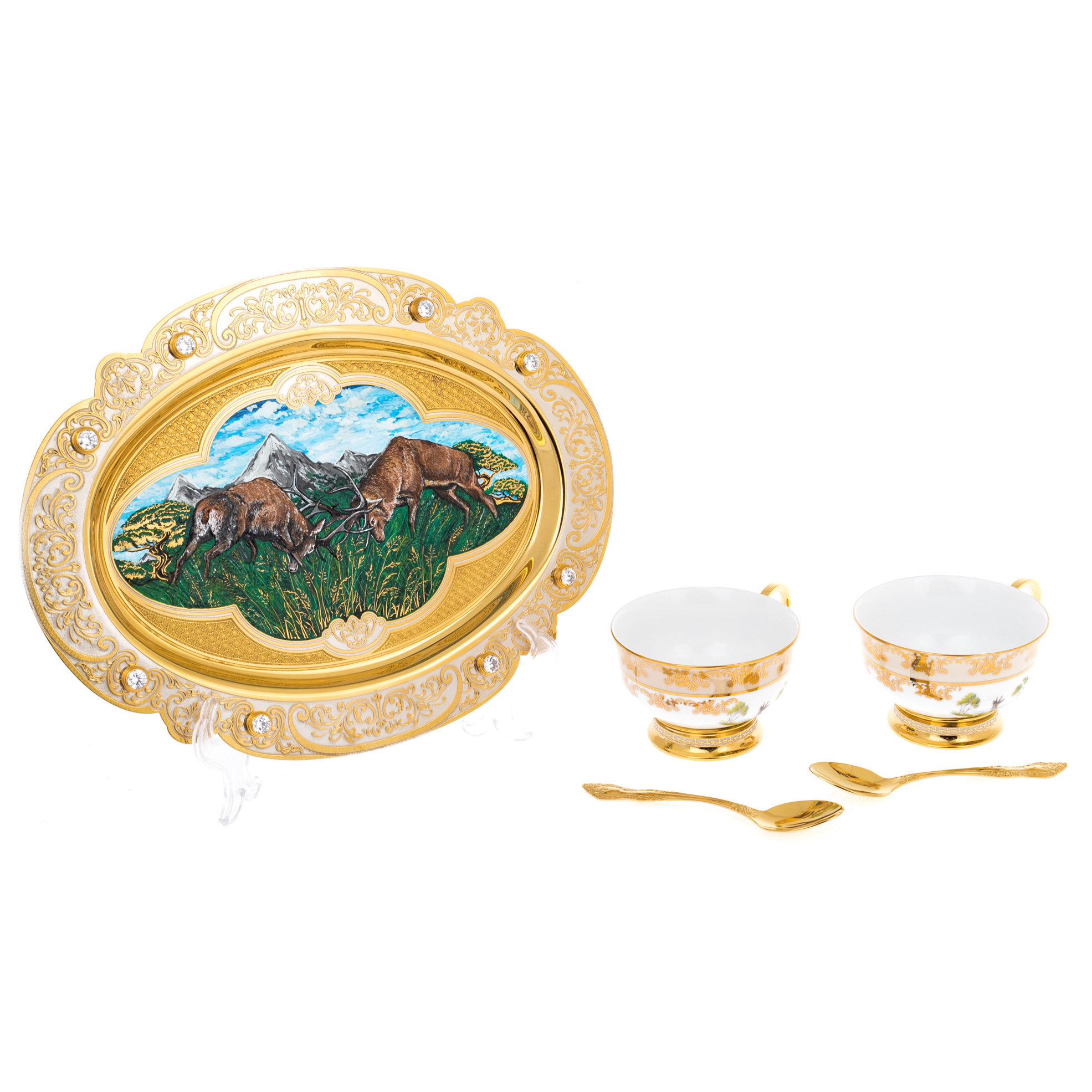 На подносе располагаются две чайные пары из белоснежного фарфора, обрамлённые позолоченными держателями с тонким узором. Каждая чашка дополнена ложкой с мягким изгибом и рельефной отделкой рукояти, где повторяются растительные мотивы, свойственные златоустовской гравюре. Контраст холодного фарфора и тёплого золота придаёт композиции благородство, а гармония линий делает её цельной. Набор выполнен вручную, с традиционной для Златоуста тщательностью в каждой детали — от прорисовки рогов оленей до идеальной полировки краёв подноса.