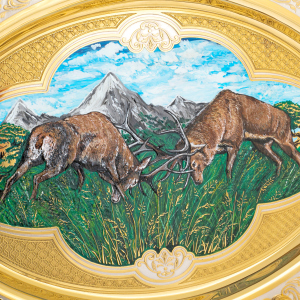 Чайный набор "Охотничий" на 2 персоны из Златоуста — это воплощение силы, природы и утончённого вкуса в едином предмете. Центральное место в композиции занимает массивный поднос с живописной эмалевой миниатюрой, изображающей сцену поединка двух оленей на фоне горного пейзажа. Мастерское сочетание золочения, серебрения и рельефной гравировки создаёт ощущение движения, будто воздух вокруг животных наполнен энергией схватки. По краям подноса расположены изящные орнаментальные пояса с геральдическими элементами и вставками, сияющими на свету.