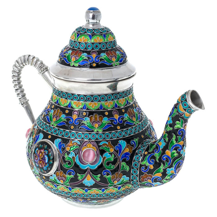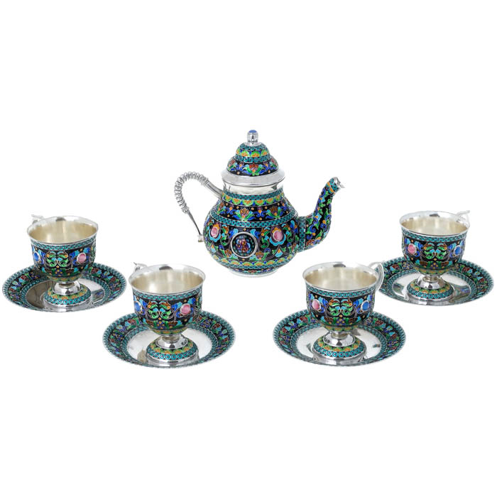 Чашки, входящие в комплект, напоминают реликвии, способные перенести в иной мир, в пространство, где нет суеты, а есть только изысканная беседа и тонкий аромат свежезаваренного чая. Их ручки словно воздушные петли из драгоценного металла, повторяющие плавные линии финифтяных узоров. Каждая чашка — это история, заключенная в серебре, в игре цветов, в блеске отполированной до совершенства поверхности.