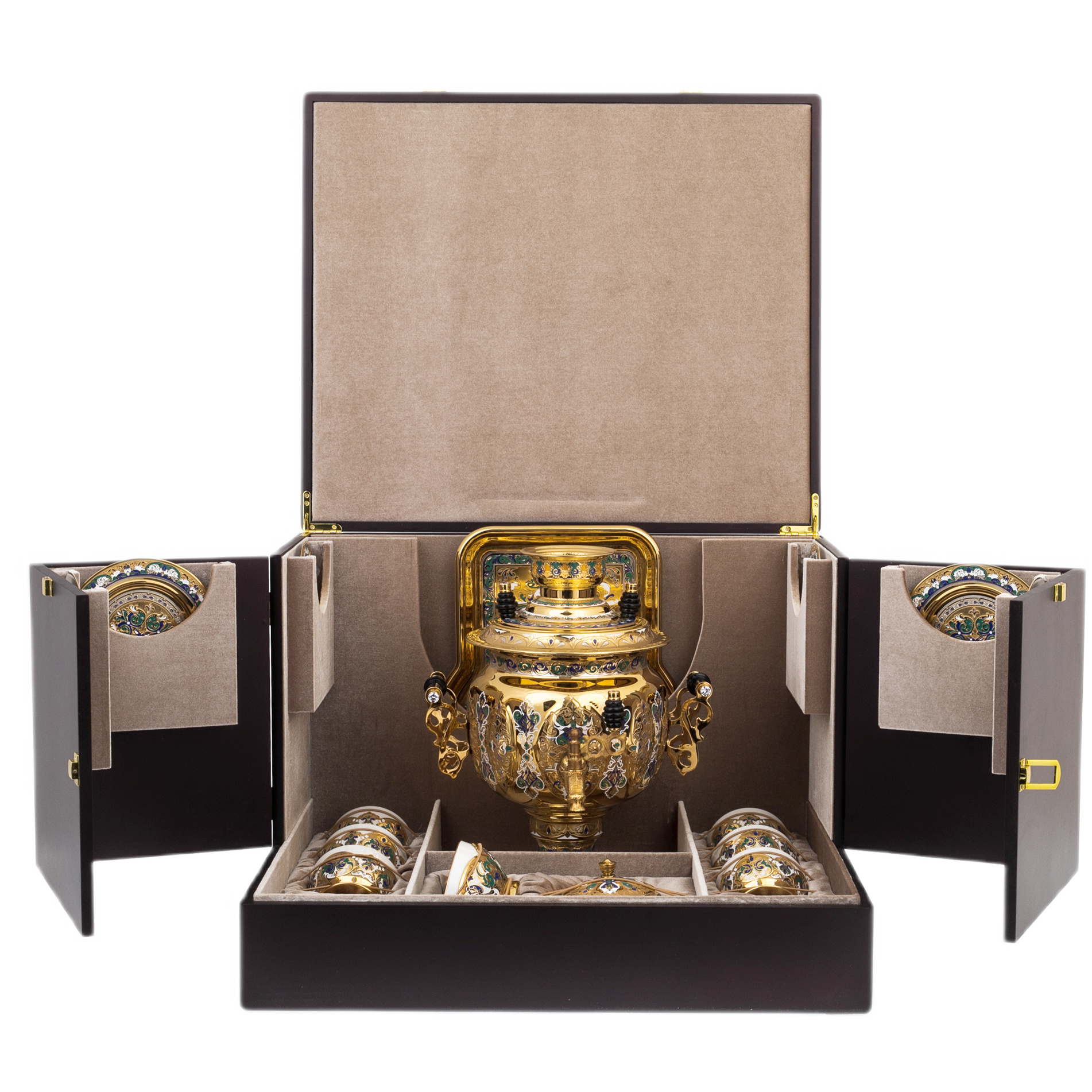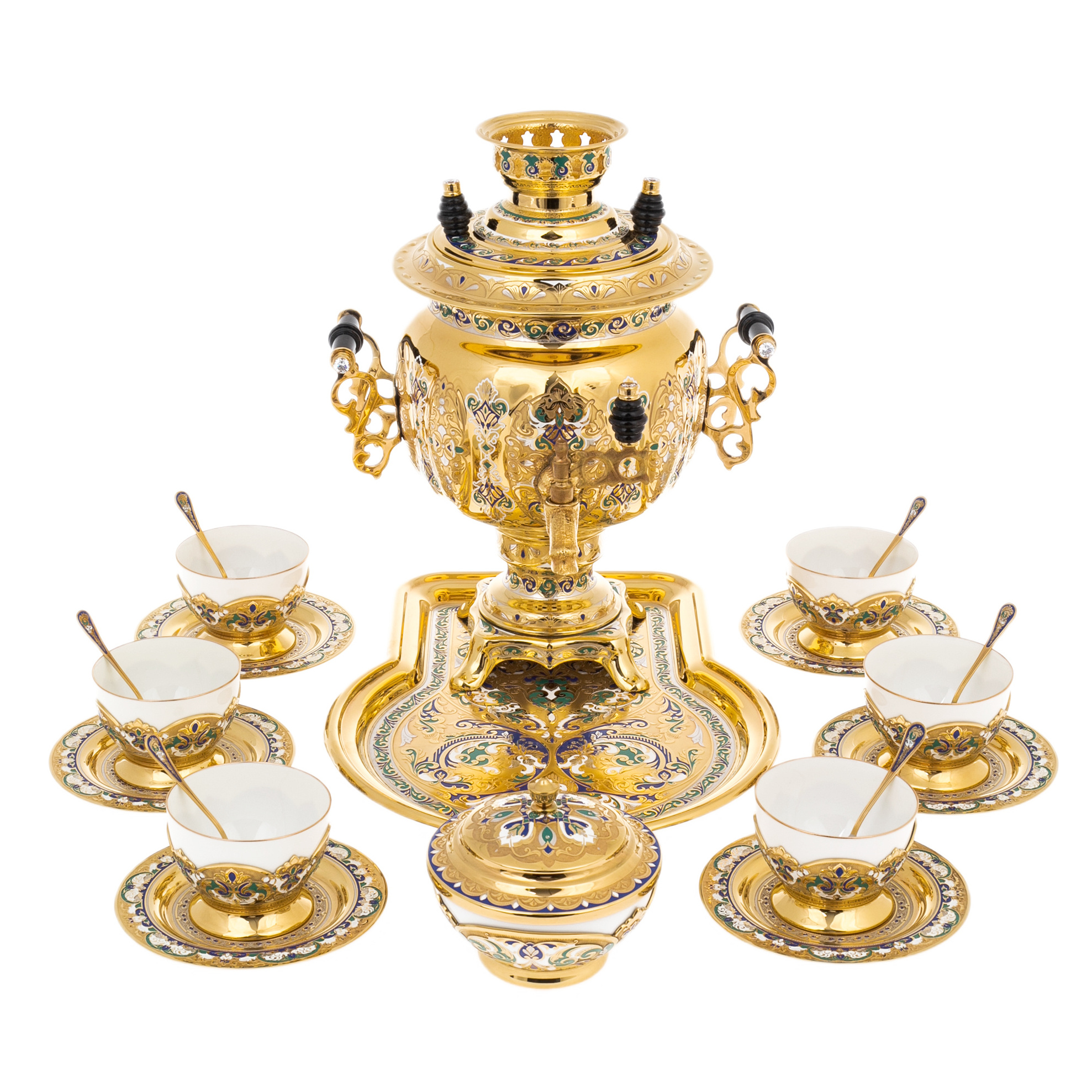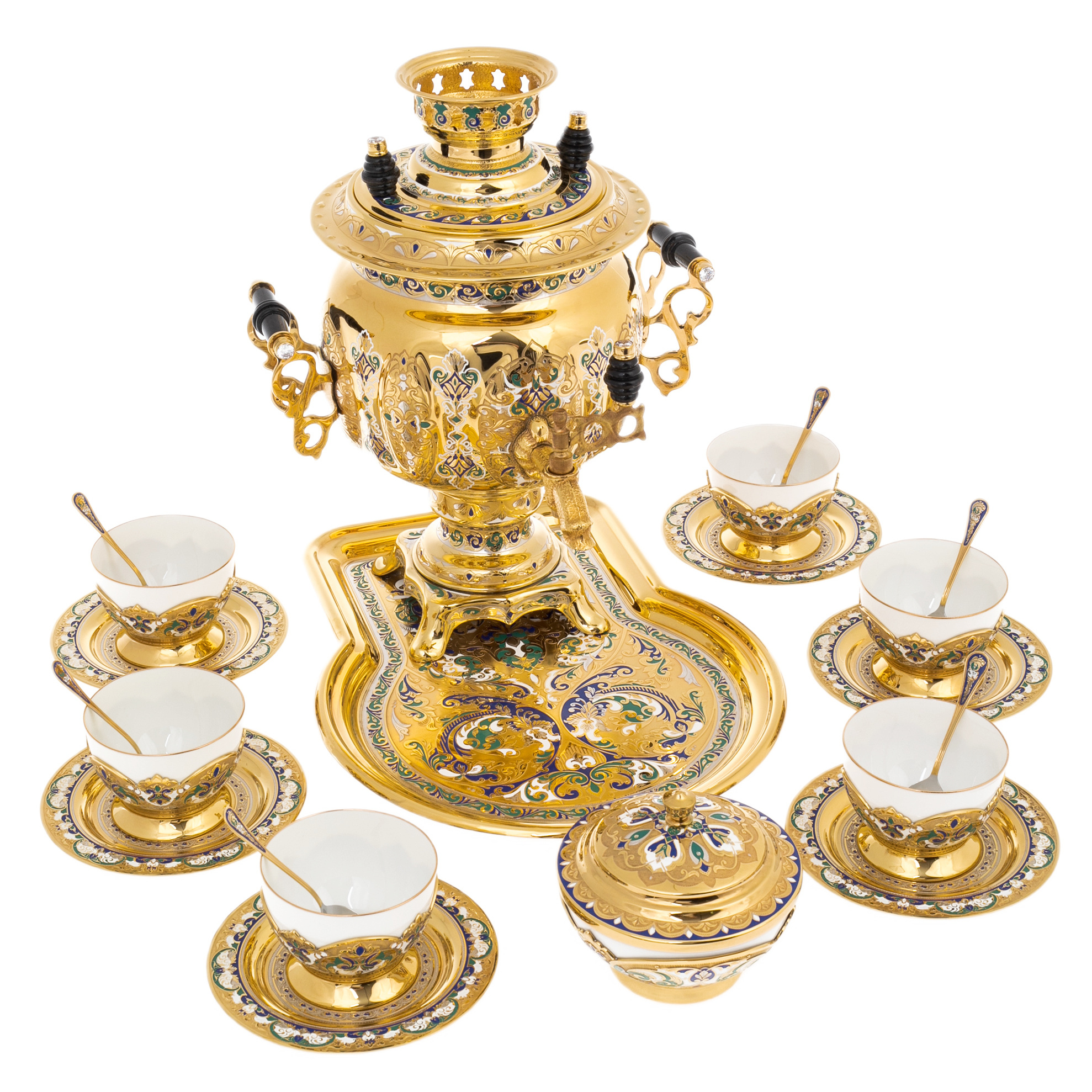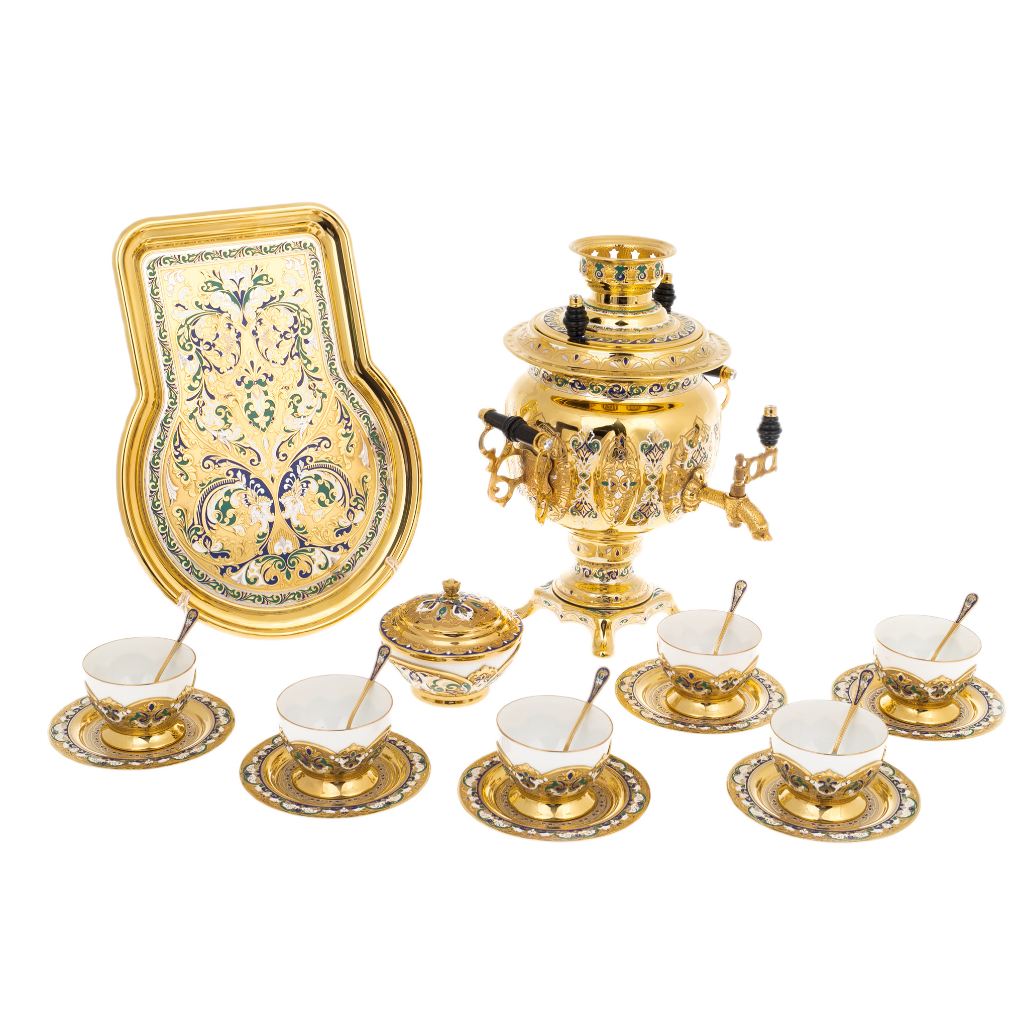 Чайный сервиз, выполненный в златоустовской технике, представляет собой изысканное сочетание функциональности и художественного мастерства, являясь настоящим украшением любого стола. Сервиз включает самовар, чайник, сахарницу, шесть чашек с блюдцами и поднос, каждый элемент которого украшен утончённой гравировкой, выполненной вручную. Основной фон изделий покрыт золотым узором, переплетающимся с бирюзовыми и изумрудными оттенками, придающими сервизу особую глубину и благородство. Золотистые и бирюзовые элементы, используемые в росписи, делают сервиз ещё более привлекательным. Каждый элемент сервиза, будь то изящный носик чайника или утончённые ручки чашек, выполнен с безупречным вниманием к деталям, демонстрируя высочайший уровень мастерства.