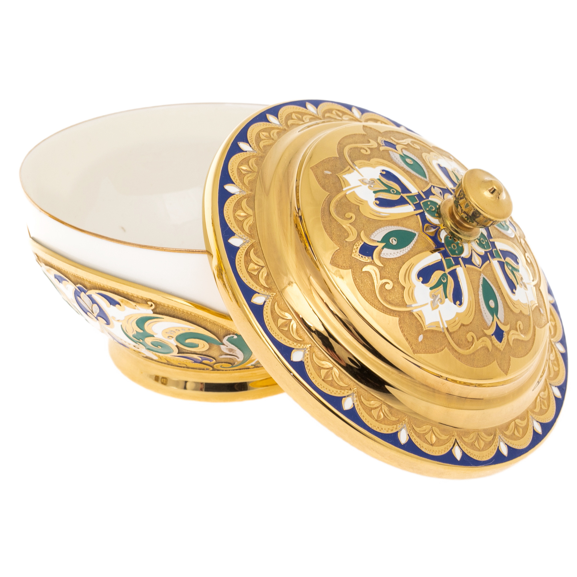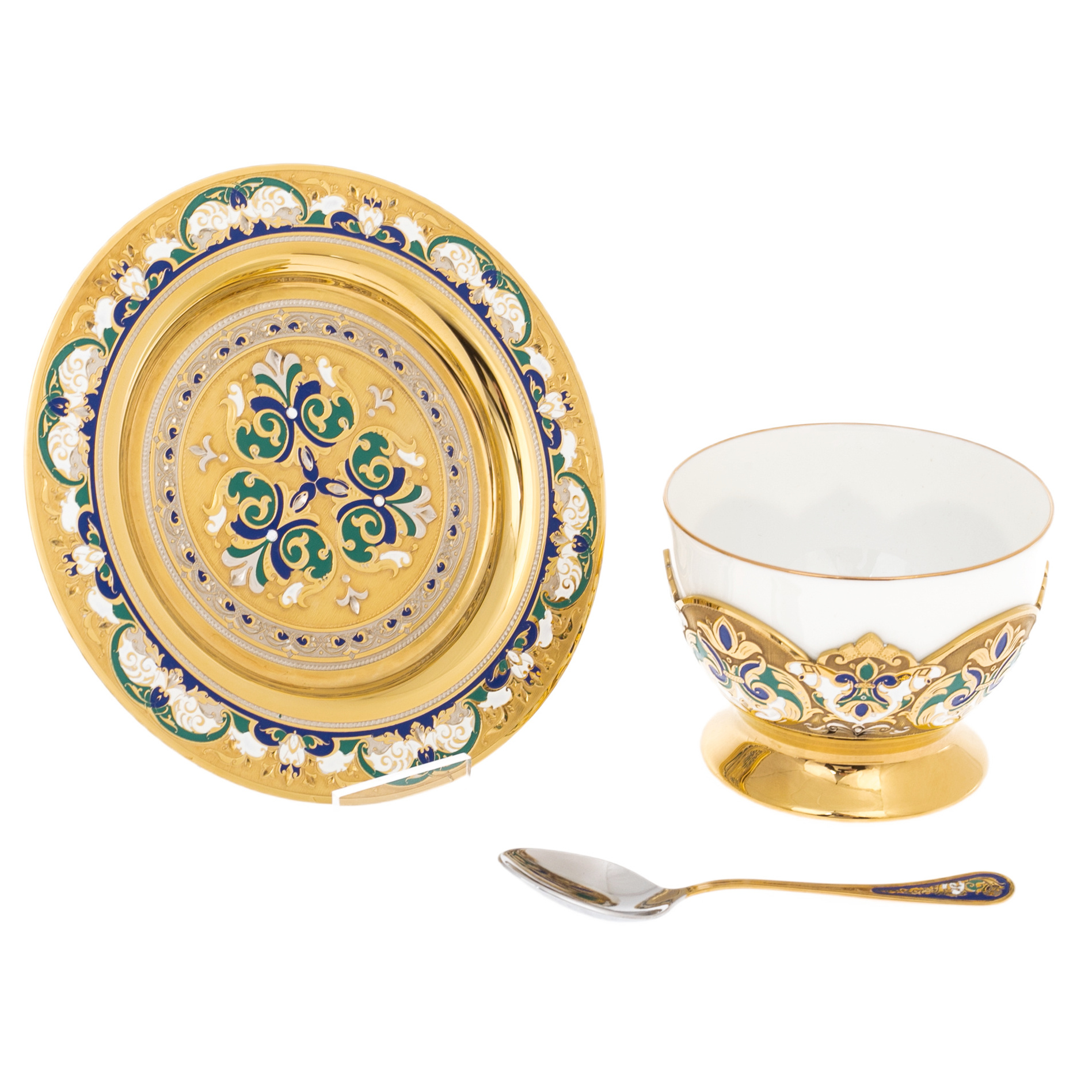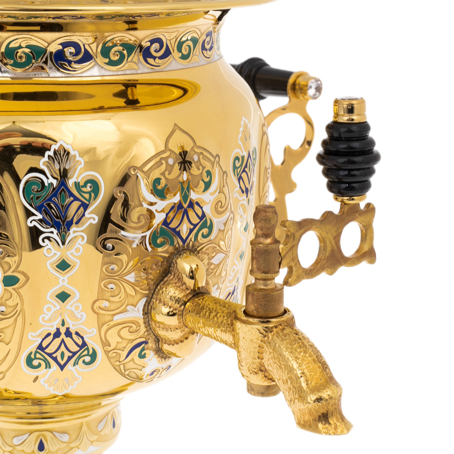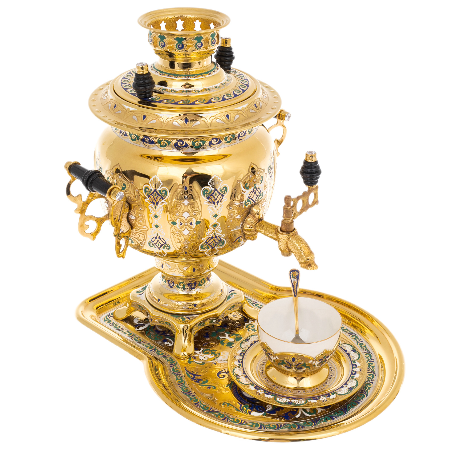 Чайный сервиз, выполненный в златоустовской технике, представляет собой изысканное сочетание функциональности и художественного мастерства, являясь настоящим украшением любого стола. Сервиз включает самовар, чайник, сахарницу, шесть чашек с блюдцами и поднос, каждый элемент которого украшен утончённой гравировкой, выполненной вручную. Основной фон изделий покрыт золотым узором, переплетающимся с бирюзовыми и изумрудными оттенками, придающими сервизу особую глубину и благородство. Золотистые и бирюзовые элементы, используемые в росписи, делают сервиз ещё более привлекательным. Каждый элемент сервиза, будь то изящный носик чайника или утончённые ручки чашек, выполнен с безупречным вниманием к деталям, демонстрируя высочайший уровень мастерства.