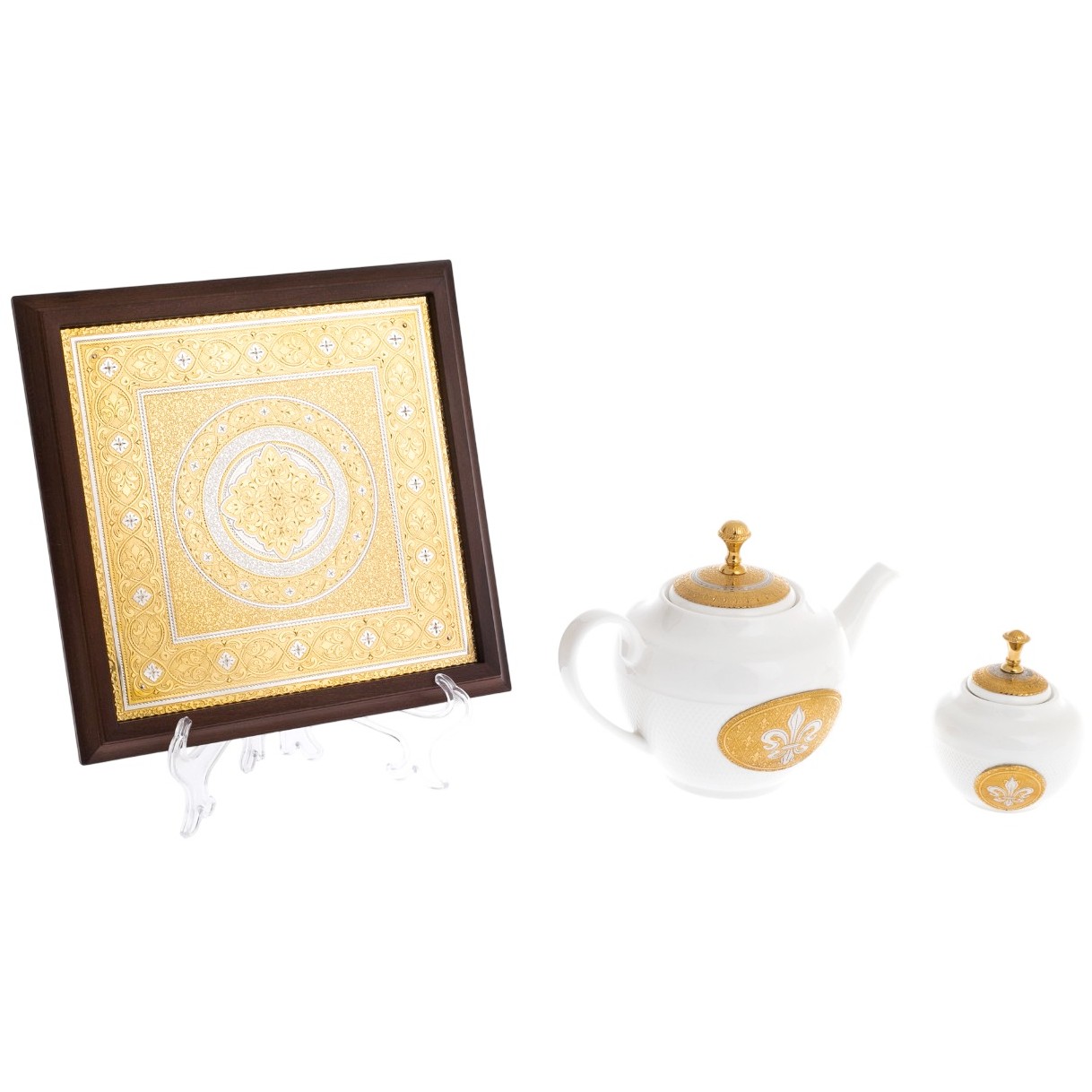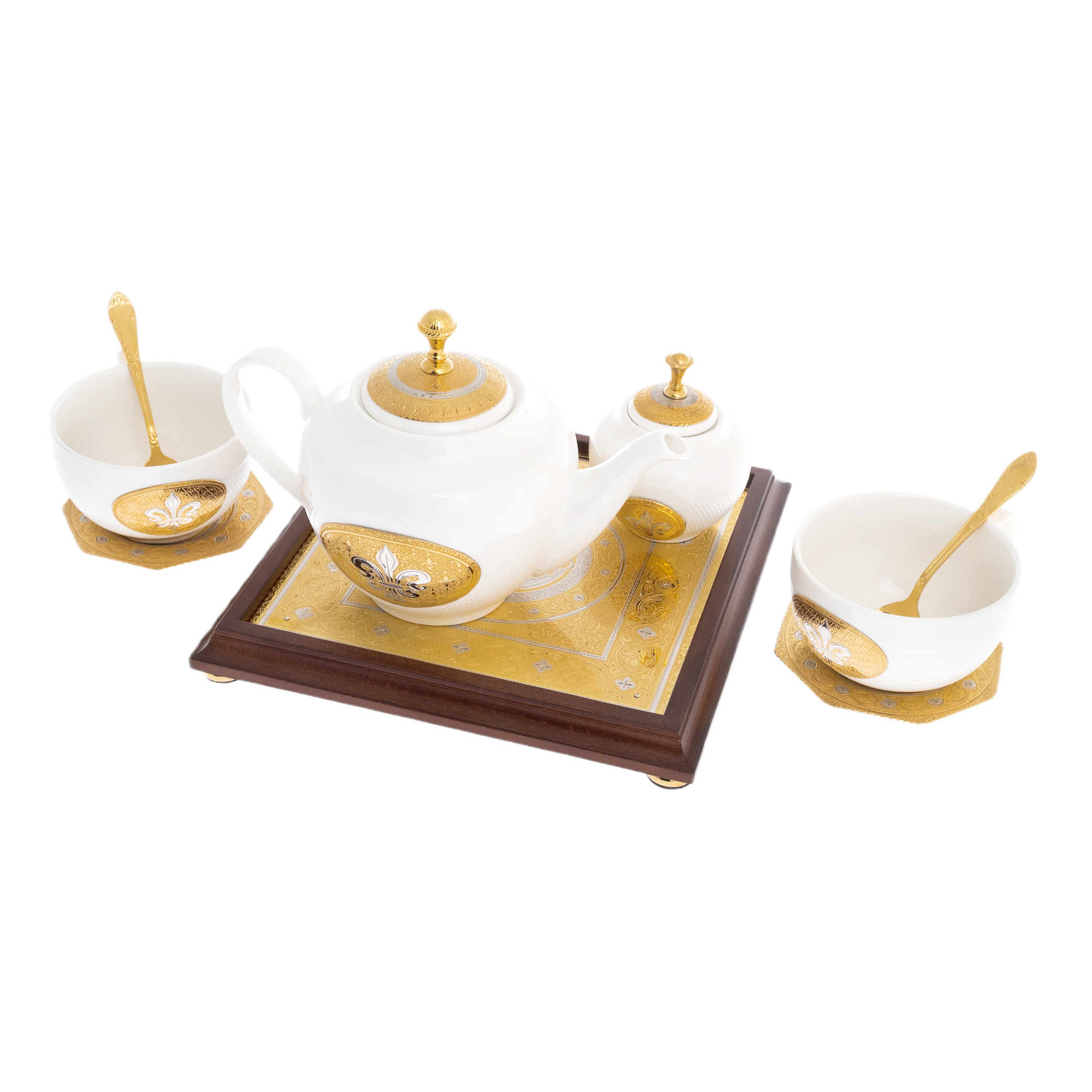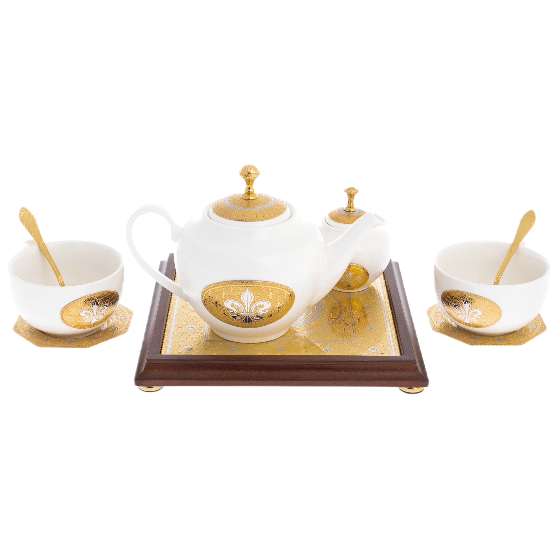 Чайный сервиз «Эстет» — набор, в котором функциональность переходит в искусство, а чаепитие — в ритуал, достойный камерного театра вкуса. Комплект предназначен для двоих: чайник, сахарница, две чаши с блюдцами и ложками — все элементы объединены единой декоративной темой, отсылающей к европейской геральдике. Обтекаемые формы фарфора, белизна поверхности, подчеркивающая тонкость материала, сочетаются с богатой золотой отделкой. Центральным акцентом композиции выступает квадратная подставка, одновременно служащая и подносом, и отдельным декоративным панно, которое можно экспонировать отдельно — как картину.