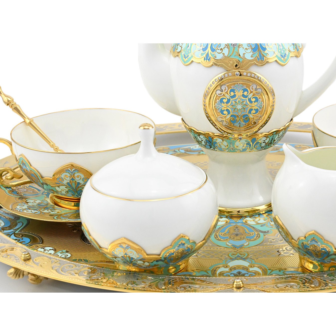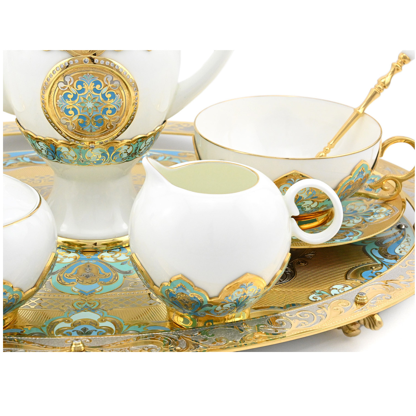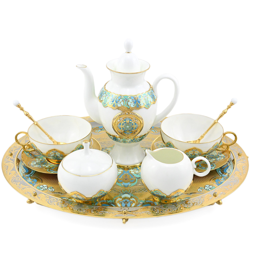 Эксклюзивная посуда изготовлена вручную с применением традиционных технологий Златоустовской гравюры с покрытием золотом и эмалью в сочетании с императорским фарфором. На разносе и чайнике инкрустированы фианиты.