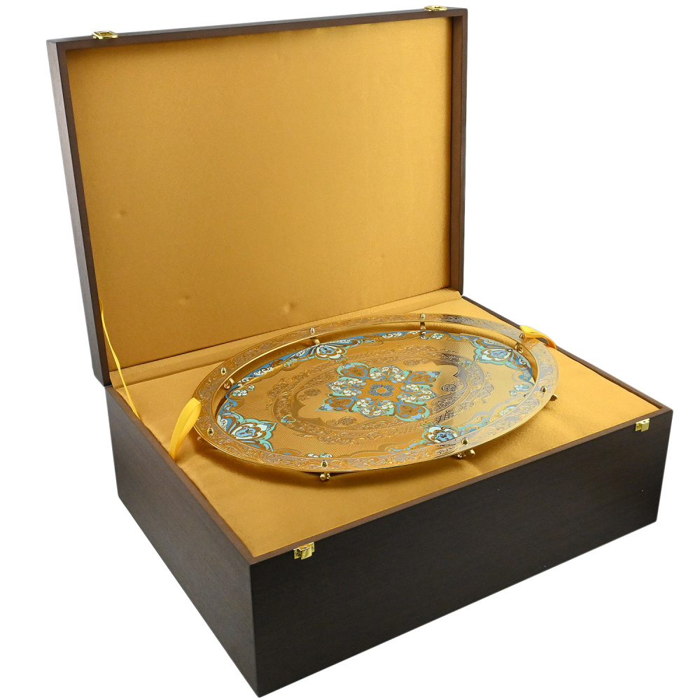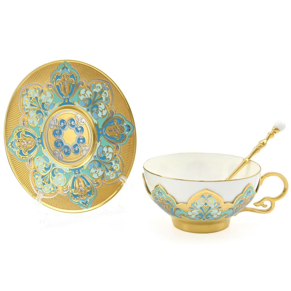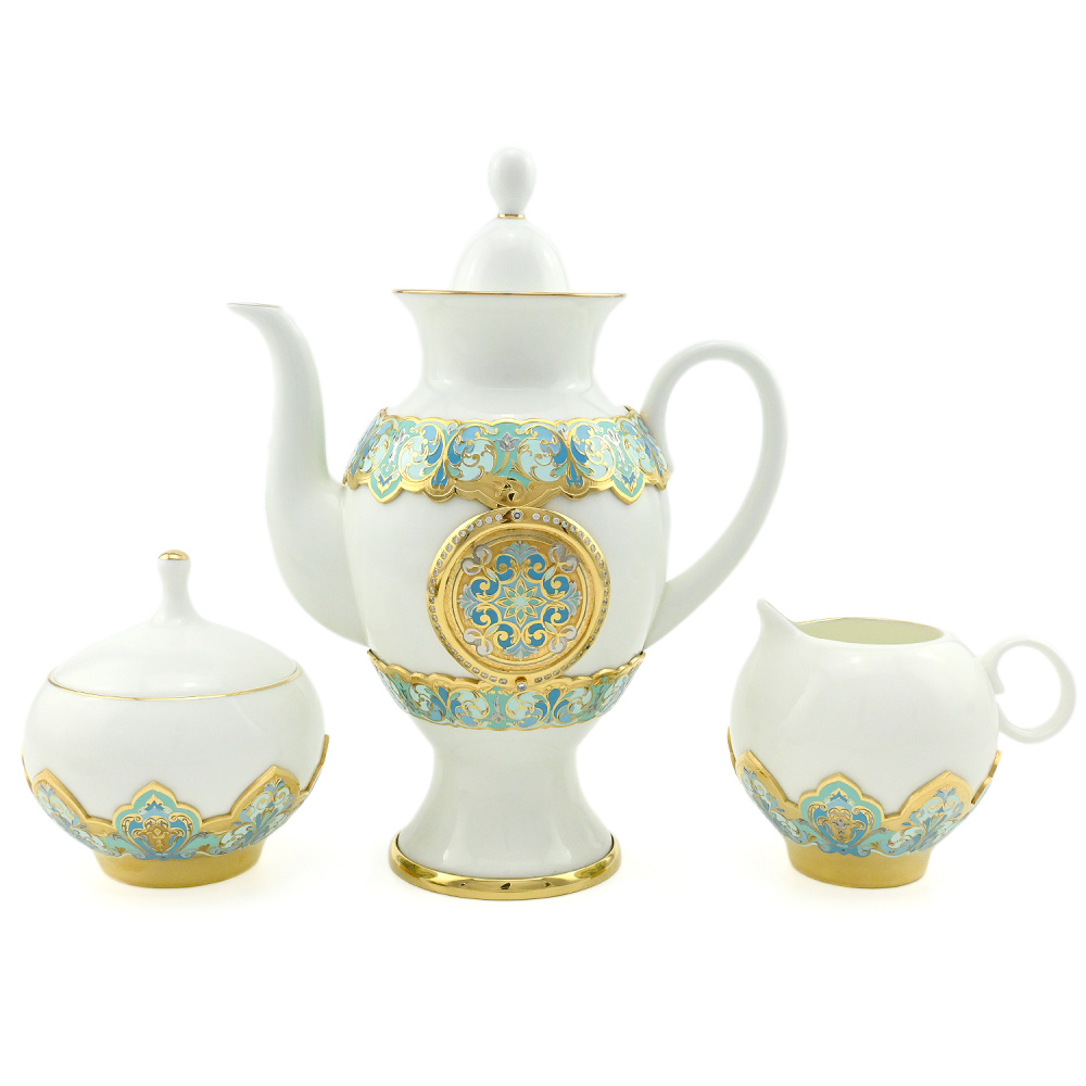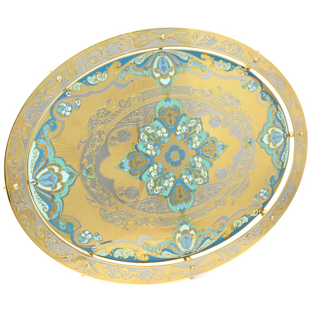 Эксклюзивная посуда изготовлена вручную с применением традиционных технологий Златоустовской гравюры с покрытием золотом и эмалью в сочетании с императорским фарфором. На разносе и чайнике инкрустированы фианиты.