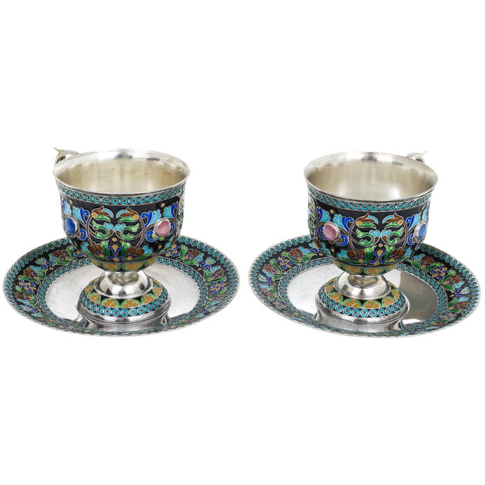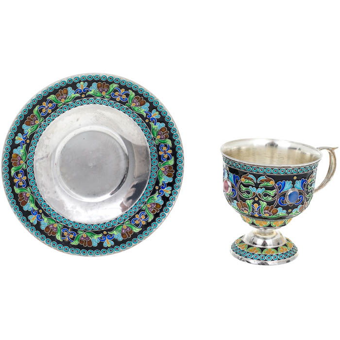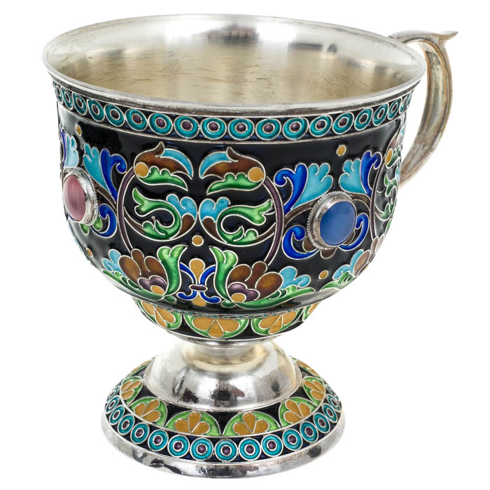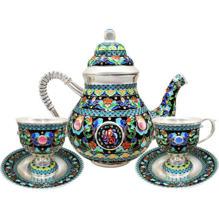Чашки, входящие в комплект, напоминают реликвии, способные перенести в иной мир, в пространство, где нет суеты, а есть только изысканная беседа и тонкий аромат свежезаваренного чая. Их ручки словно воздушные петли из драгоценного металла, повторяющие плавные линии финифтяных узоров. Каждая чашка — это история, заключенная в серебре, в игре цветов, в блеске отполированной до совершенства поверхности.
