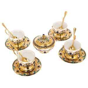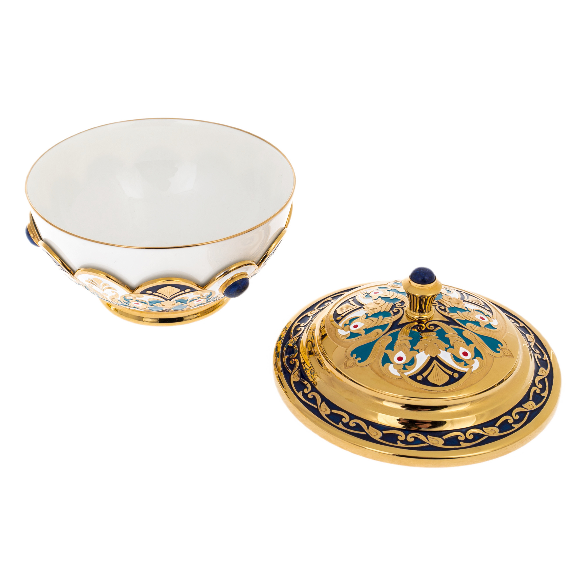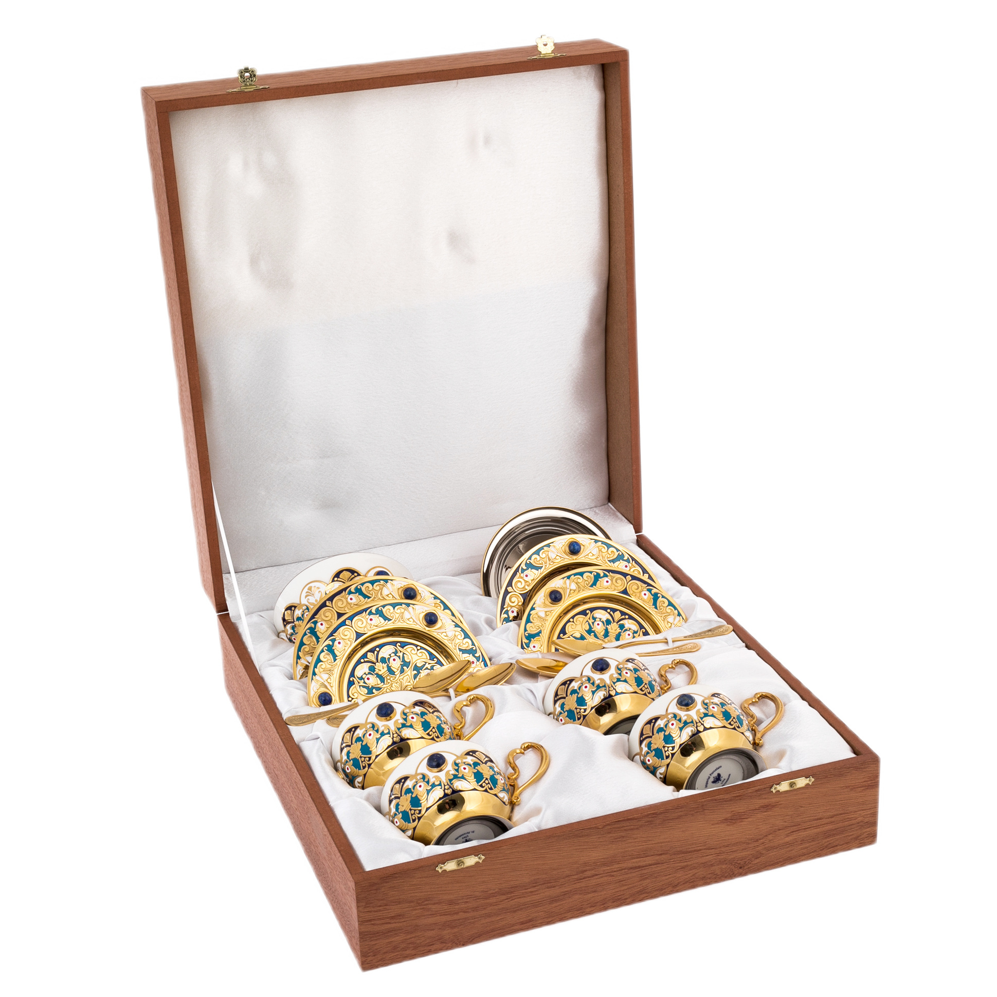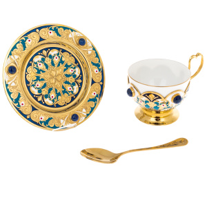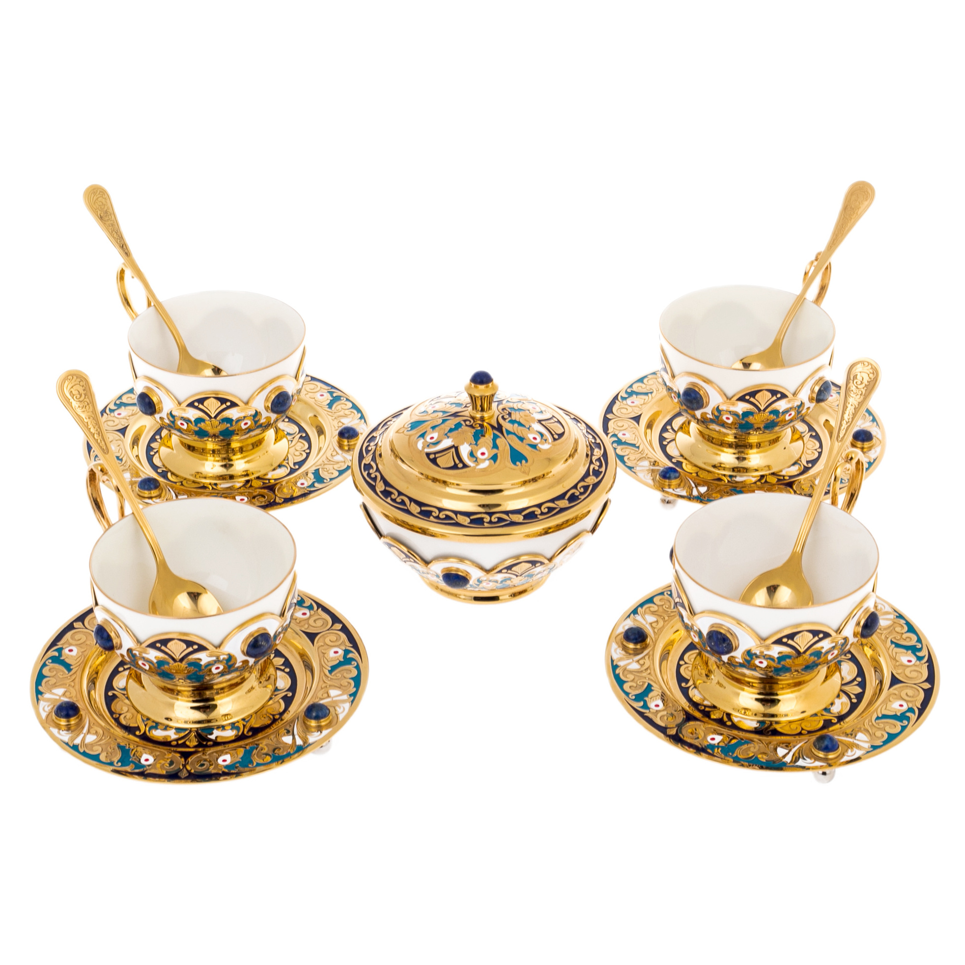 Основу набора составляет сочетание фарфора и металла с позолотой, обработанного в декоративной традиции Златоуста. Чашки посажены в золочёные оправы с изящными ручками, украшенными орнаментальными накладками и вставками лазурита глубокого ультрамаринового оттенка, дающего благородный холодный акцент на фоне тёплого золота. Блюдца раскрывают сложный рисунок: завитки, цветочные мотивы, тонкая гравировка, контрастные эмалевые поля кобальтового тона, дополненные миниатюрными красными акцентами; по краю и на декоративных элементах расставлены камни, перекликаясь с оправами чаш. Сахарница поддерживает общую архитектуру набора — фарфоровая чаша в золочёной посадке, крышка с рельефным декором и вставкой лазурита на навершии, по ободу — синий эмалевый пояс, создающий эффект драгоценного венца. Ложечки выполнены в золочёном металле, украшены тонким узором на рукоятях, дополняя ансамбль не только визуально, но и тактильно — гладким, тяжёлым блеском настоящей статусной вещи.
