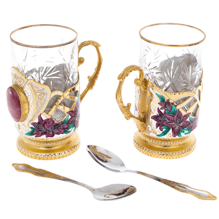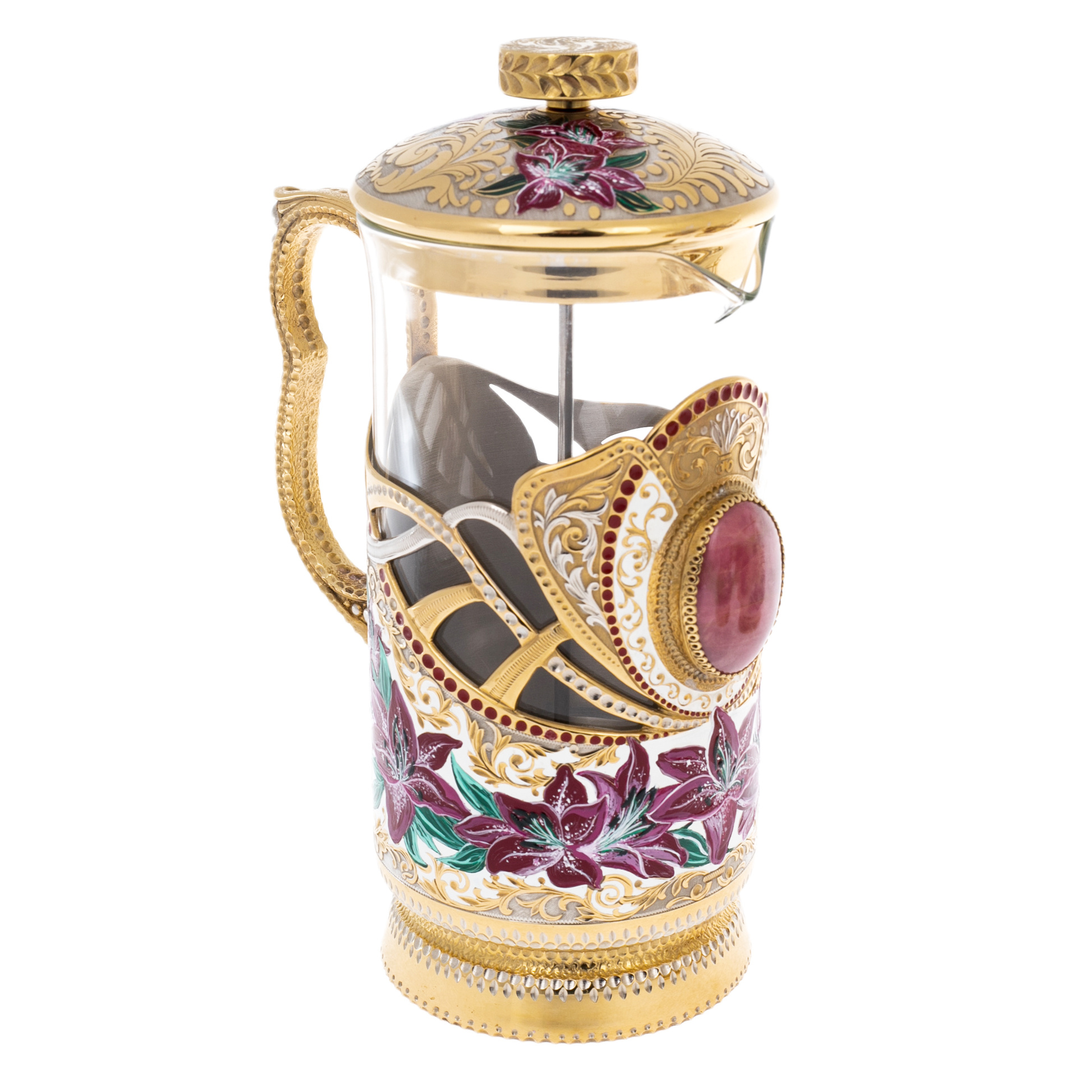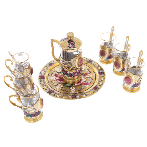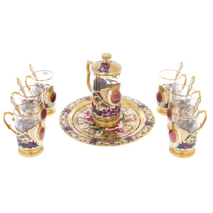 Основа композиции выстроена на контрасте прозрачного стекла и тёплого сияния металла: стеклянная колба френч-пресса заключена в декоративный каркас из металла с позолотой, перекликаясь с подстаканниками, оформленными ажурными накладками и рельефной фактурой. Крышка, ободки, ручки, декоративные пояски и основание подноса подчеркивают мастерскую работу златоустовских художников: тонкая гравировка, растительные завитки, орнаментальные поля, аккуратно выведенные линии, дополненные цветной эмалью и ручной росписью. В композицию введены каменные акценты благородного розового оттенка — крупные овальные вставки, собранные в оправы, придающие сервизу ощущение драгоценности и завершённости; даже ложки поддерживают общий тон, сохраняя золотистый блеск и утончённые пропорции.