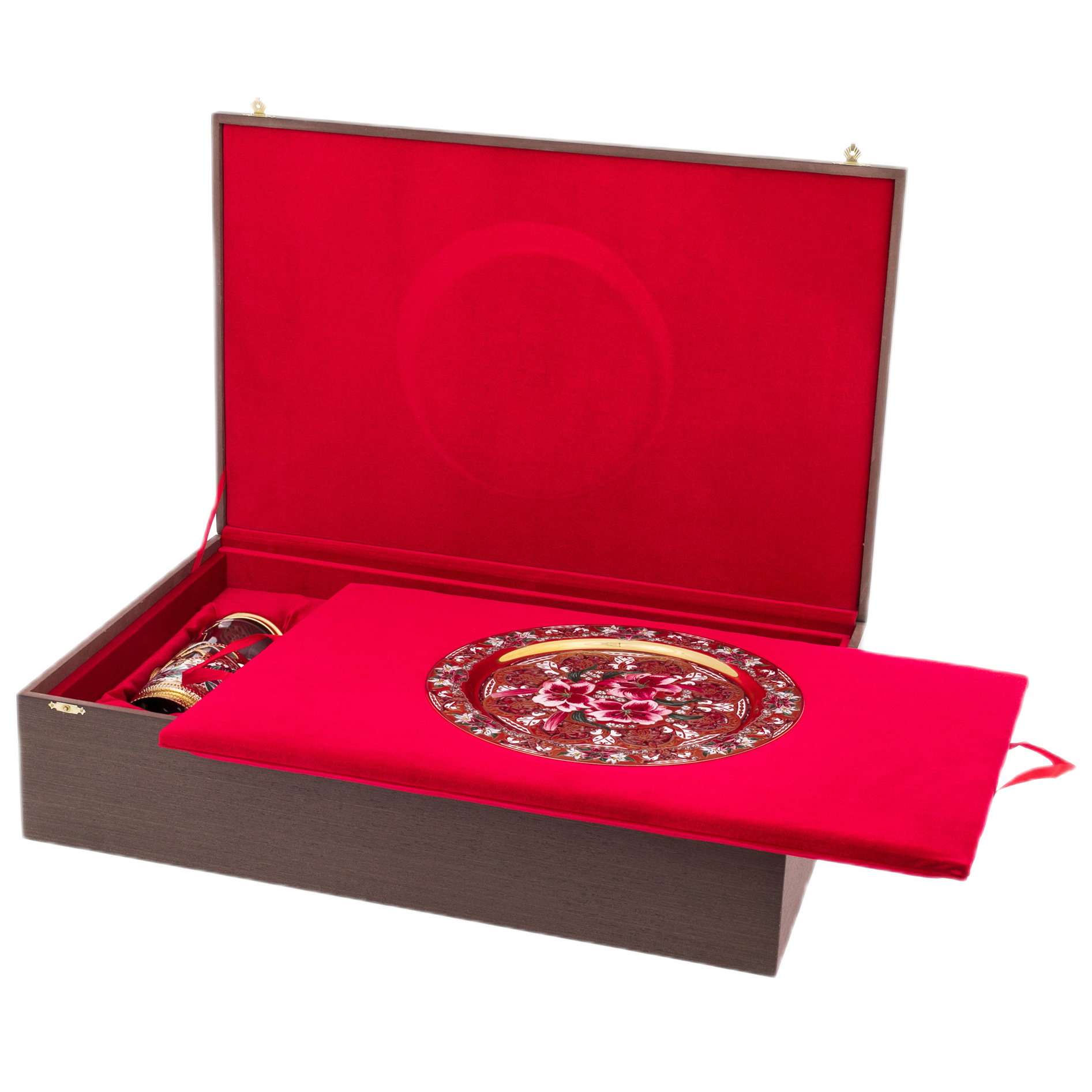 Главный мотив набора — лилии, раскрытые в центре подноса как торжественный знак чистоты вкуса и спокойной силы, звучащий особенно выразительно на фоне сложного золото-орнамента. Роспись лепестков выполнена так, будто цветок живёт в свете: насыщенные красно-розовые оттенки, зелёные штрихи листьев, тонкие переходы тона, а по краю — венок миниатюрных бутонов, поддерживающий праздничный ритм. В результате рождается вещь, рассчитанная на взгляд, привыкший к лучшему: сервировка выглядит как коллекционный предмет, чайная пауза — как привилегия, а дом или кабинет — как пространство, где красота закреплена в деталях и подана с безупречной мерой.