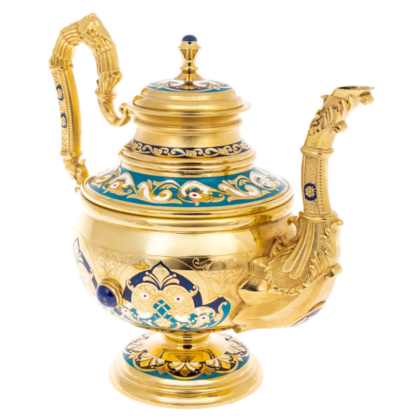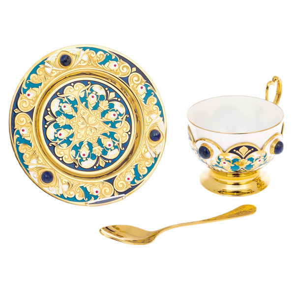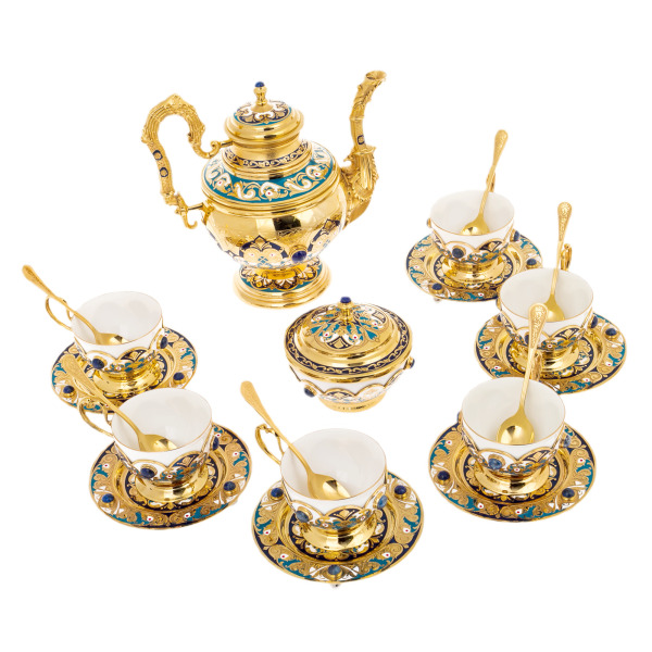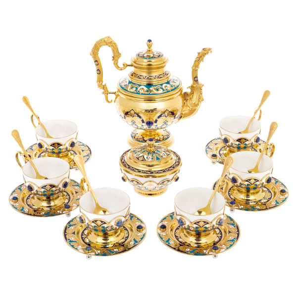 Чайный набор изготовлен из высококачественных материалов, включая латунь с никелевым покрытием и позолотой, украшен эмалью и натуральным лазуритом, что делает его не только предметом для использования, но и значимым элементом интерьера.