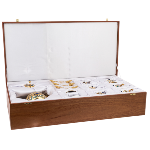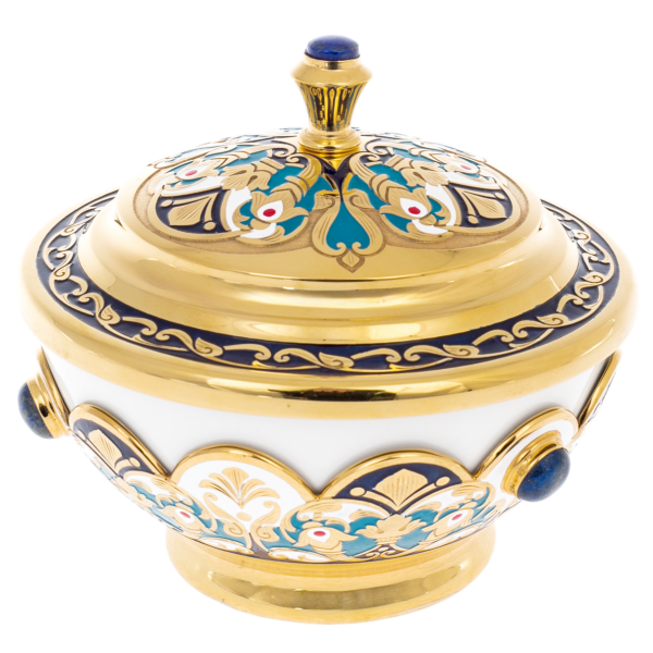 Включая в себя самовар, который является воплощением традиционного русского чаепития, этот набор отражает глубокие исторические корни и изысканный вкус. Самовар украшен драгоценными камнями лазурита, добавляющими особый блеск и величие каждой части набора. Сопровождающие его чашки, блюдца и ложечки продолжают этот роскошный дизайн, гармонично сочетая в себе золотое сияние и синеву лазурита, а также традиционные узоры Гжель.