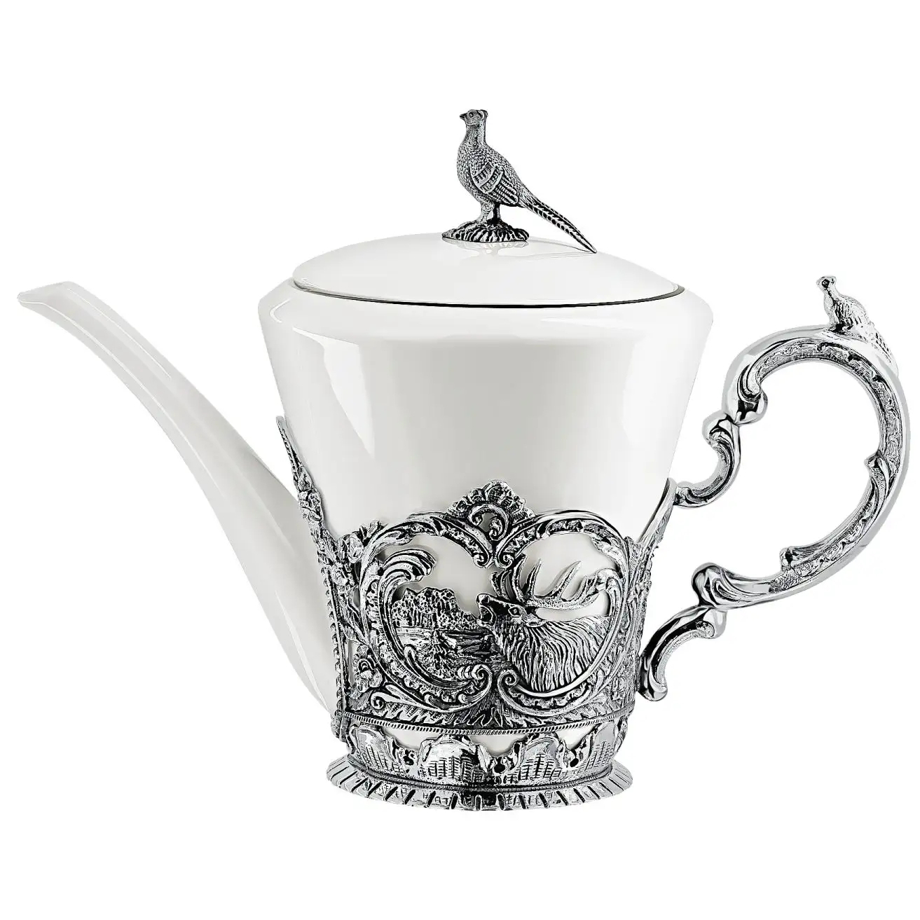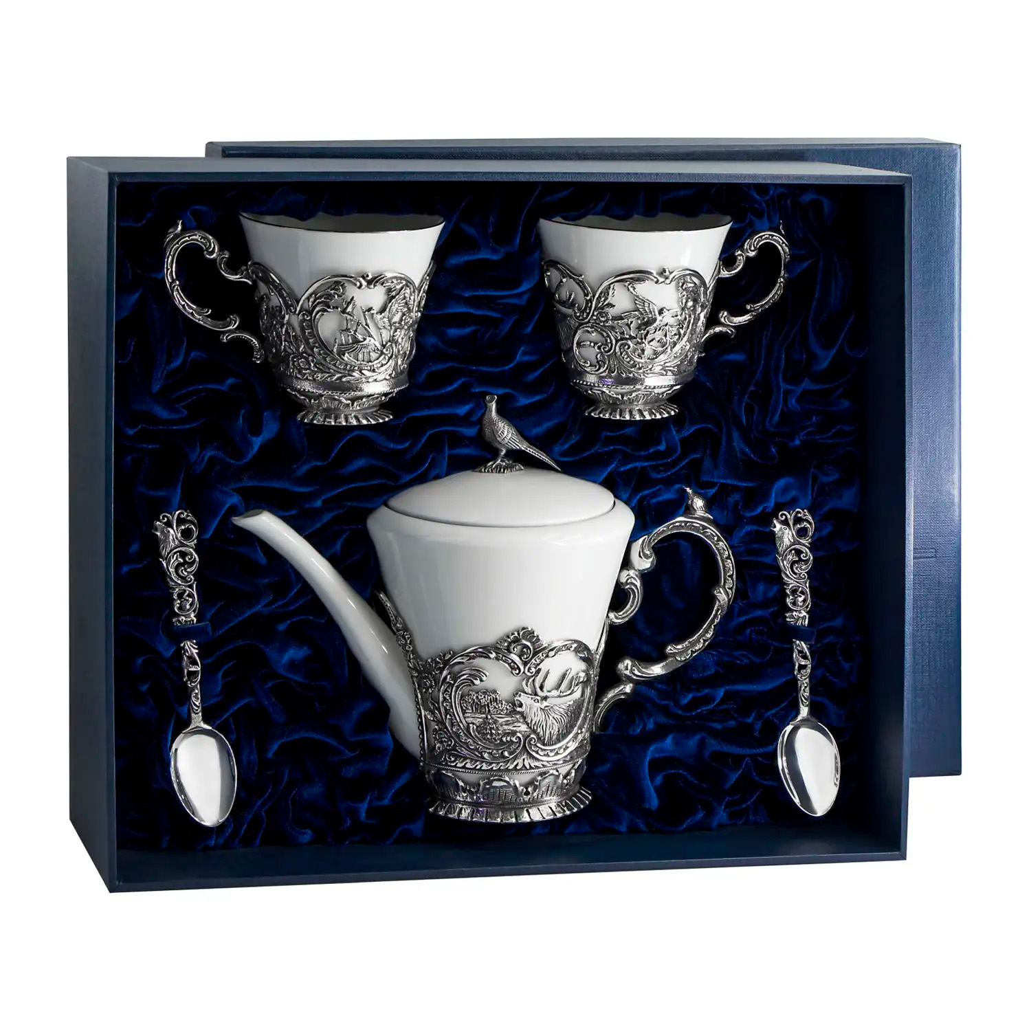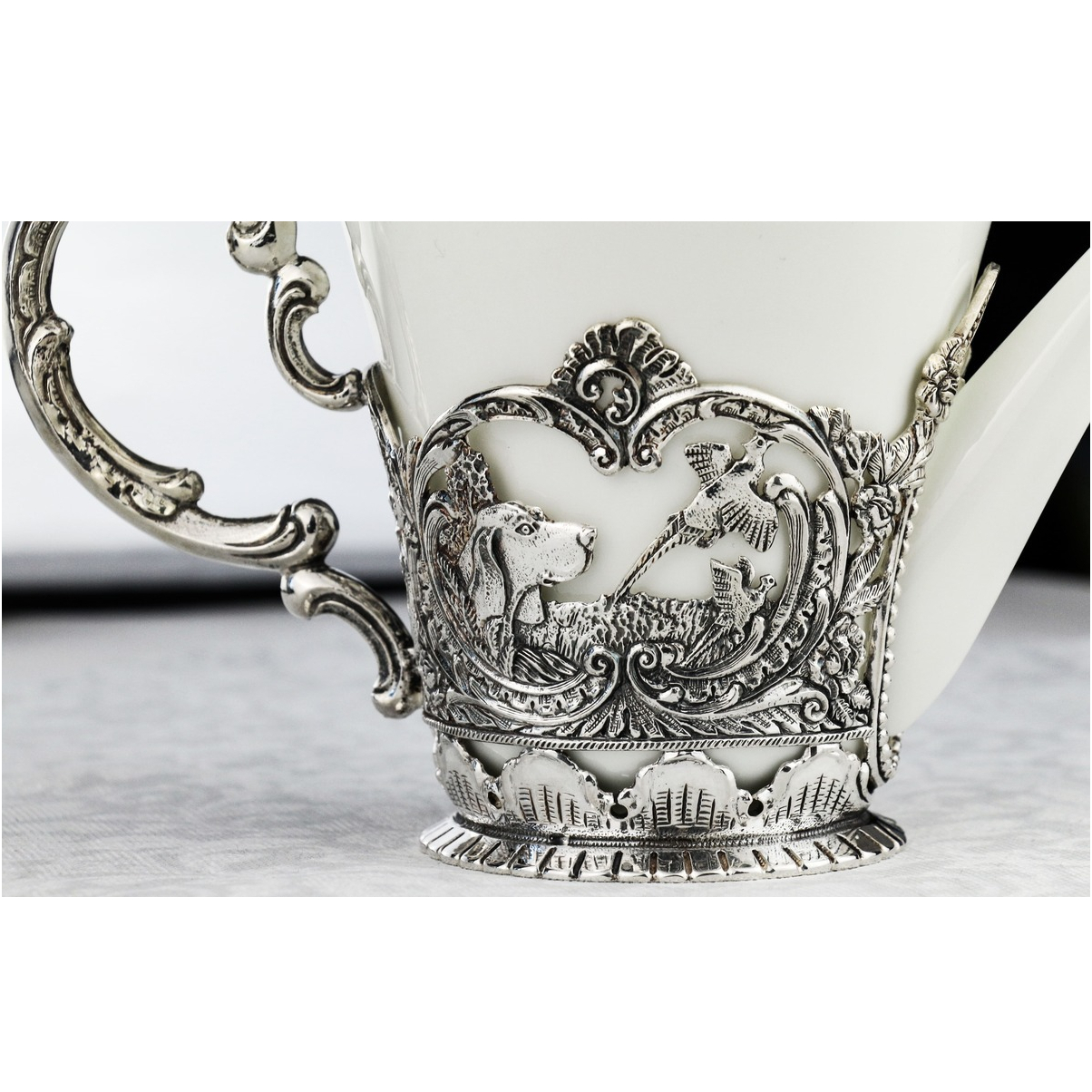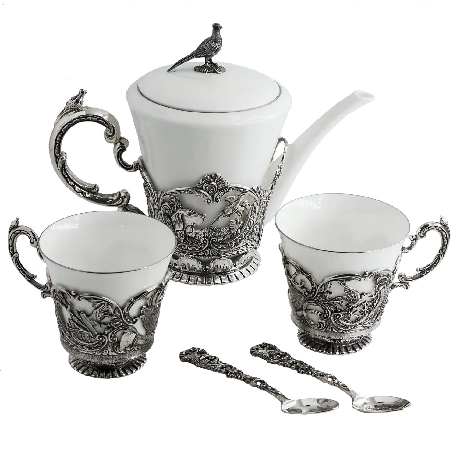 Серебряный чайный набор "Королевская охота": ложка, чашка, чайник