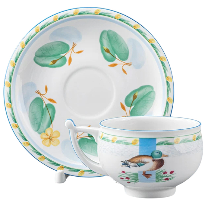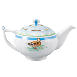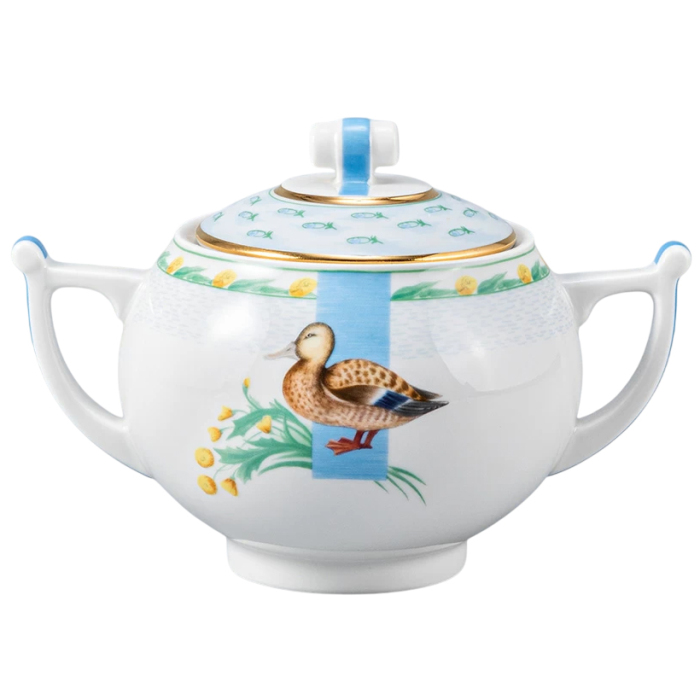 В творчестве Н.Л. Петровой, главного художника ИФЗ, тема русской природы занимает значительное место. Это неисчерпаемый источник вдохновения, большой мир, наполненный событиями, дарящими человеку необычайно яркие впечатления. Мягкие полутона, гармоничный колорит, овеянная тишиной и покоем вечно прекрасная натура создают идиллическую картину мира, проникнутую теплотой воспоминаний, трепетным и нежным отношением к природе тех мест, где художник провела свое детство и юность. Дикие утки, реалистично изображенные на всех изделиях, объединяют предметы в единый ансамбль. Основой композиционного решения служат широкая голубая отводка, символизирующая воду, и мотив болотных растений, ягод и цветов, присутствующих на каждом предмете.