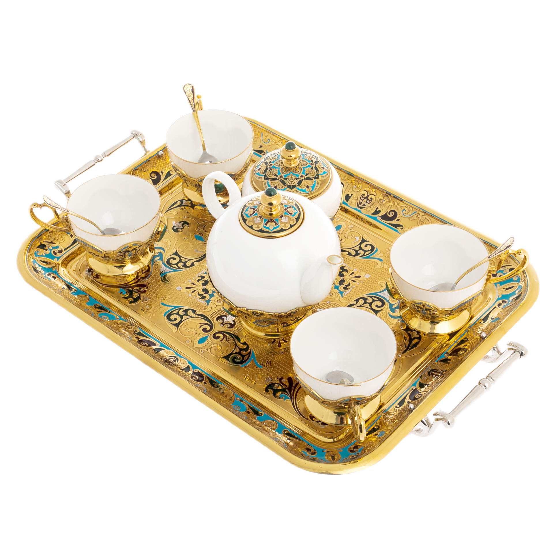 Комплектация: 4 чашки, 4 ложечки, заварочный чайник, сахарница, поднос.