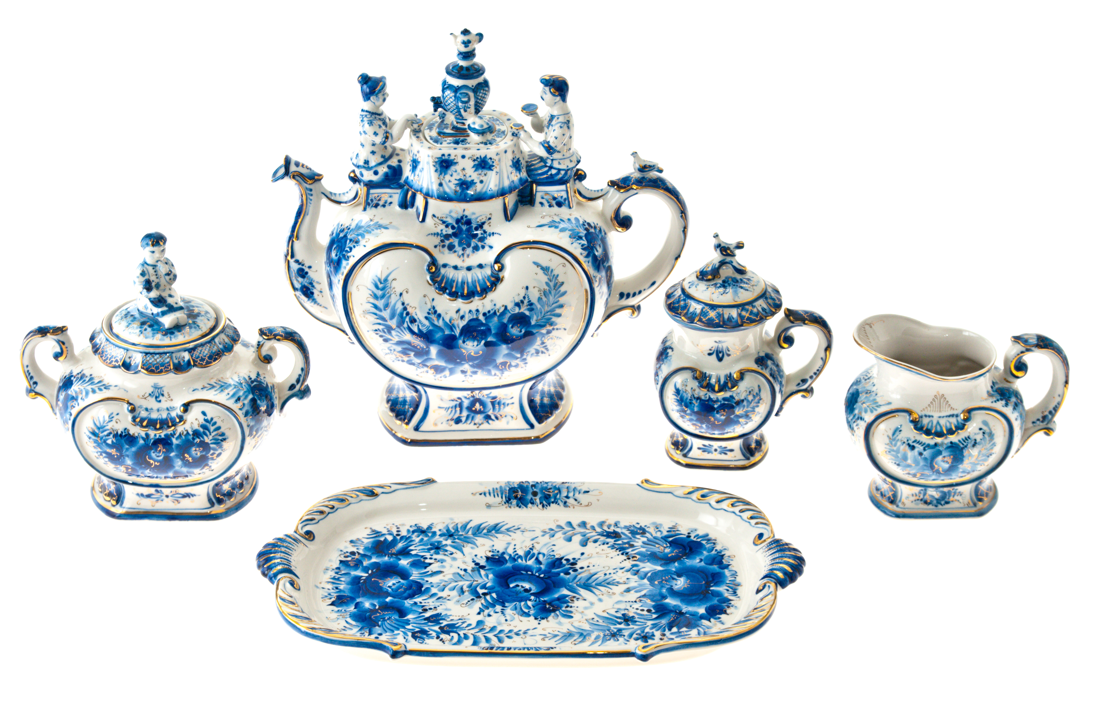 Комплектация:чайник доливной, чайник заварной (на фото не представлен), сахарница, молочник, 6 бокалов, 6 ложек чайных, блюдо (бокалы и ложки на фото не представлены). По Вашему желанию состав сервиза может быть изменен..