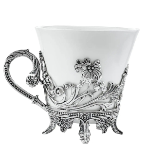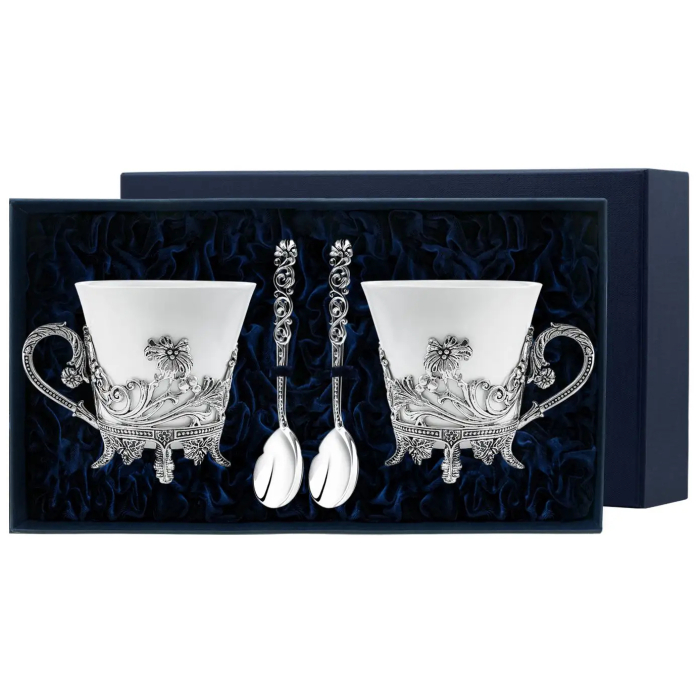 Набор чайных чашек из серебра и фарфора "Цветочная"новая: ложка, чашка, на 2 персоны