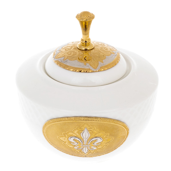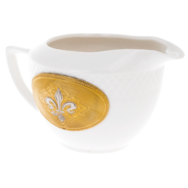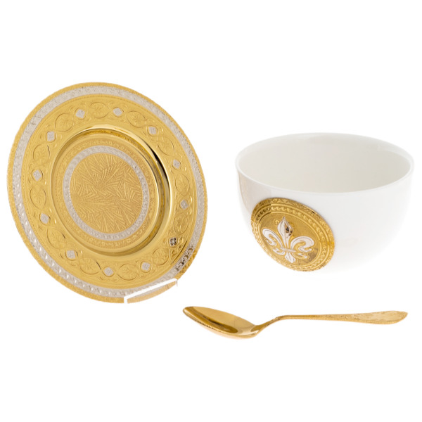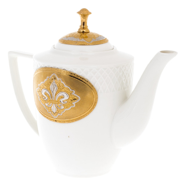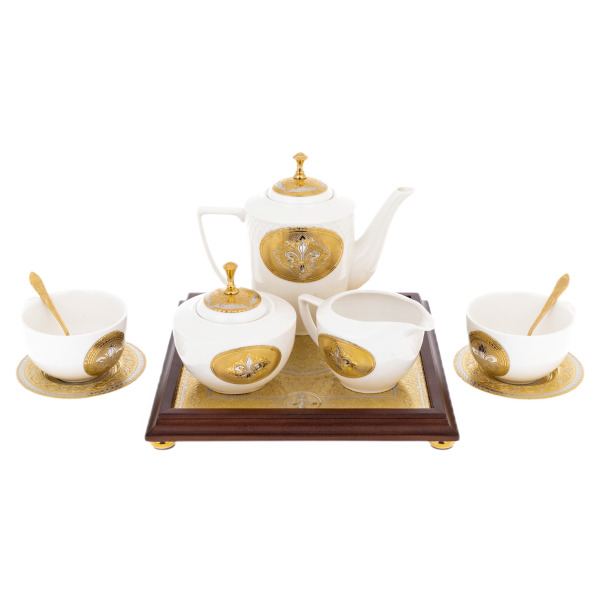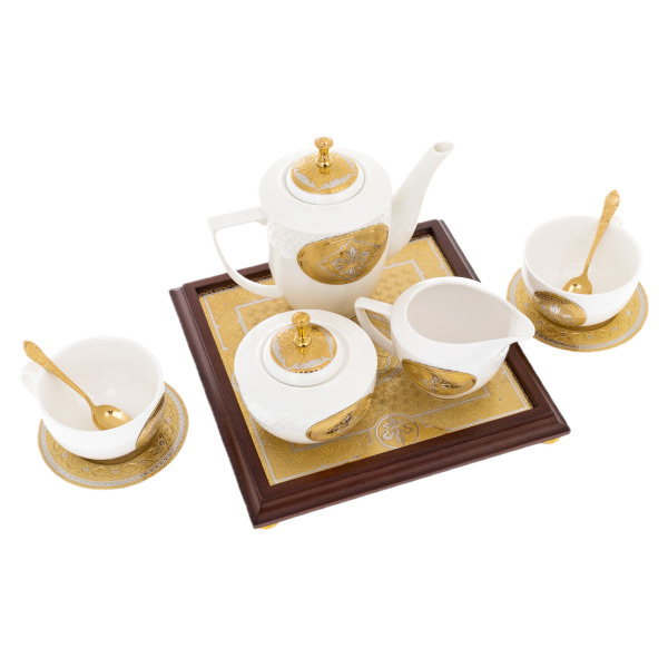 Белоснежный фарфор украшен золочёными вставками и изысканным гравированным орнаментом, выполненным мастерами ручной работы. Каждая деталь — от тонкого контура чайника до изящной ложечки — хранит атмосферу императорских приёмов, где чай был не просто напитком, а символом уюта, изящества и гостеприимства.