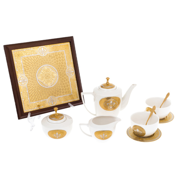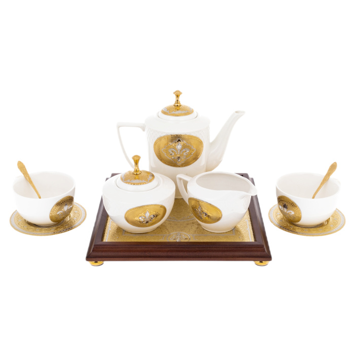 В набор входят чайник, сахарница, ложечки, сливочник и две чашки с блюдцами, представленные на позолоченном подносе из латуни с богатым декором. Это подарок, в котором чувствуются традиции русского чаепития, благородство форм и тонкий вкус хозяина дома.