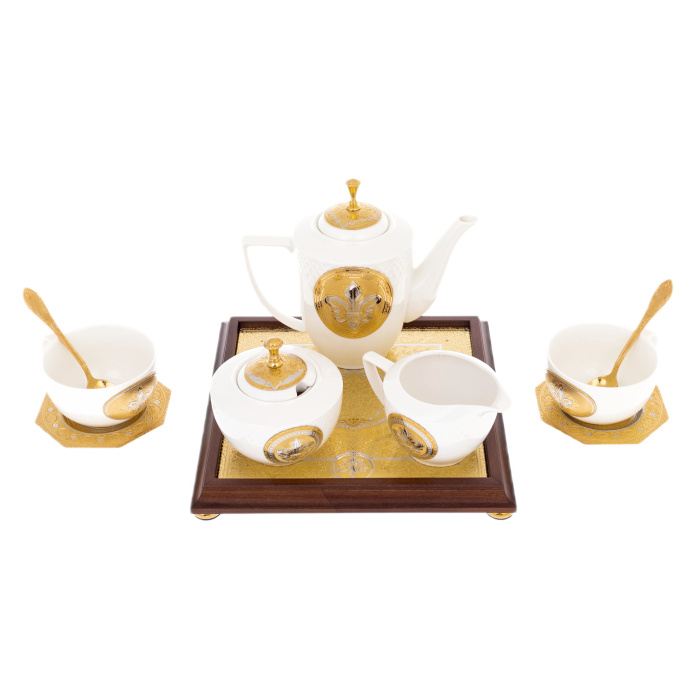 Центральным акцентом выступает квадратная подставка в раме из тёмного дерева, украшенная пышным золотым панно. Орнамент, выстроенный в строгой симметрии, задаёт эстетический ритм всему комплекту: тонкие переплетения линий, крошечные розетки, сияющие узоры, создававшиеся методом глубокой гравировки, формируют единое художественное пространство, в котором каждый предмет воспринимается частью большой имперской истории. Сочетание белоснежной гладкой поверхности фарфора, тёплого мерцания золота и насыщенной древесной фактуры превращает набор в изысканный декоративный ансамбль.