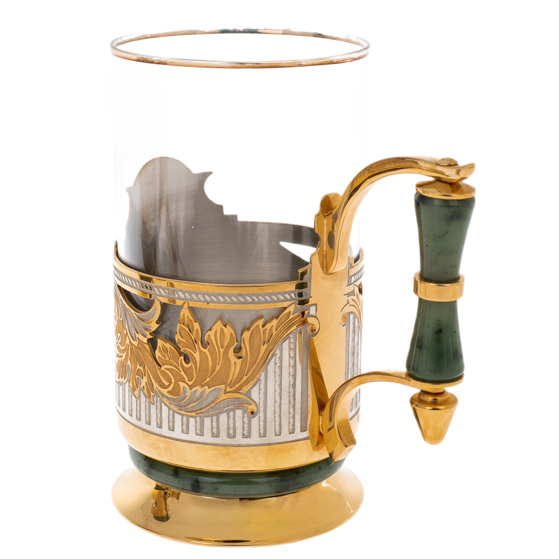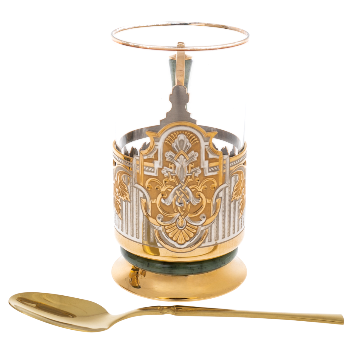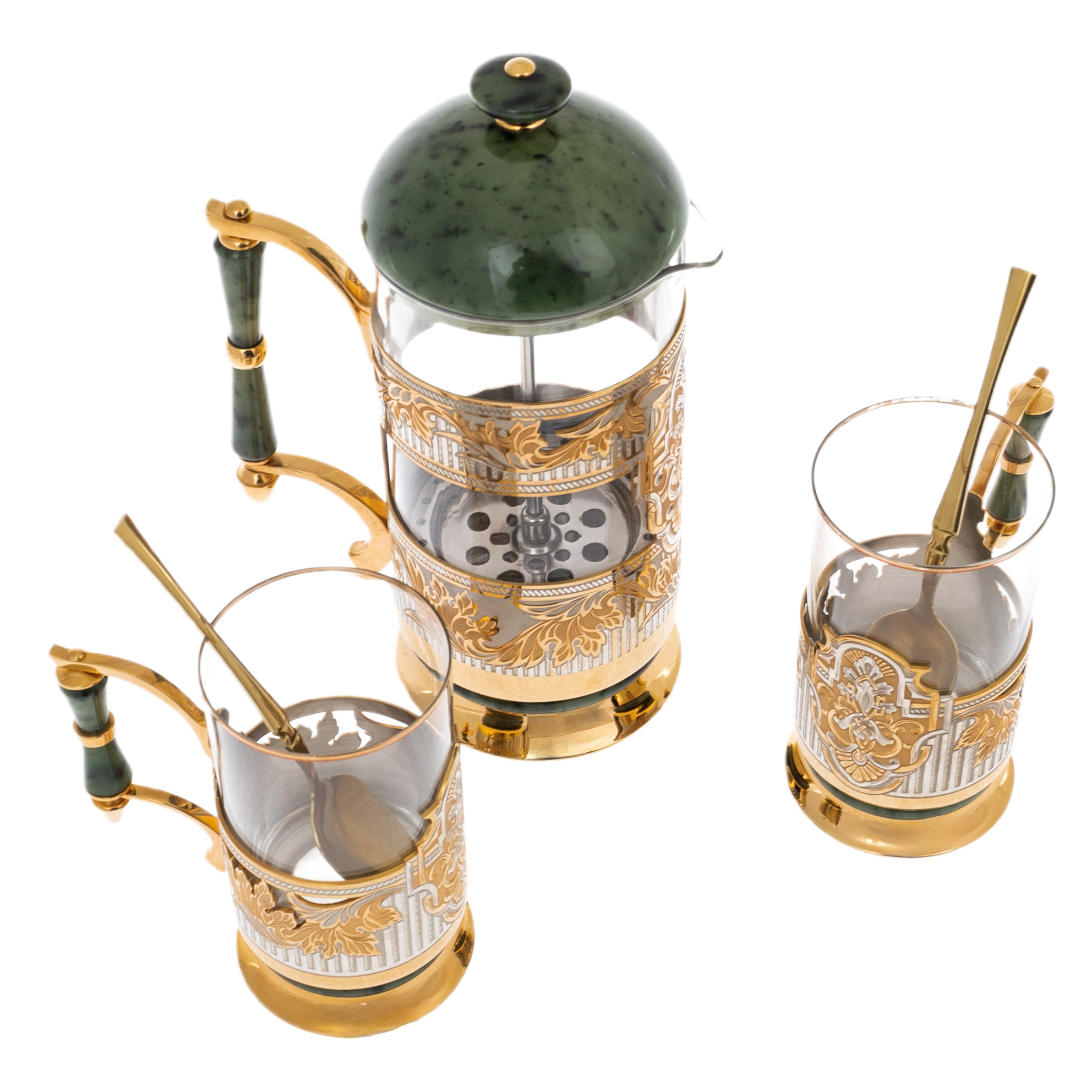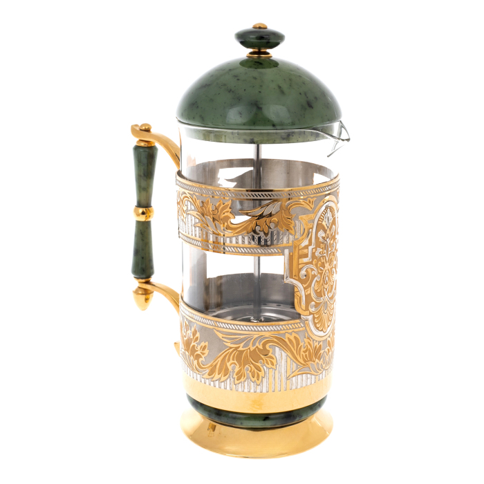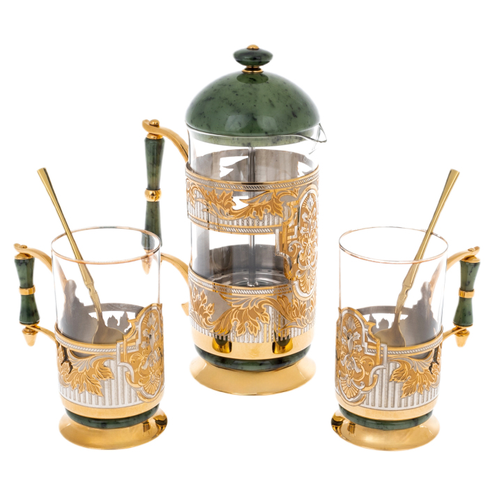 В композиции изделия соединены благородные материалы: сияющий металл с позолотой, изумрудный нефрит и прозрачное стекло. Каждая деталь — от тонких орнаментов до плавных линий ручек — несёт в себе идею торжества красоты и порядка. Глубокий зелёный цвет камня символизирует мудрость и спокойствие, а позолота подчеркивает статус и утончённость вкуса.