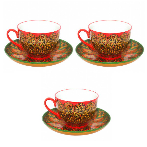 Комплект изготовлен в полном соответствии с традиционной хохломской технологией золочения, фарфоровая основа изготавливается на Дулевском фарфоровом заводе. Имеет авторскую роспись в технике фонового письма. Роспись «Ананас». Лаковое покрытие и многократный высокотемпературный обжиг делает изделие влагозащищенным и износоустойчивым. Все применяемые при производстве материалы натуральны и экологичны. Комплект предназначен для холодных и горячих напитков, а также служит элементом сервировки стола. На каждом изделии имеется подпись автора росписи.