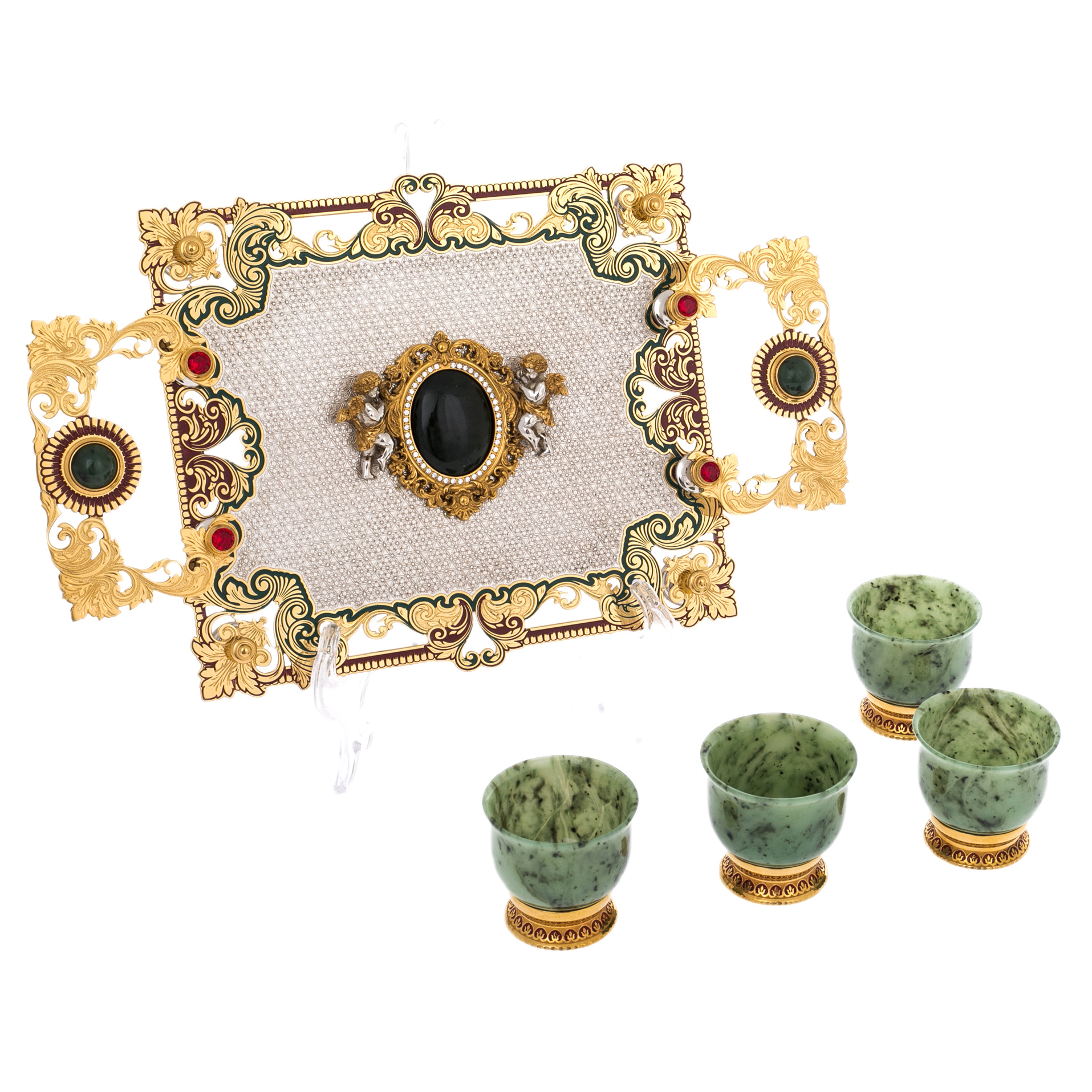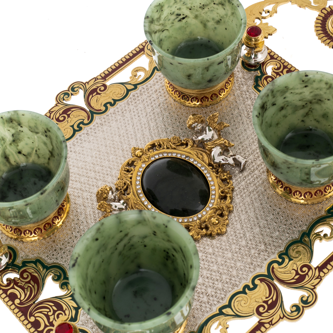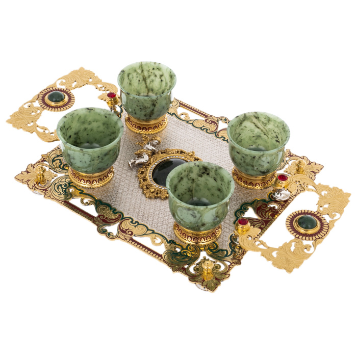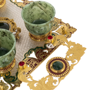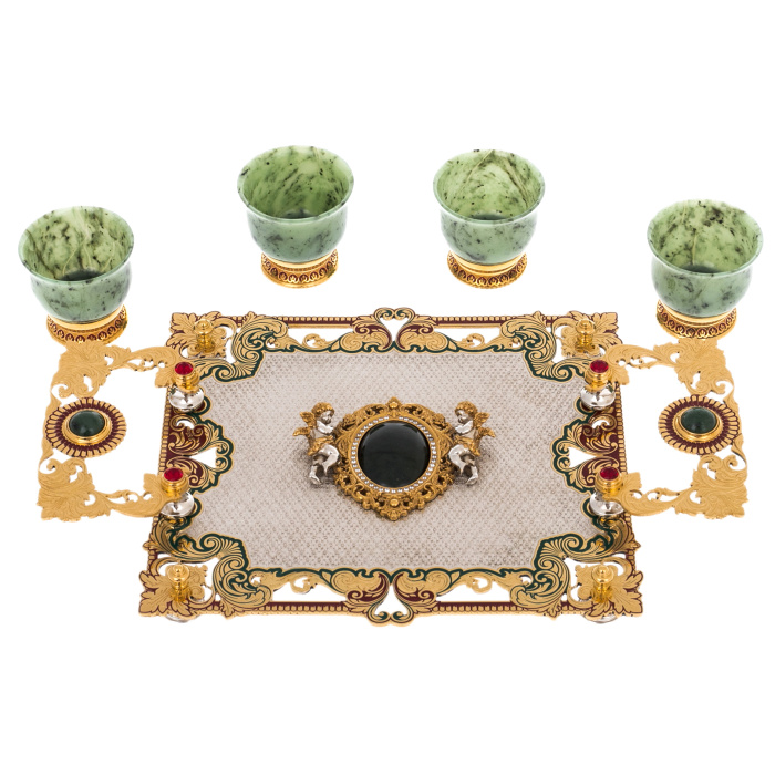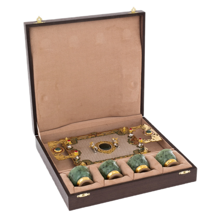 Этот набор пиал представляет собой изысканную композицию из нефрита, золочёной стали и декоративных вставок, созданную в лучших традициях златоустовского художественного металла. Центральное место занимает прямоугольная подставка, оформленная в технике тончайшей гравировки и украшенная богатым орнаментом, выполненным в зелёной, бордовой и золотой гамме. По углам размещены миниатюрные фигурки ангелов, отлитые из серебристого металла и выделенные позолочёнными деталями; их пластика придаёт предмету камерную торжественность. Сердцевина композиции выделена круглым медальоном глубокого тёмного оттенка, обрамлённым золочёным узором, формирующим ощущение драгоценной оправы.