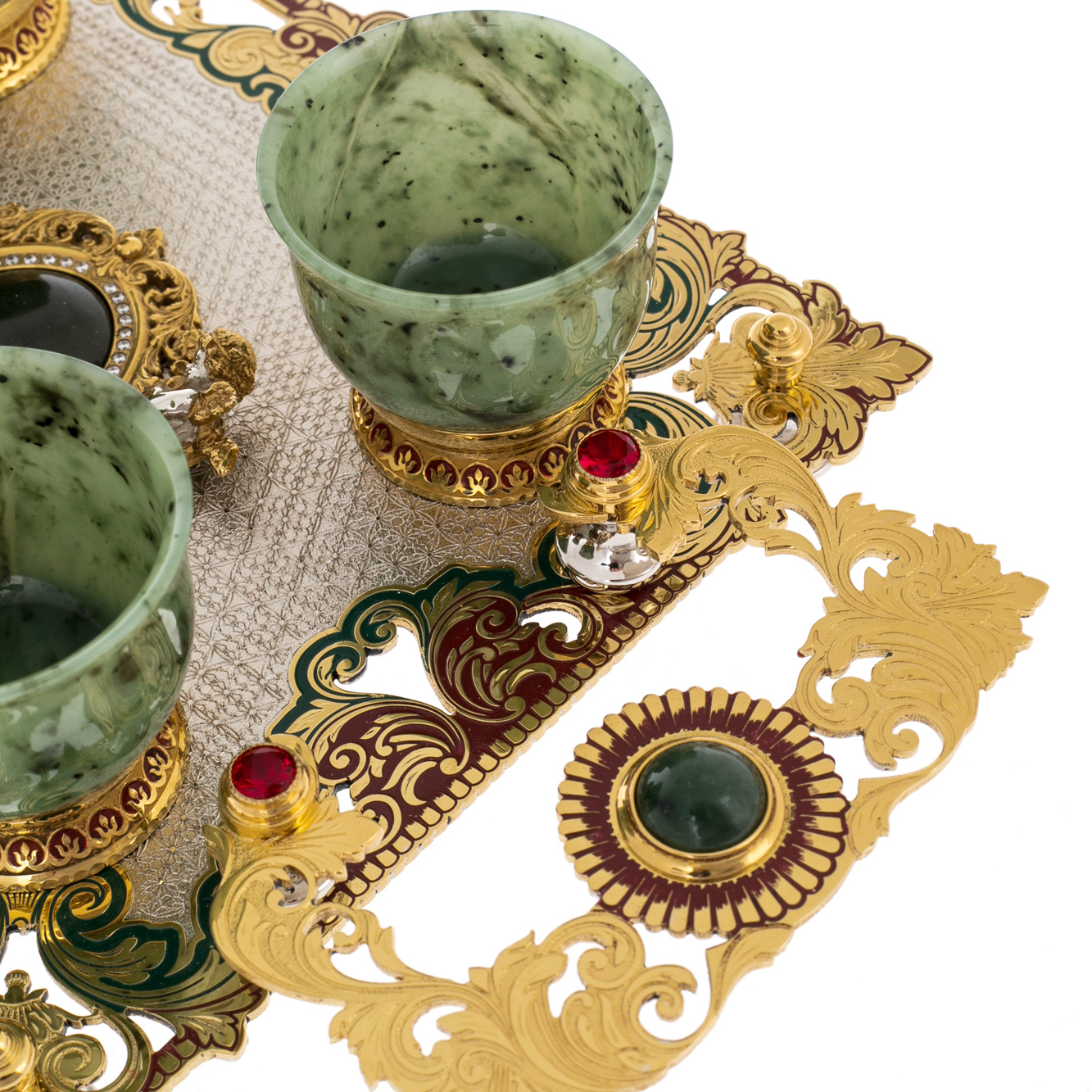 Пиалы выточены из цельного куска натурального нефрита, обладающего живой структурой с включениями тёмных прожилок. Каждый сосуд плавно отполирован до плотного сатинового блеска и установлен на позолоченную ножку с ажурным пояском, создающим переход от холодного камня к тёплому металлу. Элементы подставки дополнены крупными круглыми вставками, перекликающимися по цвету с пиалами и подчёркивающими единство набора. Отдельные акценты сформированы винно-красными кабошонами в золочёных оправах, усиливающими праздничное впечатление.
