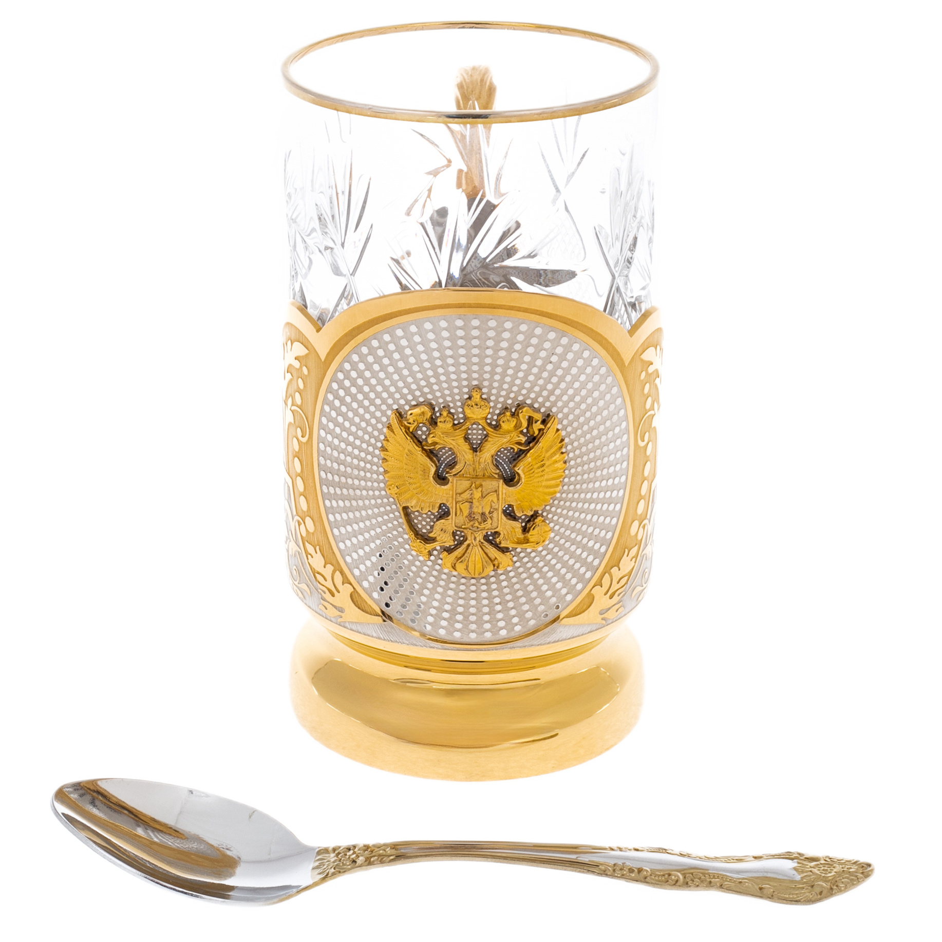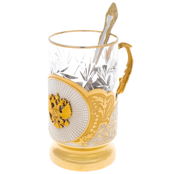 Изготовленный из латуни с никелевым и золотым покрытием, он украшен тончайшей гравировкой и барельефом двуглавого орла — символа державности и силы. Грани хрустального стакана преломляют свет, заставляя узоры блистать, словно отблески истории и побед. Ложка с позолоченной рукоятью завершает ансамбль, превращая чаепитие в торжественный ритуал.