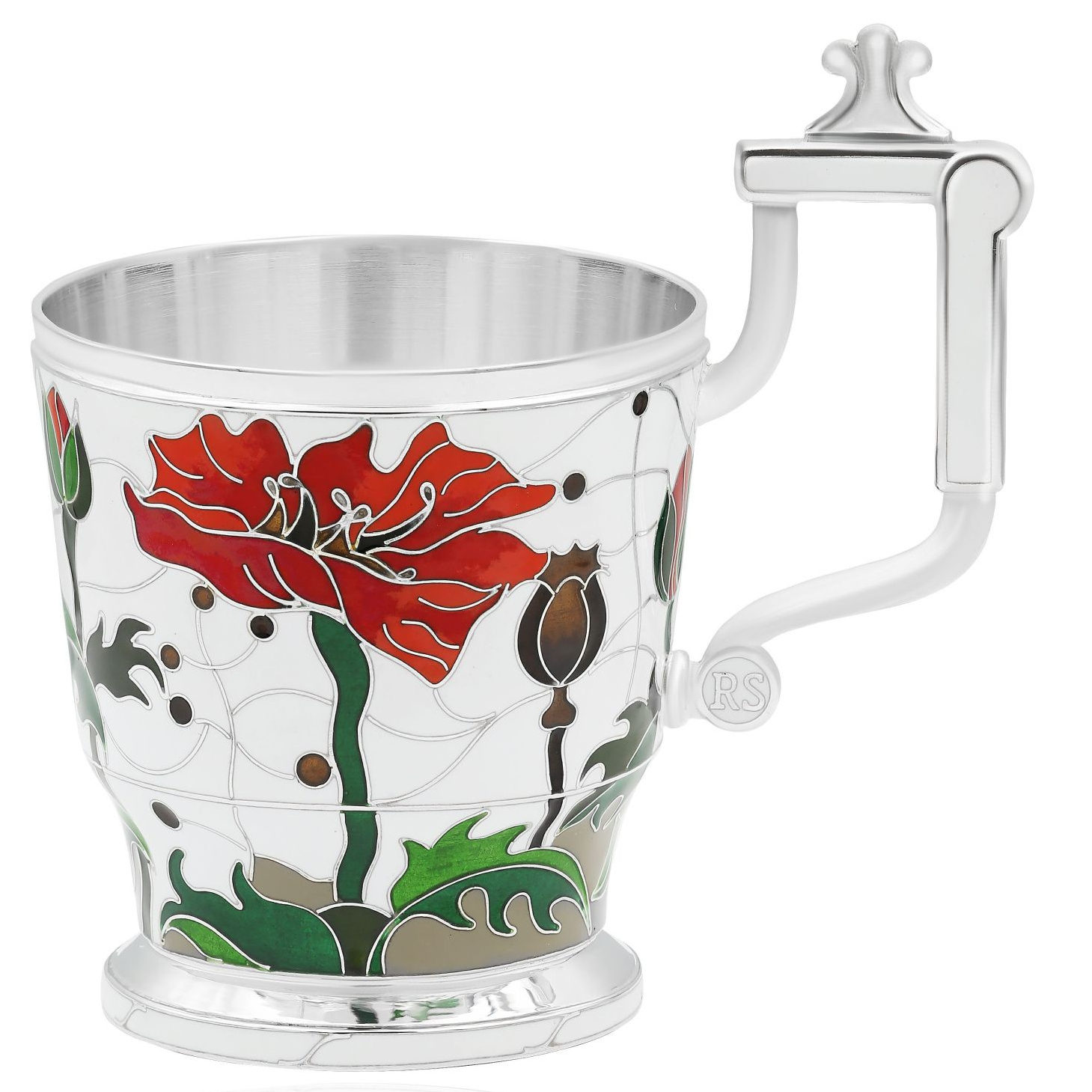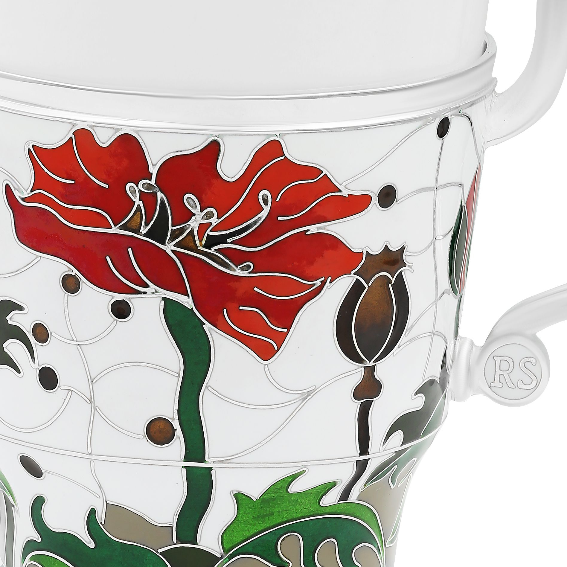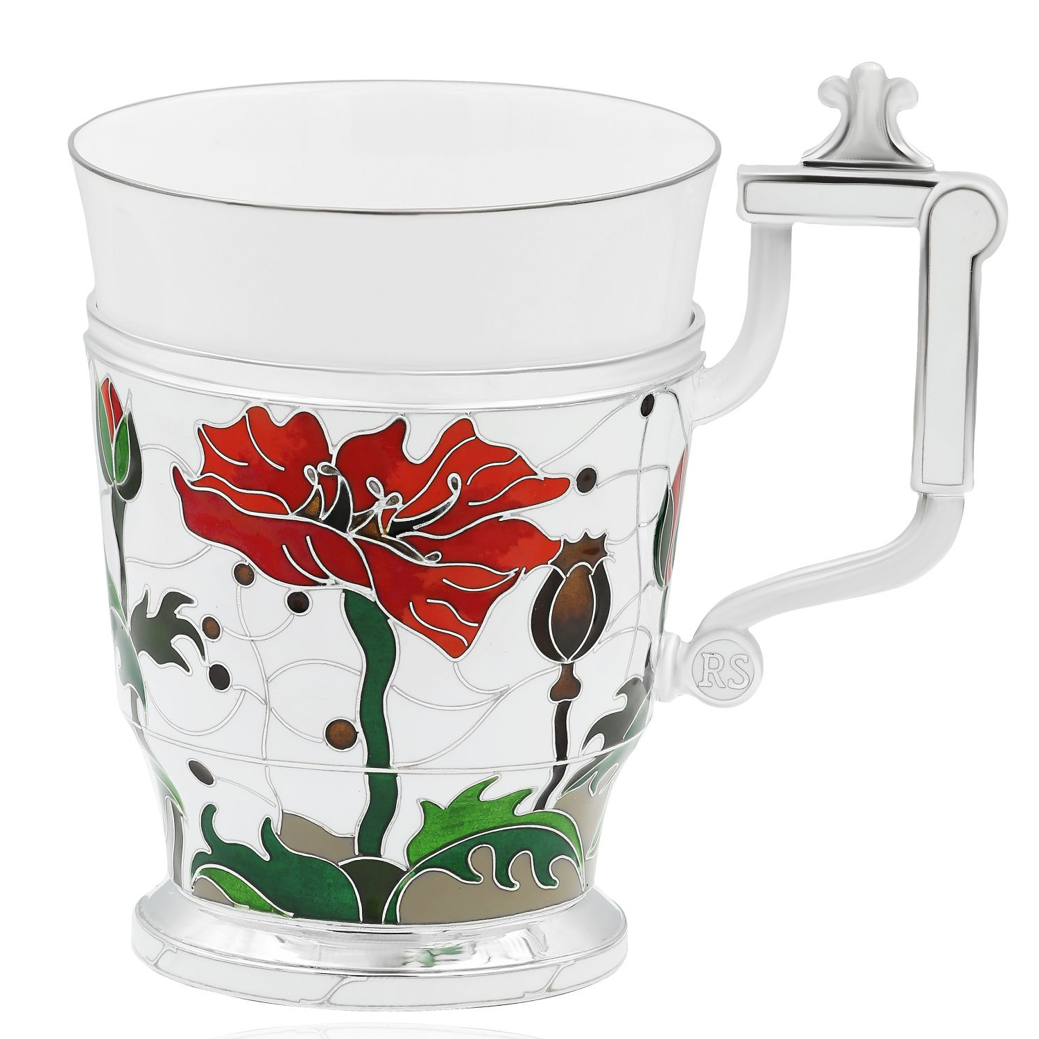 Подстаканник «Маки» из серебра с эмалью — это выразительное соединение декоративной строгости и живописной лёгкости, воплощённое в драгоценном металле. Ярко-алый мак раскрывает лепестки на фоне сияющей эмалевой поверхности, создавая эффект цветка, запечатлённого в момент полного расцвета. Его окружает композиция из бутонов, стеблей и коробочек, выполненных в глубоких зелёных, оливковых и чёрных тонах. Геометричная ручка с фирменной отметкой «RS» придаёт изделию нотку современности, уравновешивая экспрессию природного мотива. В основе формы — классическая русская школа художественного металла, дополненная утончённым дизайнерским акцентом.