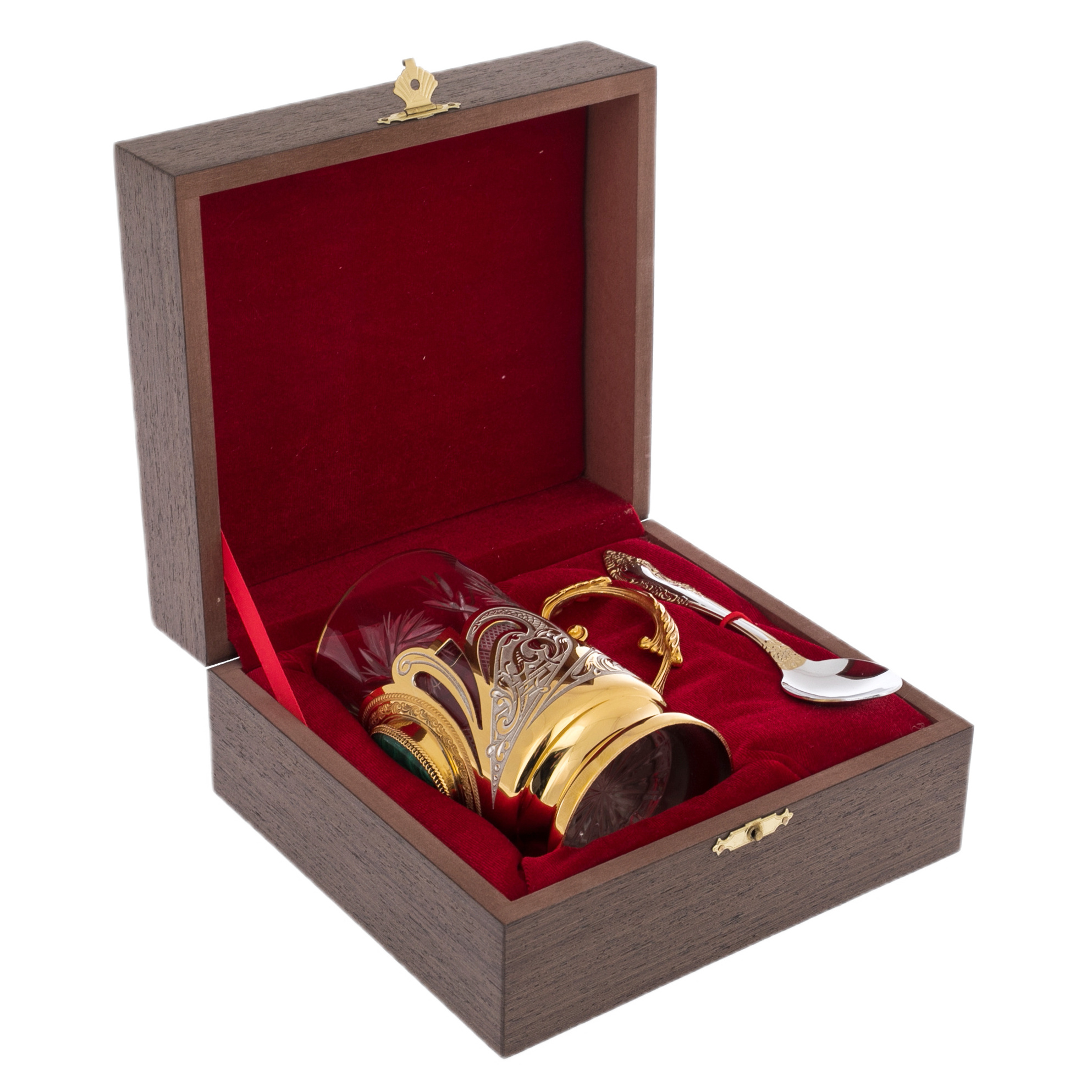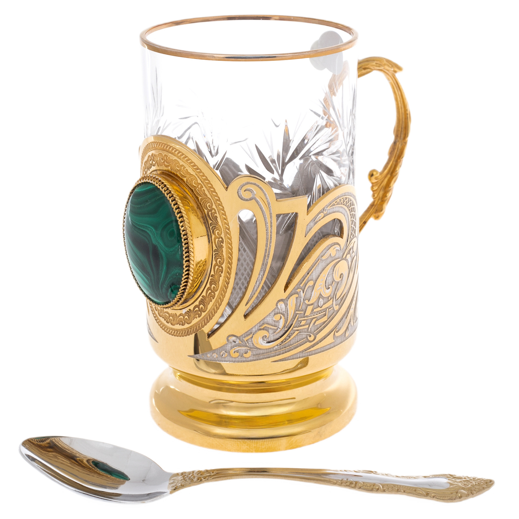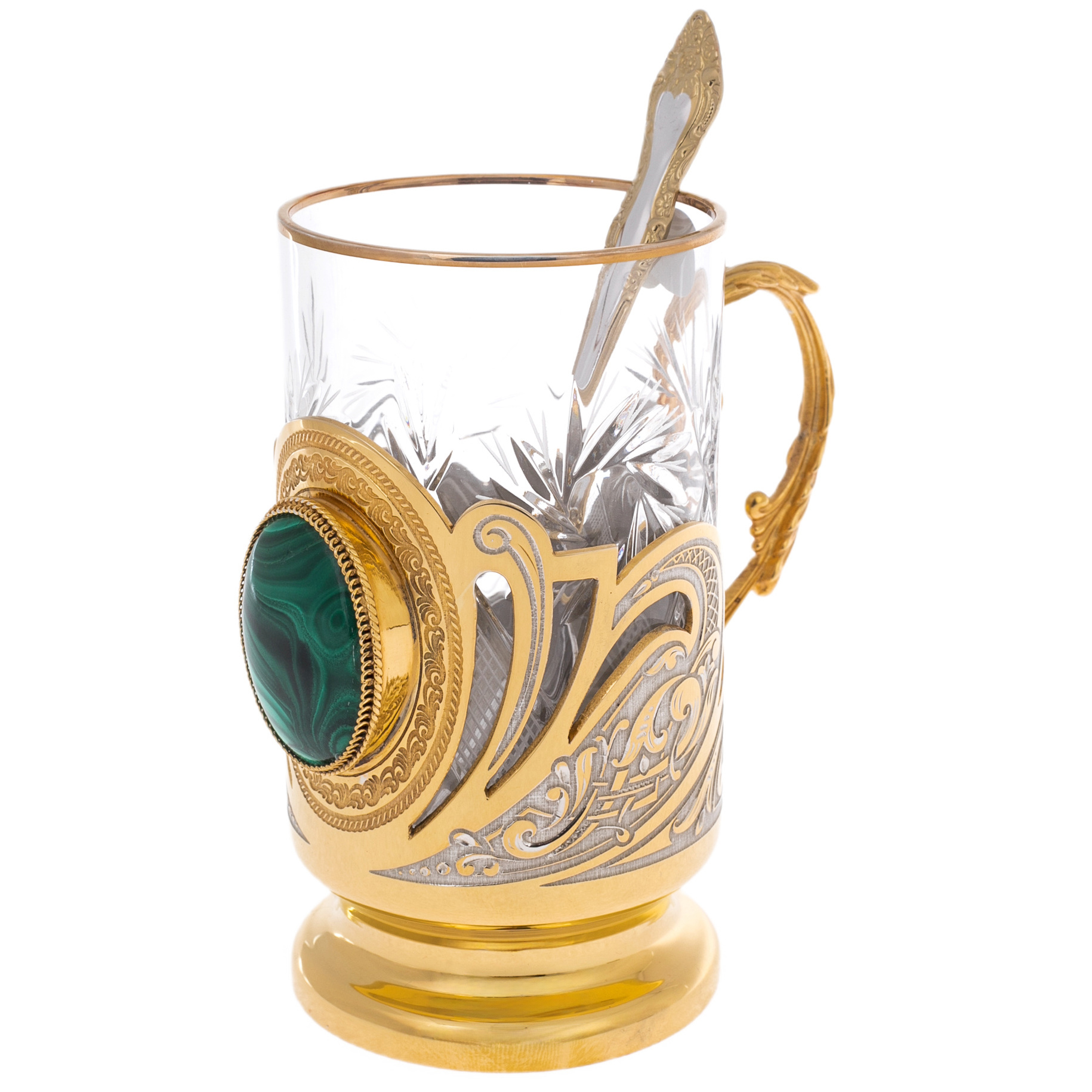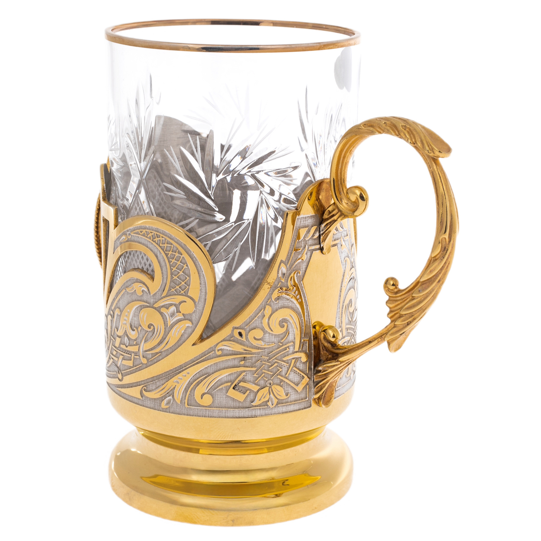 Ручка изделия — не просто элемент формы, а мощный акцент, исполненный достоинства. Её плавные изгибы и уверенное сияние золотого покрытия создают ощущение торжества, достойного победителя, каждый жест которого наполнен уверенностью. Изящная ложечка, сопровождающая подстаканник, завершает композицию, подобно последнему аккорду симфонии.