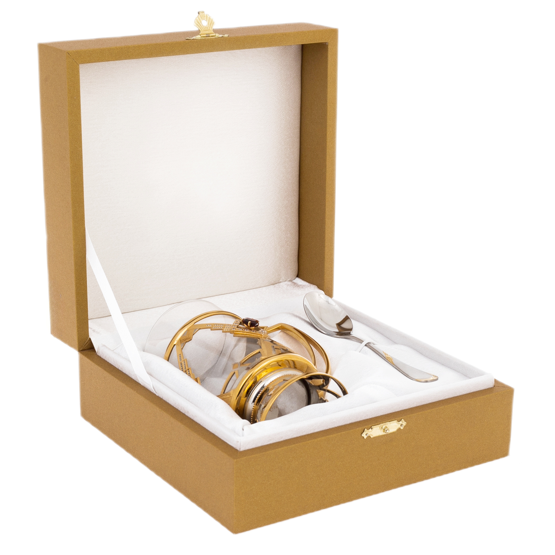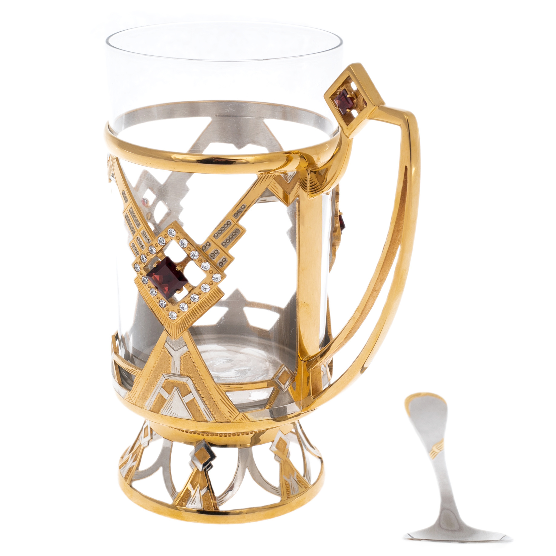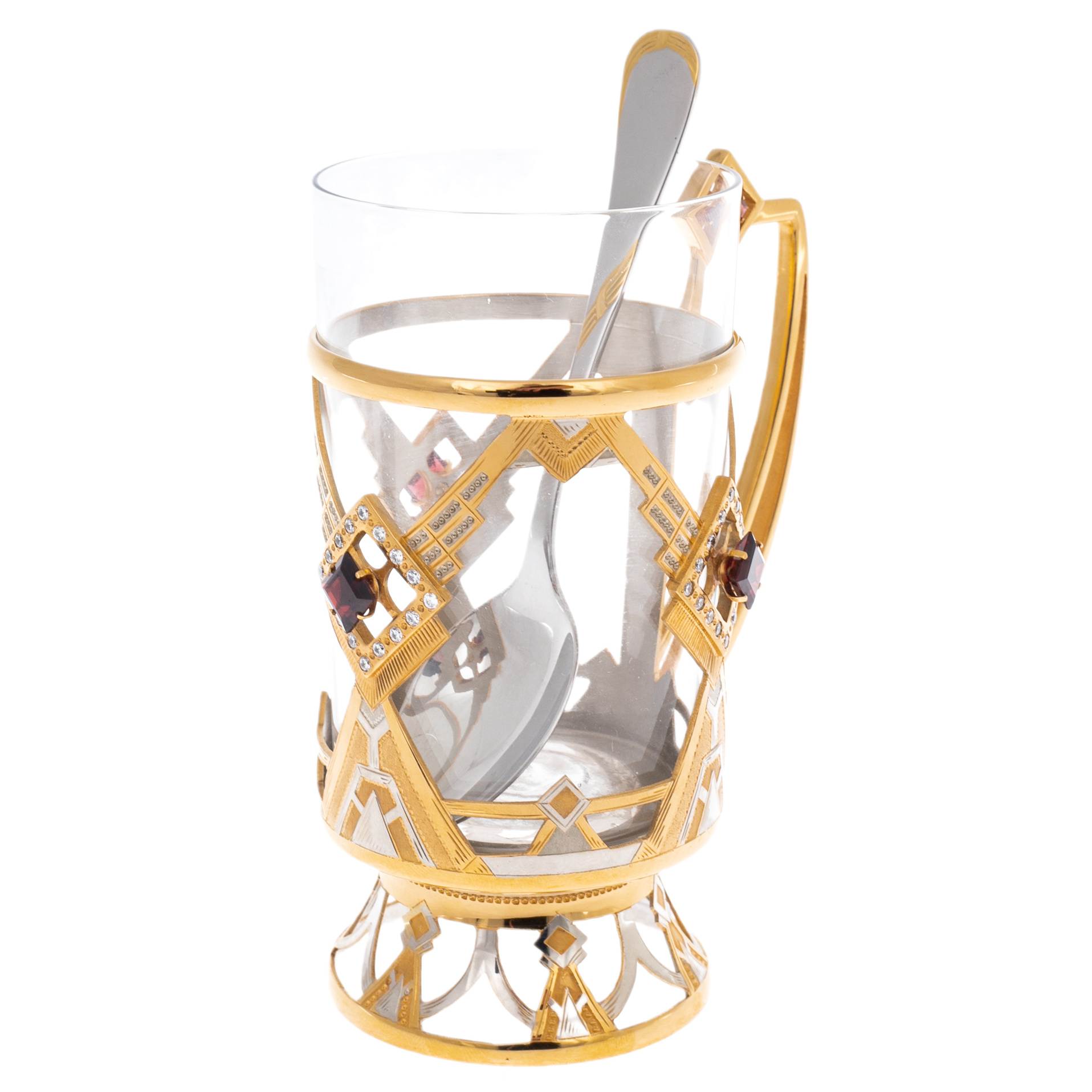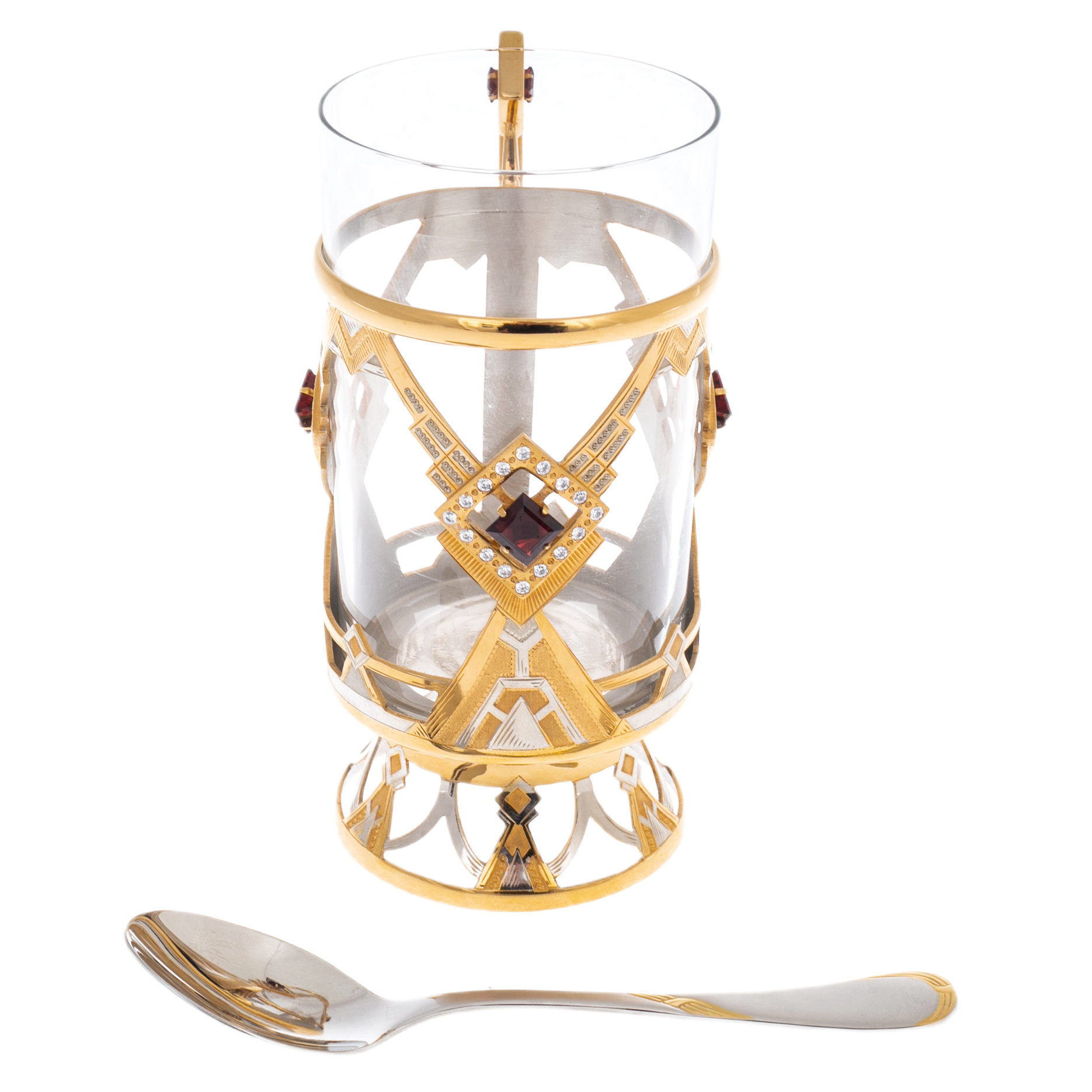 Каждый ромб наполнен глубиной: в центре — тёмно-вишнёвый кристалл, заключённый в раму из сияющих фианитов. Контраст между гладкостью стеклянного стакана и мерцающей поверхностью декоративной оправы создаёт визуальный ритм, в котором классика и ар-деко сливаются в единое художественное целое. Ручка отлита в едином с корпусом стиле — изящная, но уверенная по форме, она подчёркивает практичность изделия без ущерба для его эстетической выразительности. Композицию завершает металлическая ложка, отшлифованная до зеркального блеска и подобранная в тон.