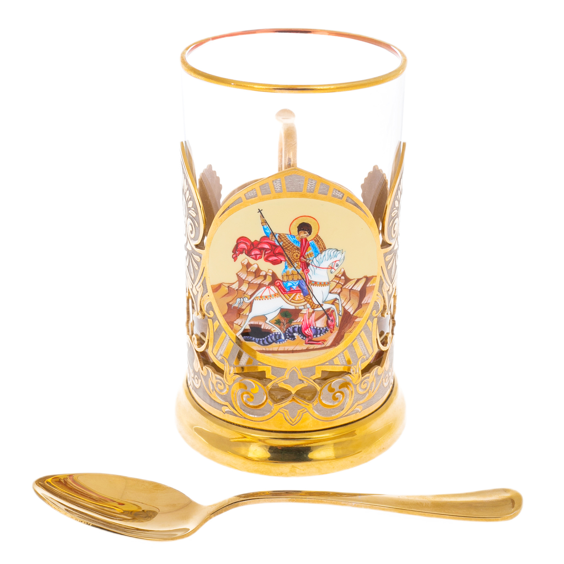 Подстаканник "Георгий Победоносец" с эмалями — изящный предмет, соединяющий светскую утончённость с сакральным символизмом. В центре композиции — цветное изображение святого в момент подвига: всадник в алом плаще на белом коне поражает змея копьём, утверждая силу духа и защиту от зла. Рельефный узор, покрывающий металлическую оправу, выполнен в виде стилизованных лепестков и растительных мотивов, перекликающихся с формами старинных витражей. Латунная ложка и прозрачный стакан, обрамлённый резной позолоченной конструкцией с удобной изогнутой ручкой, завершают ансамбль, создавая ощущение полноты и благородства.