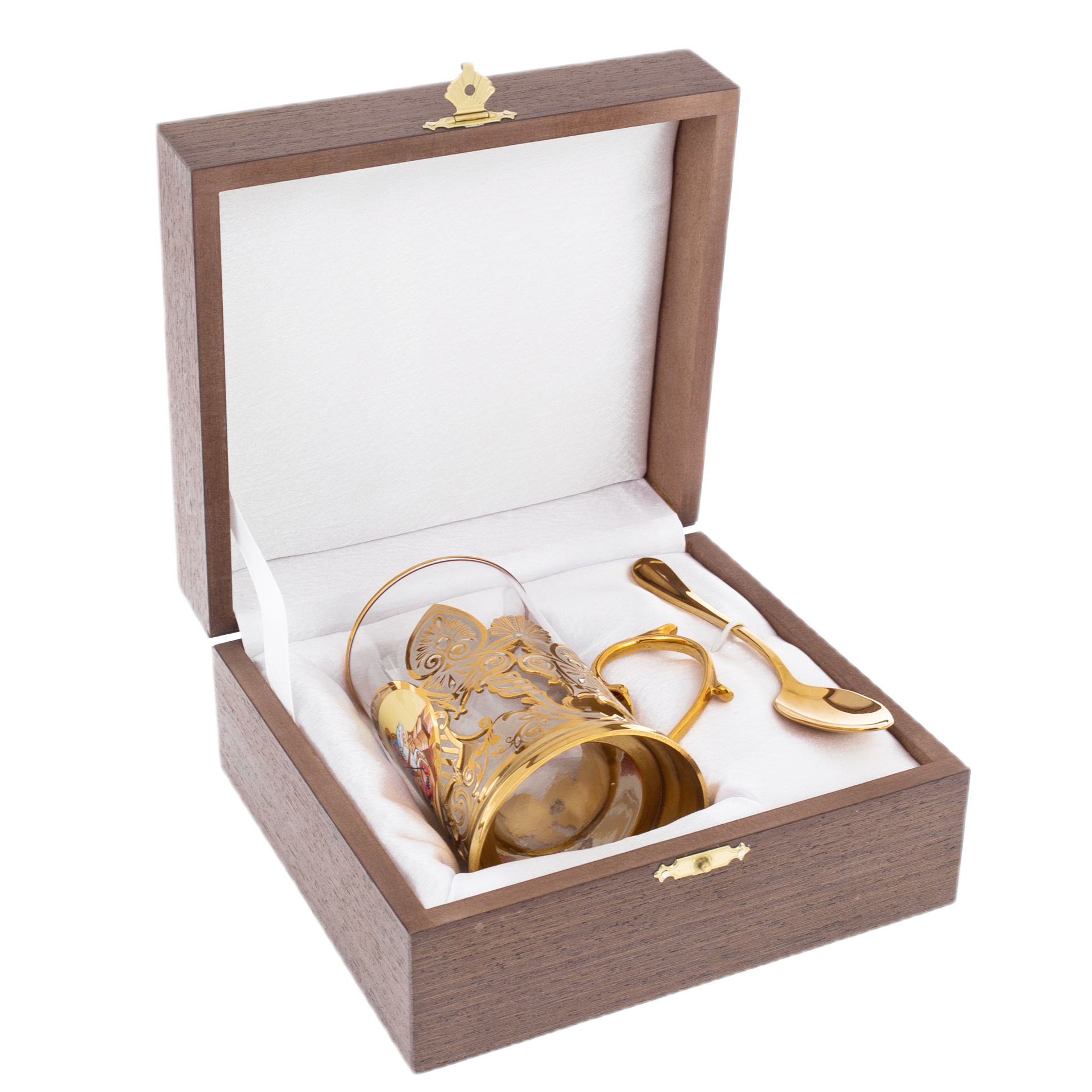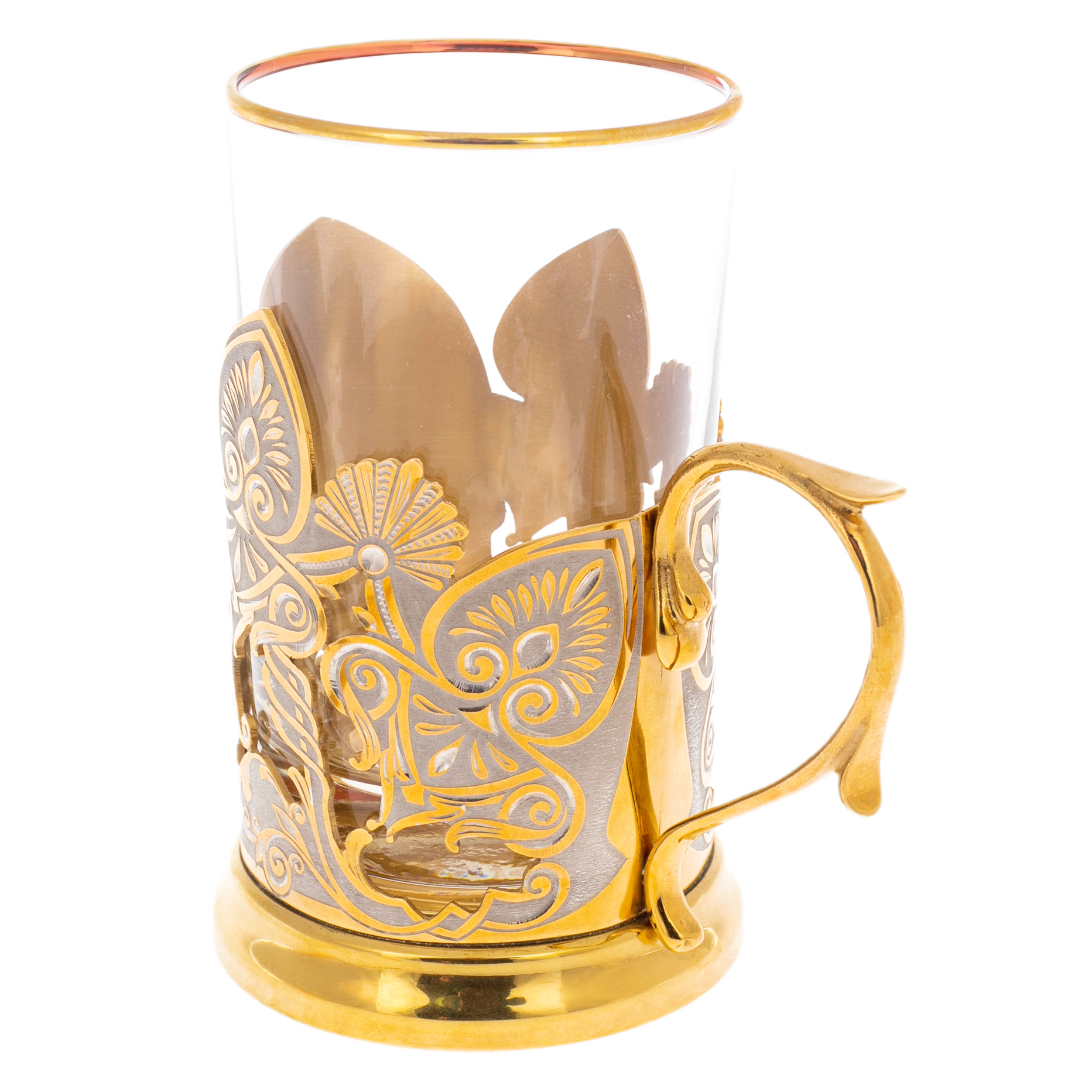 Мастера из Златоуста использовали сложнейшую технику художественного травления по металлу, дополненного гальваническим золочением и инкрустацией цветной эмалью. Каждый штрих нанесён вручную, с тонкостью, присущей старинной гравюре. Металл не просто сверкает — он дышит, играя тёплым блеском золота и глубиной серебристо-серых вставок. Образ святого не приклеен, а влит в структуру подстаканника, обрамлённого аркой, напоминающей о византийской архитектуре и церковных витражах. Золочёный кант на ободке стеклянного стакана завершает образ, задавая ритм и подчёркивая симметрию.