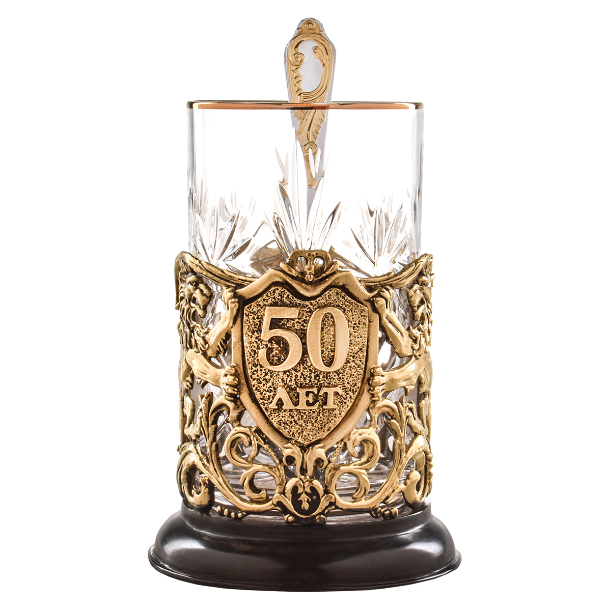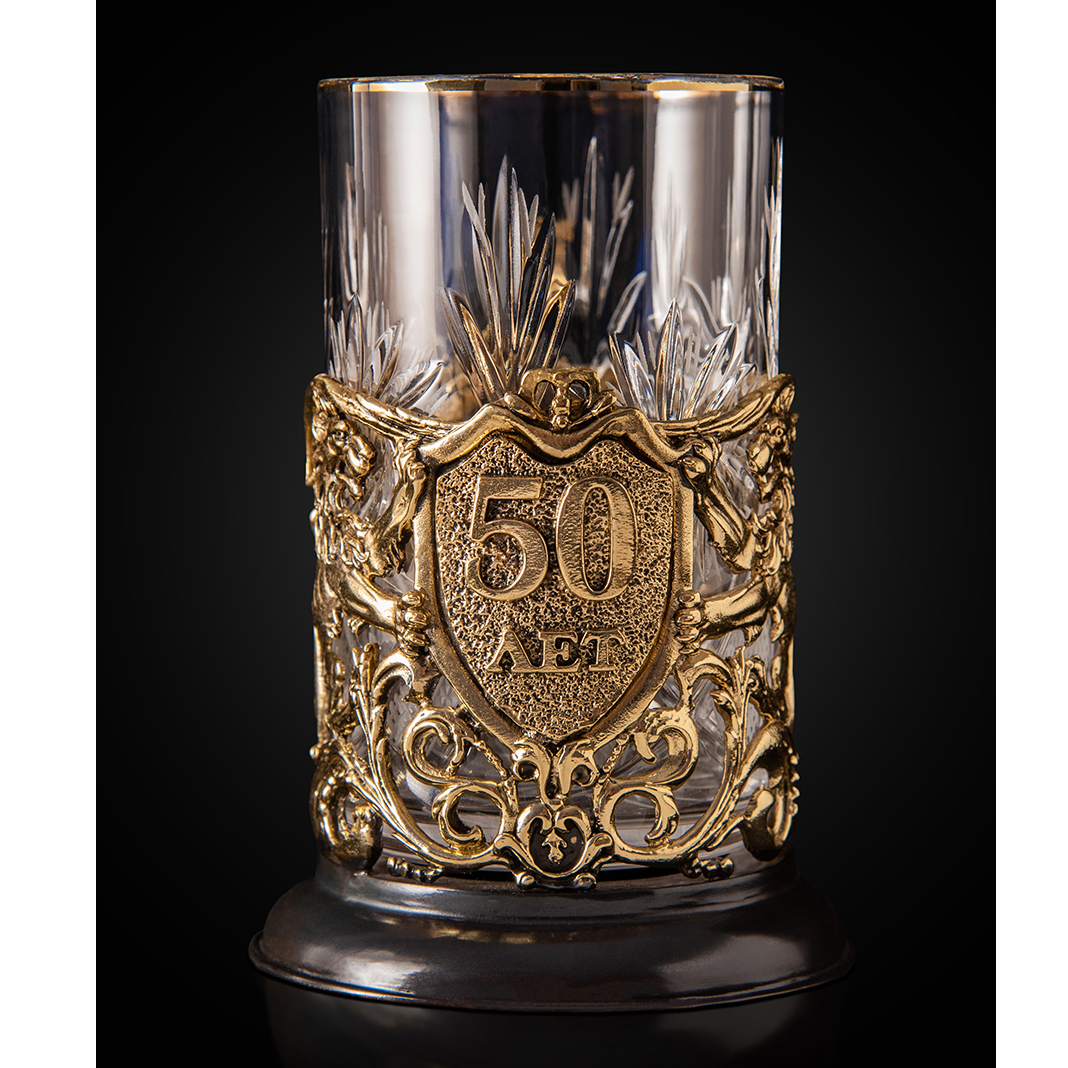 Юбилейный подстаканник «50 лет», выполненный из патинированной латуни и хрусталя, — предмет, наделённый не только эстетикой, но и глубоким символическим звучанием. В центре композиции — массивный щит с горельефной надписью «50 лет», обрамлённый двумя геральдическими львами, воплощающими силу, мужество и благородство. Орнаментальная решётка, поддерживающая стеклянную вставку, украшена завитками в стиле позднего барокко, благодаря которым композиция выглядит завершённой и торжественной. Хрусталь вручную огранён по радиальной схеме, создающей эффект звезды, рассыпающей свет из центра.