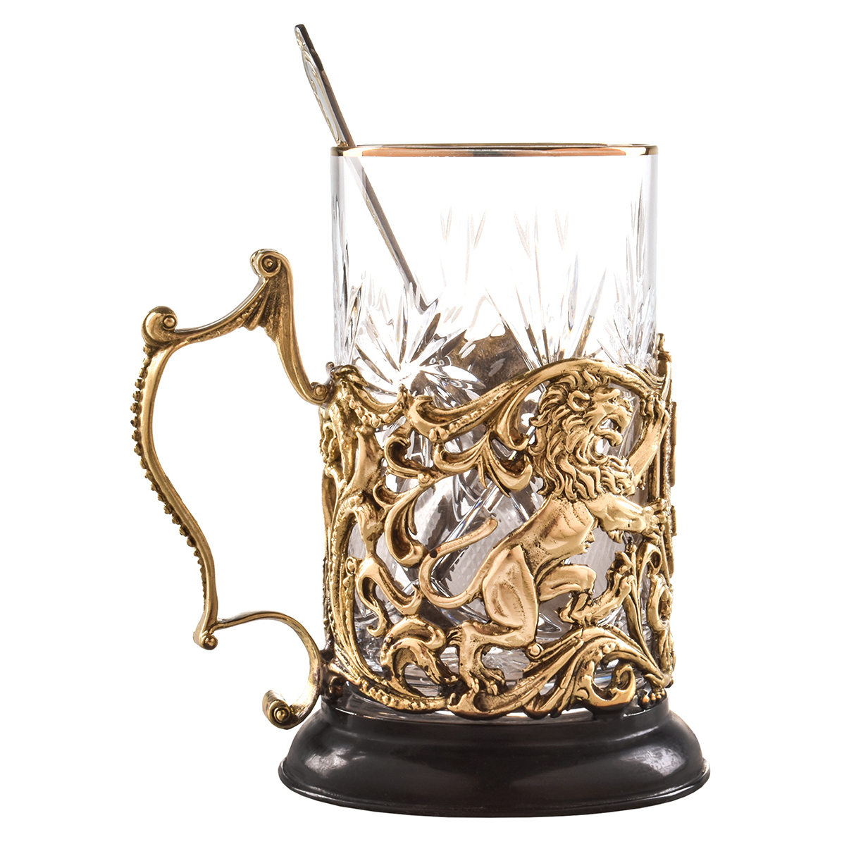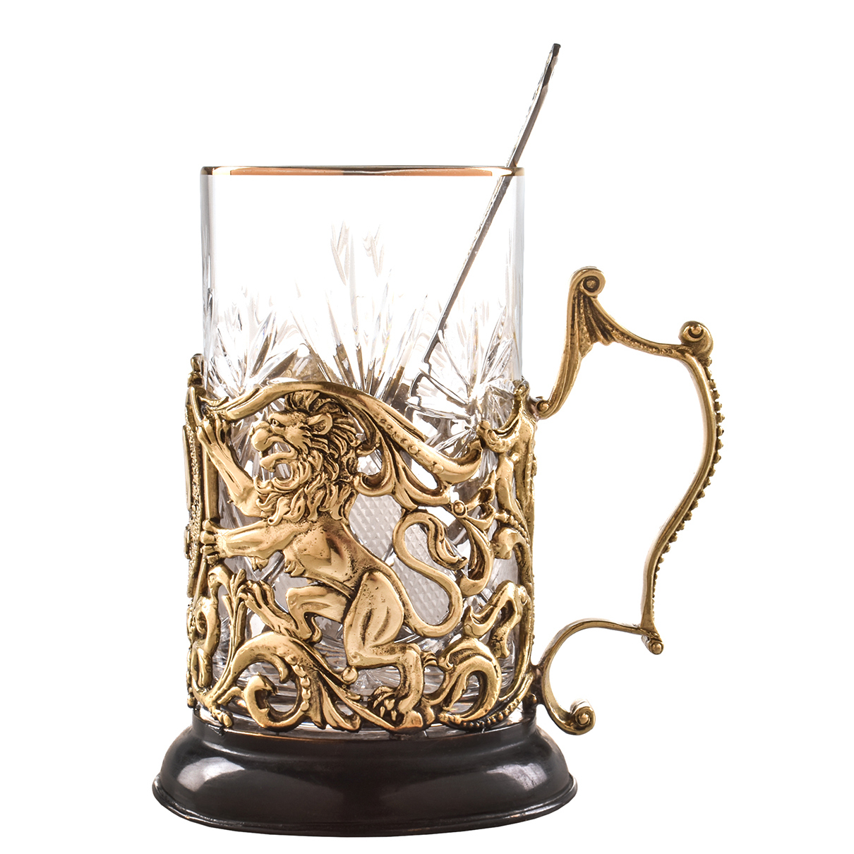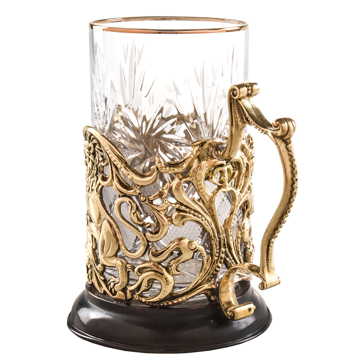 Металлические элементы литы по старинной технологии, отшлифованы и патинированы вручную. Поверхность латуни получила мягкое, благородное сияние, подчёркивающее глубину форм и плавность линий. Изогнутая ручка с изысканной текстурой дополняет образ, делая подстаканник не только удобным, но и выразительным в каждом своём элементе. Внутри — тяжёлый гранёный стакан с золотистой каёмкой, идеально сочетающейся с оттенком металла. Основание изготовлено из тёмного материала, визуально якорящего всю композицию и придающего ей устойчивость и вес.