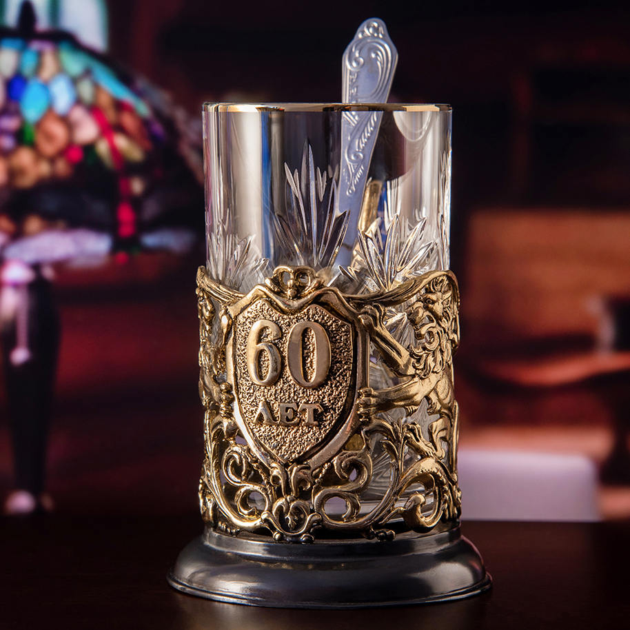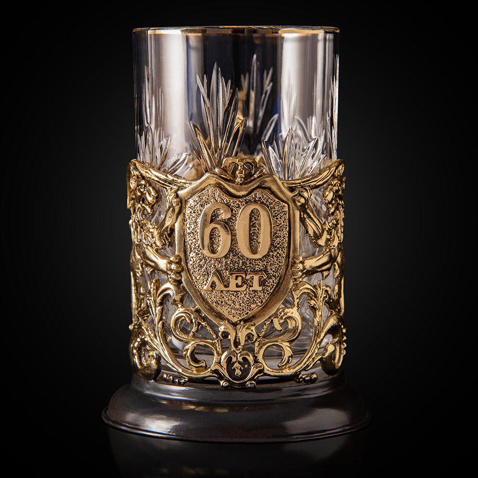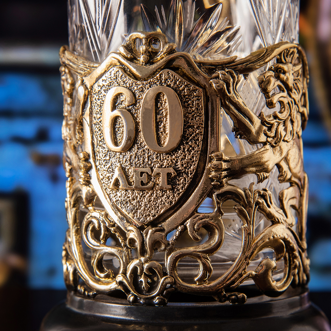 Юбилейный подстаканник «60 лет», выполненный из патинированной латуни и хрусталя, — предмет, наделённый не только эстетикой, но и глубоким символическим звучанием. В центре композиции — массивный щит с горельефной надписью «60 лет», обрамлённый двумя геральдическими львами, воплощающими силу, мужество и благородство. Орнаментальная решётка, поддерживающая стеклянную вставку, украшена завитками в стиле позднего барокко, благодаря которым композиция выглядит завершённой и торжественной. Хрусталь вручную огранён по радиальной схеме, создающей эффект звезды, рассыпающей свет из центра.