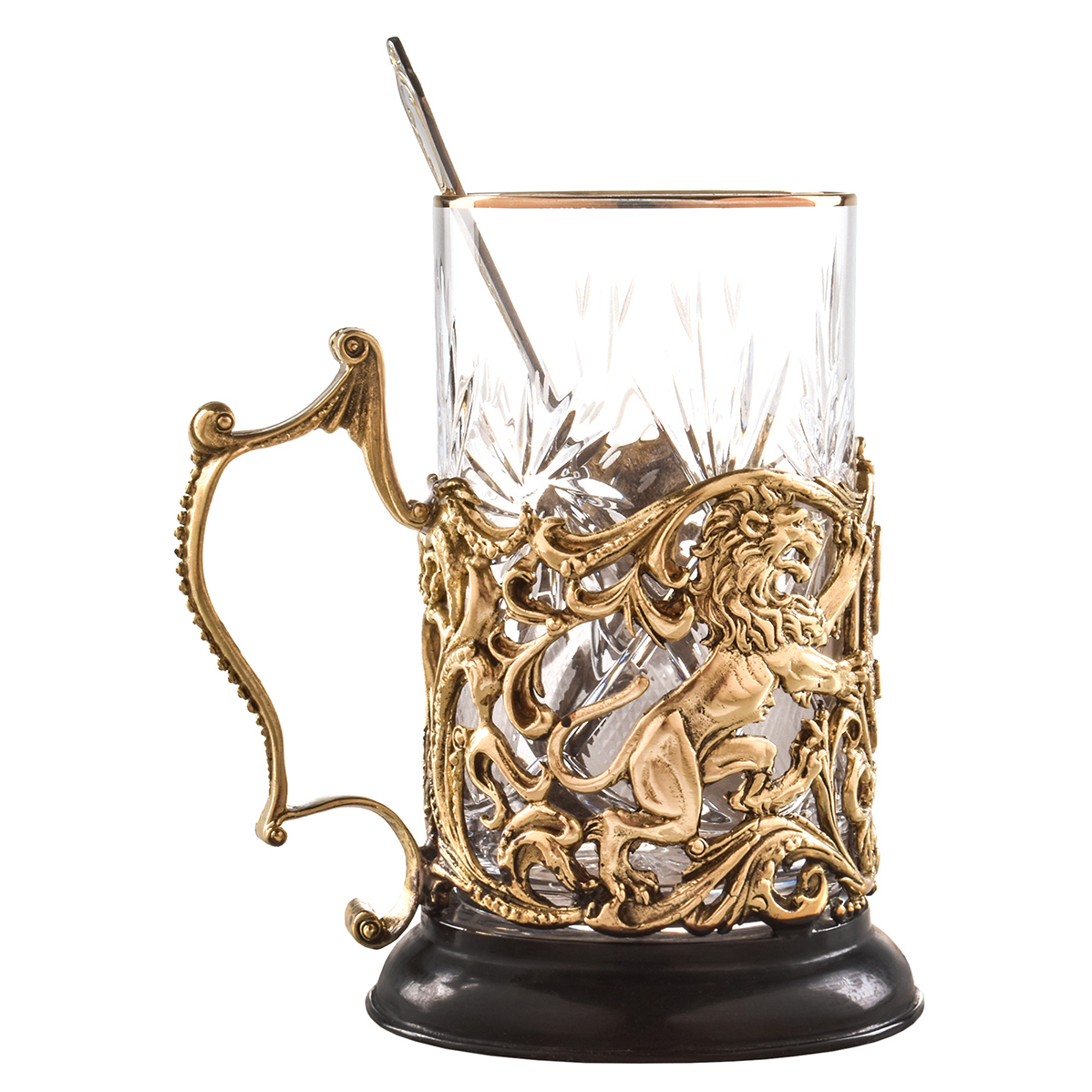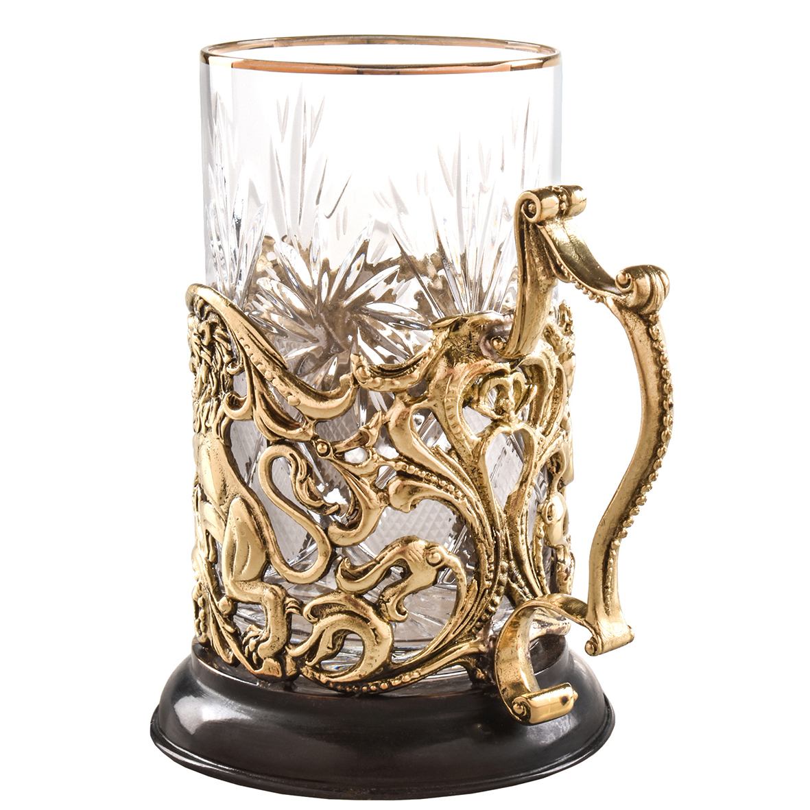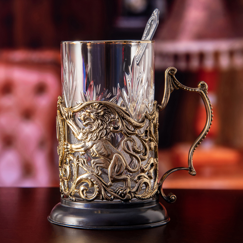 Металлические элементы литы по старинной технологии, отшлифованы и патинированы вручную. Поверхность латуни получила мягкое, благородное сияние, подчёркивающее глубину форм и плавность линий. Изогнутая ручка с изысканной текстурой дополняет образ, делая подстаканник не только удобным, но и выразительным в каждом своём элементе. Внутри — тяжёлый гранёный стакан с золотистой каёмкой, идеально сочетающейся с оттенком металла. Основание изготовлено из тёмного материала, визуально якорящего всю композицию и придающего ей устойчивость и вес.