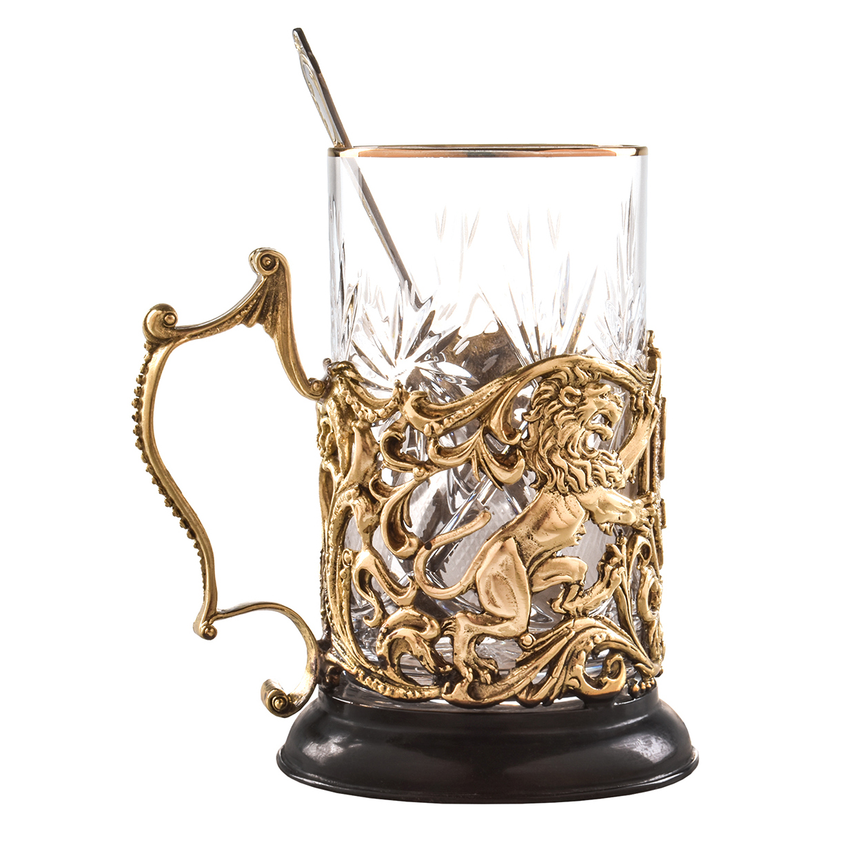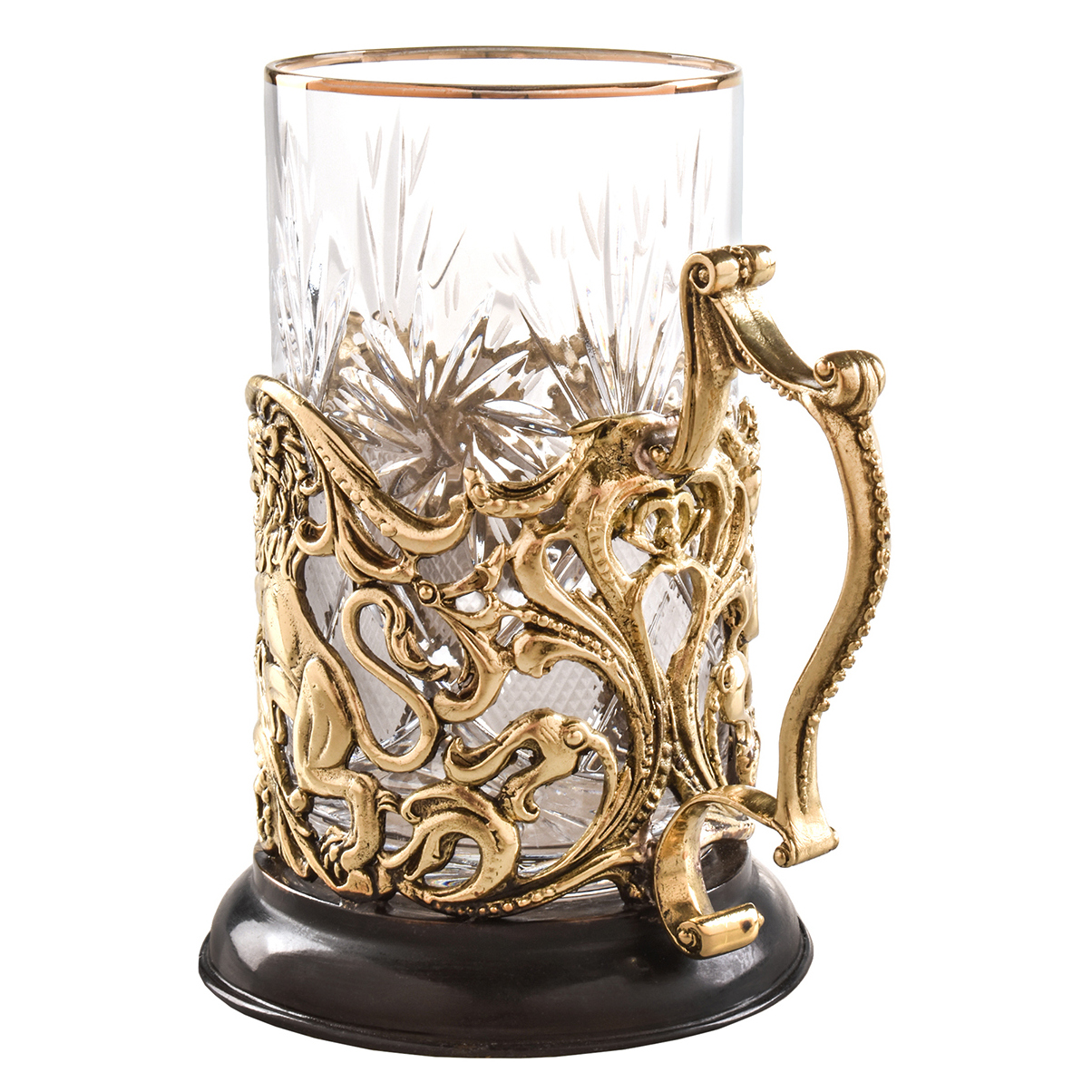 Металлические элементы литы по старинной технологии, отшлифованы и патинированы вручную. Поверхность латуни получила мягкое, благородное сияние, подчёркивающее глубину форм и плавность линий. Изогнутая ручка с изысканной текстурой дополняет образ, делая подстаканник не только удобным, но и выразительным в каждом своём элементе. Внутри — тяжёлый гранёный стакан с золотистой каёмкой, идеально сочетающейся с оттенком металла. Основание изготовлено из тёмного материала, визуально якорящего всю композицию и придающего ей устойчивость и вес.