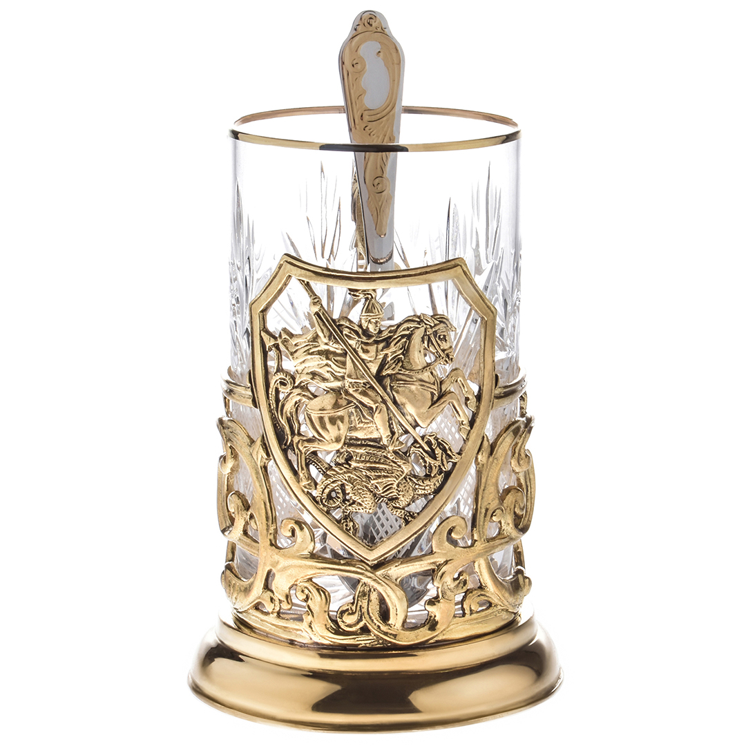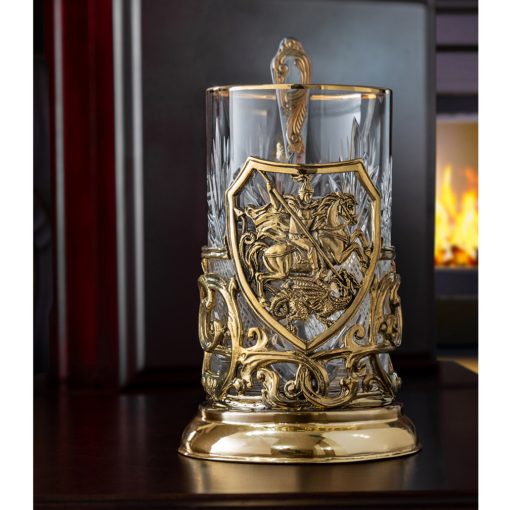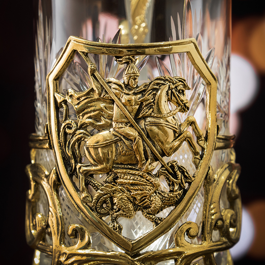 Подстаканник из патинированной латуни с образом святого Георгия Победоносца — предмет исключительного характера, предназначенный для тех, кто чтит силу духа, верность долгу и славу побед. Центральная часть композиции выполнена в виде щита, внутри которого — высокорельефная сцена: всадник, поражающий копьём змея. Динамика, объём и точность линий передают напряжение момента, в котором вершится справедливость. Вставка из огранённого хрусталя отражает свет множеством граней, добавляя сияния и подчёркивая скульптурную выразительность металлических элементов.