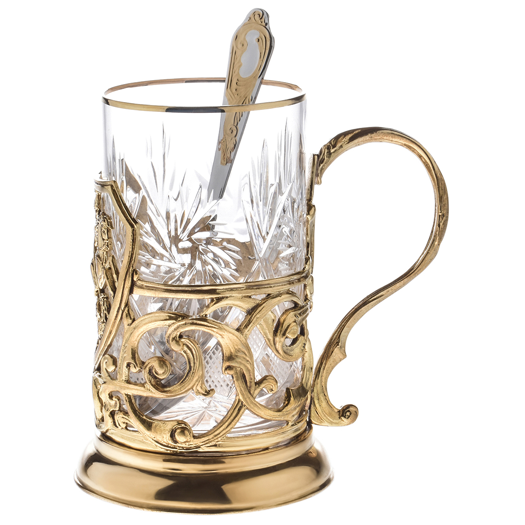 Латунное обрамление тщательно проработано вручную. Барочный растительный орнамент, плавно перетекающий по поверхности, объединяет основу, щит и ручку в единое художественное целое. Ручка изогнута с утончённой строгостью — без лишней декоративности, но с чёткой эстетикой старинного оружия. Хрустальный стакан украшен золотистой каймой по краю, рифмующейся с благородным блеском латуни. С ложкой в том же стиле композиция завершена и уравновешена, создавая ощущение полноценного ритуала.